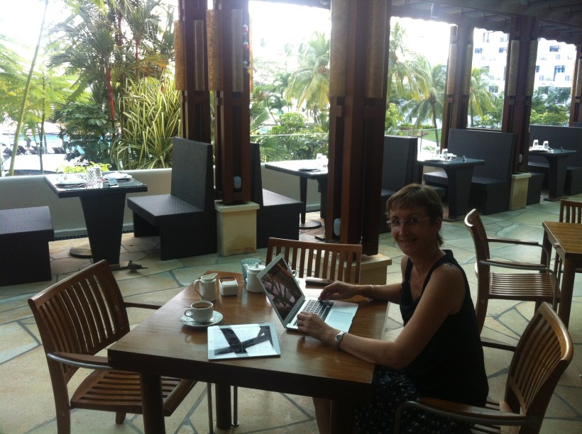 Journée studieuse. Yves termine son rapport. Isabelle envoie un mail à son réseau franco-belgo-suisse pour assurer la continuité des contacts; Orange va bloquer mon numéro. Je twitte déjà depuis une semaine et aujourd’hui c’est mon cours de formation « WordPress » pour lancer mon nouveau blog! Je retrouve mes réflexes de Vancouver d’il y a 9 ans. La chambre du Mövenpick offre un cadre de travail sérieux en début de journée; ensuite nous nous installons sur la terrasse du Rasa Sagri-La, nettement plus exotique et agréable, face à la piscine et à la mer.