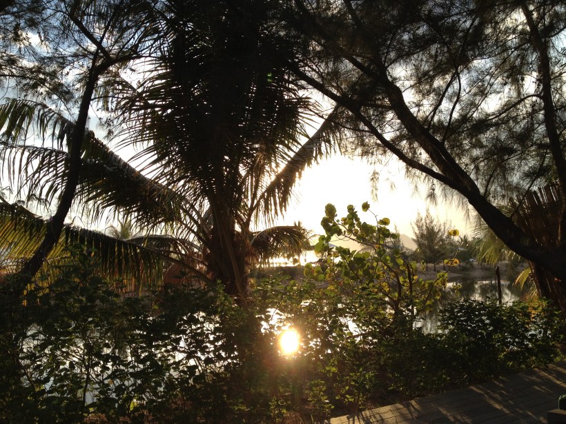 Soudain il quitte la route et descend vers la mer. Voilà, « nous y sommes enfin », me dis-je en sortant de la voiture, avec les lunettes toutes embuées! Nos valises disparaissent, un jus d’ananas frais succulent nous est servi, des hôtesses charmantes nous présentent deux formulaires à compléter, sur nos attentes durant le séjour. L’endroit est superbe en bordure de mer, avec les bananiers, les cocotiers, les palmiers.