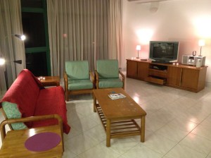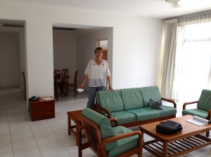 L’appartement est grand et très lumineux, meublé sans goût et sans recherche mais fonctionnel. Il se compose d’un énorme living et coin à manger, un bureau, deux chambres avec leur salle de douche, la cuisine et la buanderie sur une petite terrasse. Le nettoyage laisse vraiment à désirer et vu que la climatisation n’est pas enclenchée, je vous passe l’odeur de « chaud-renfermé-moisi » à notre arrivée.