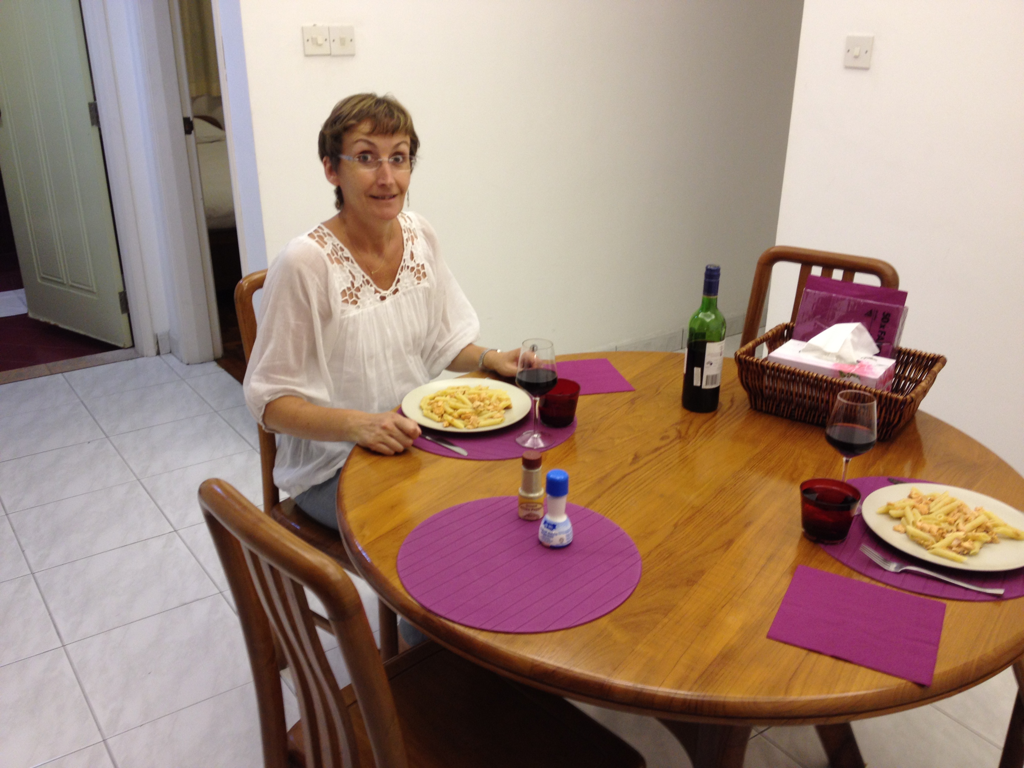 Nos effets personnels prennent place enfin dans des armoires … mais pourquoi ai-je donc pris tellement de vestes et vêtements chauds? Je capitule devant la quatrième valise, ce sera pour demain et je prépare des pâtes au saumon à la sauce Teriyaki. Nous sommes vanés … notre lit nous attend.