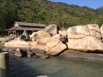 Nous pensons alors rejoindre notre chambre … erreur! Une jeune demande alors notre attention pour la démonstration du gilet de sauvetage … Why? Sommes-nous filmés? Est-ce un jeu de télé-réalité? Et elle nous guide vers un petit bateau (où sont nos valises, ouf !) et deux jeunes garçons nous font traverser le bras de mer pour rejoindre enfin la destination finale … le paradis annoncé!