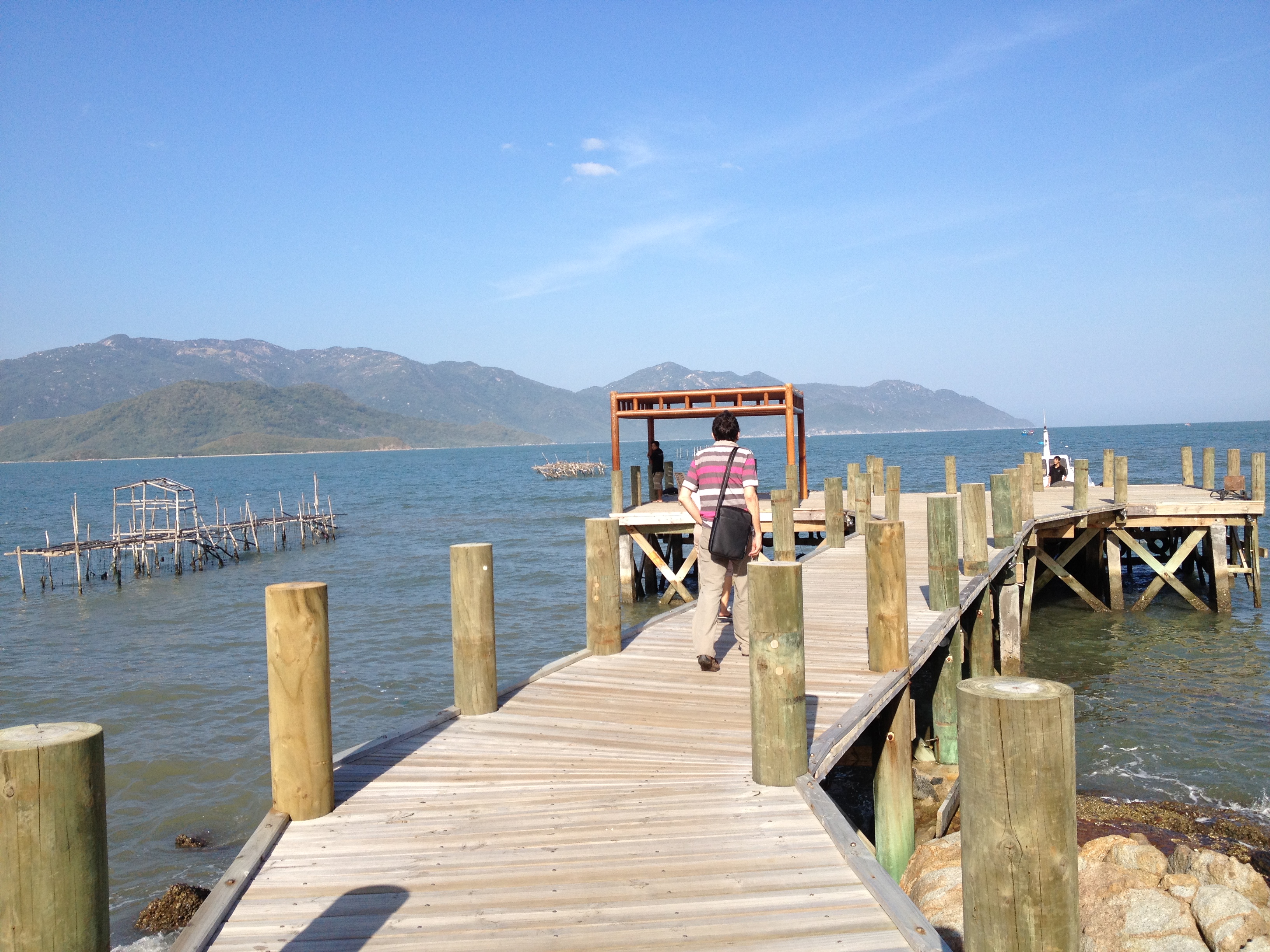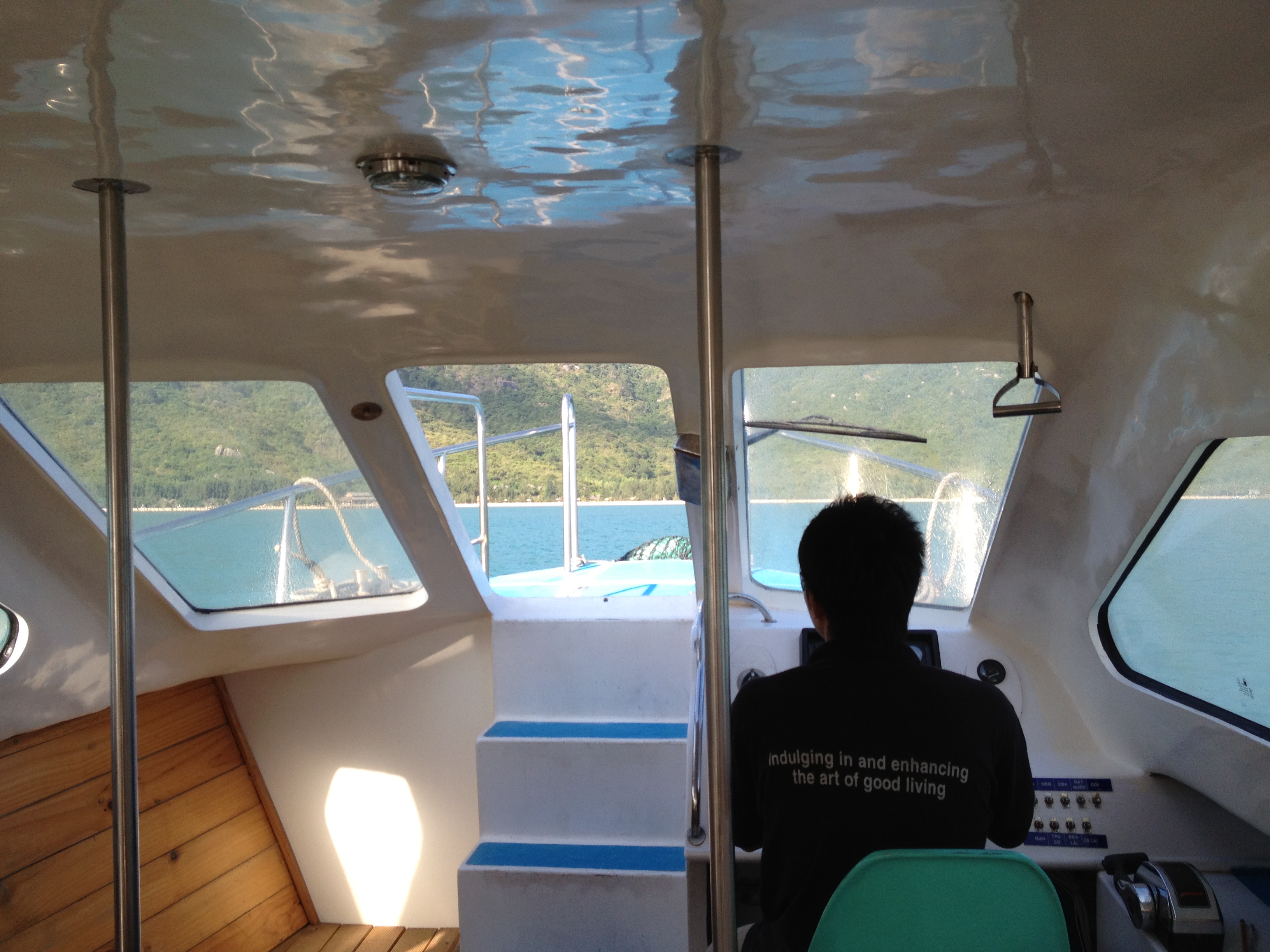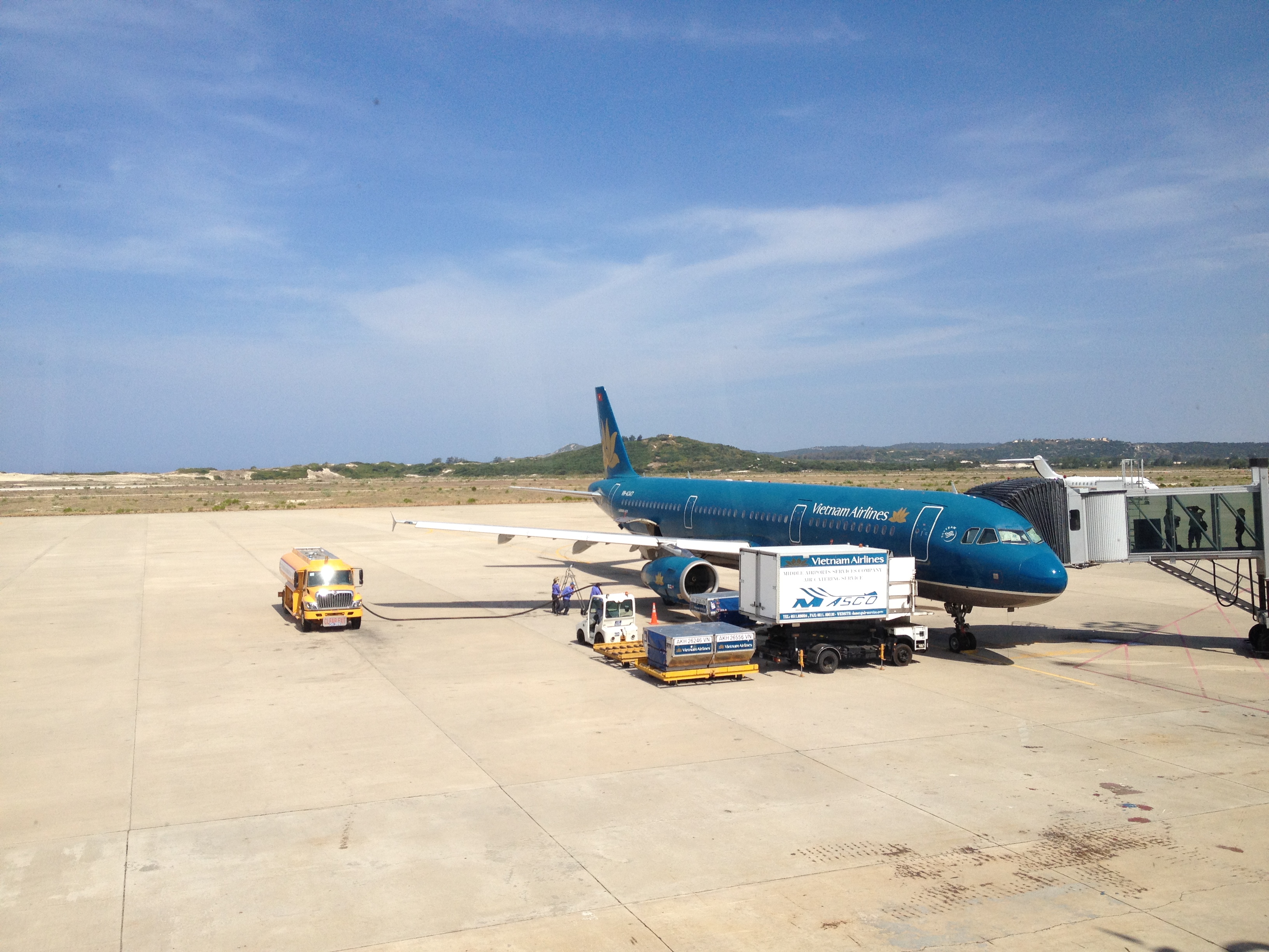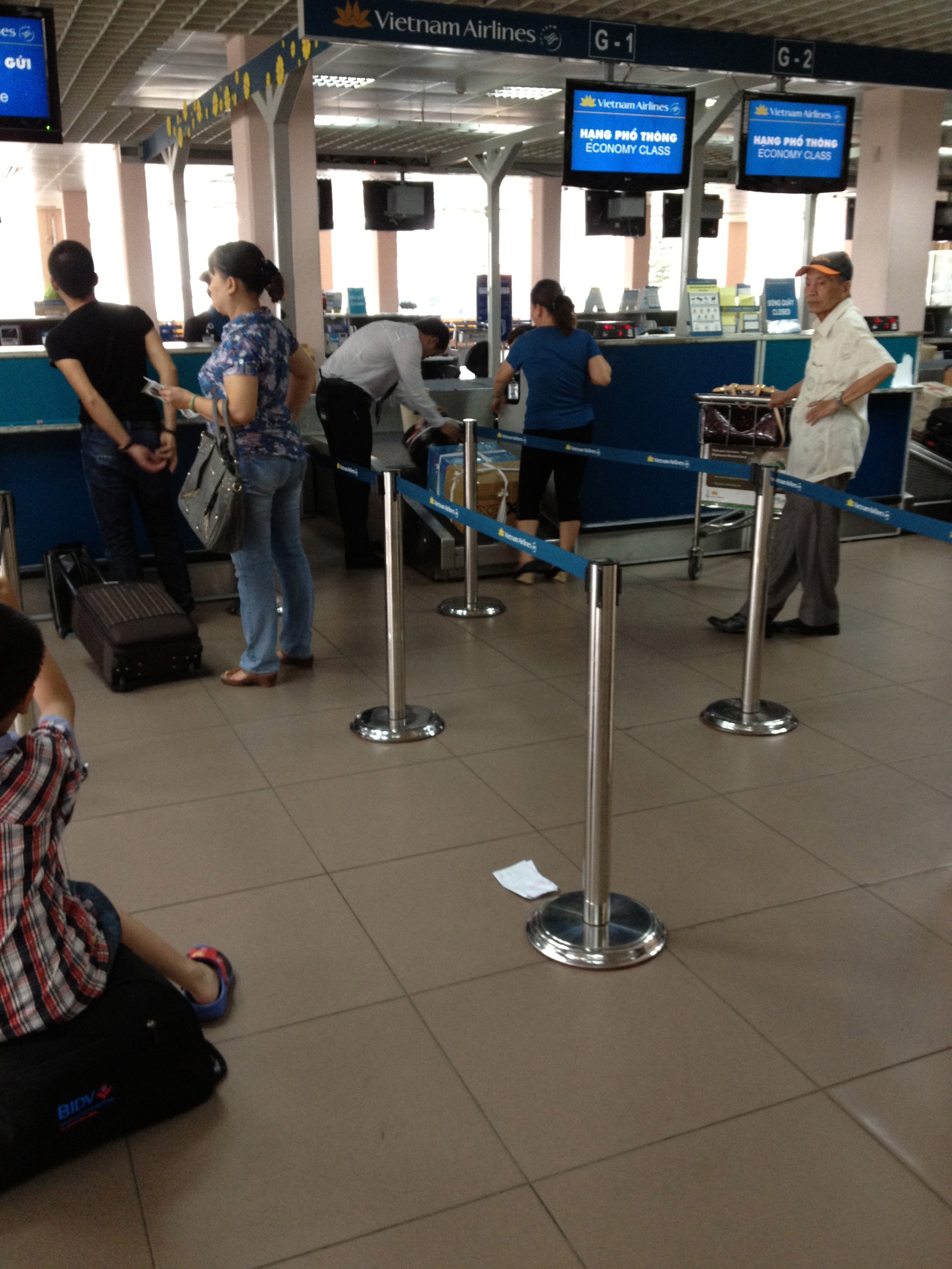 Et c’est ici que les soucis commencent … au guichet d’enregistrement du vol interne pour Nah Trang, il s’avère que les billets ne sont pas reconnus valables! Je dois préciser ici que ce voyage à été organisé et réservé par une agence de Zurich, que les documents en notre possession sont en allemand et que nous n’étions déjà pas parvenus à retrouver nos vols sur le système. Yves parvient à conserver son calme extérieur, il bouille à l’intérieur et moi je me vois déjà passer la semaine ici! Quelle horreur … c’est nettement plus vieux, plus désordonné; leur anglais m’est incompréhensible et je pense que c’est réciproque. L’hôtesse de Vietnam Airlines a beau nous dire « ne vous faites pas de souci, on va trouver une solution », l’heure avance à grands pas; sa cheffe, puis leur sur-chef passent plusieurs coups de téléphone avant qu’elle ne nous remette enfin une carte d’embarquement, tout en nous disant qu’elle est vraiment désolée que nous ne puissions avoir deux sièges côte-à-côte … s’il n’y avait que cela! L’ambiance est ici bruyante, ça se bouscule et sur les tapis roulants je vois plus de sachets plastic, de grands cartons ficelés que de valises. Mais où suis-je?