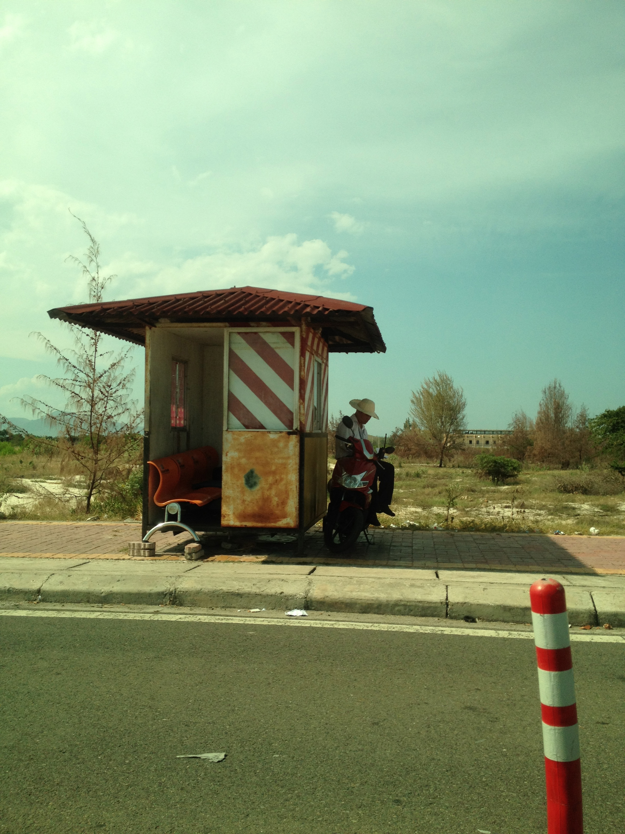 Au départ, une jolie route toute droite, avec de magnifiques terre-pleins fleuris où s’activent, lentement, des vietnamiens au chapeau typique de par ici, nous balade à bonne vitesse entre les collines, les montagnes verdoyantes et les dunes, la mer paisible. Des travaux sur plusieurs kms font soudain vivement ralentir notre jeune chauffeur; on se traîne, on se fait dépasser par la droite par les vespas. A-t-il eu peur des policiers aperçus sur le bord de la route?