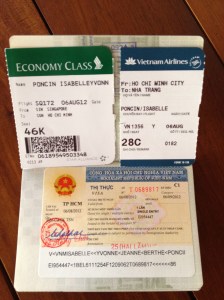 C’est alors la course vers la sécurité à l’étage et là STOP! On ne peut pas vous laisser passer, vous avez un numéro inscrit à la main sur vos cartes! Retour case départ … avant que nous soyons escortés par un super-chef, presque jusqu’à l’avion … alors que nous entendons dans les hauts-parleurs l’annonce que Miss Yvonne Berthe (mes deuxième et troisième prénoms) est priée de se présenter à l’avion!! C’est donc « en nage » que nous prenons place dans un Airbus, dont … mauvaise surprise … la climatisation est déficiente! Mon cœur bat la chamade, mon corps transpire de toutes parts; vive les voyages! Ce sauna ne dure qu’une heure avant de nous poser à Nah Trang avec ses 36 degrés. Cette heure, je la passe à lire, entre autre, un magazine qui m’apprend dans les grandes lignes l’histoire, les ressources, la culture de notre pays d’accueil pour la semaine.