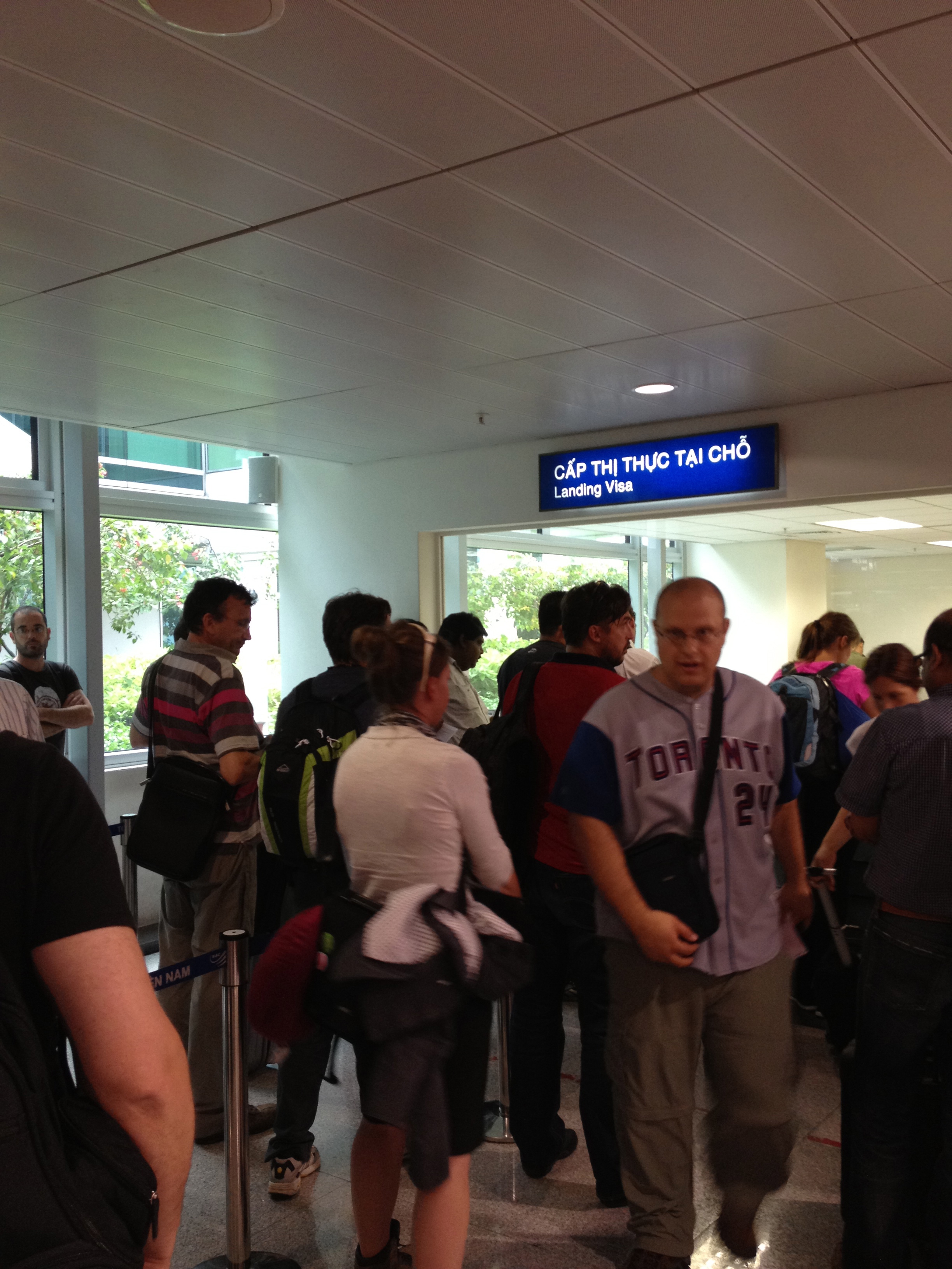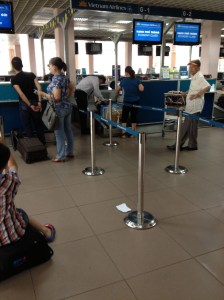 Ça y est, nous sommes au Vietnam; l’organisation est toute différente! Un seul petit guichet pour des dizaines de voyageurs demandant un visa touristique. L’attente se prolonge presque une heure avant que nous reconnaissions mon nom appelé au micro. La pauvre dame qui passe sa journée à déchiffrer et prononcer nos noms occidentaux, je la plains. Contrôle des passeports sans encombres, sans un mot, sans un sourire et je tâche de suivre Yves qui presse le pas pour rejoindre l’autre Terminal.
