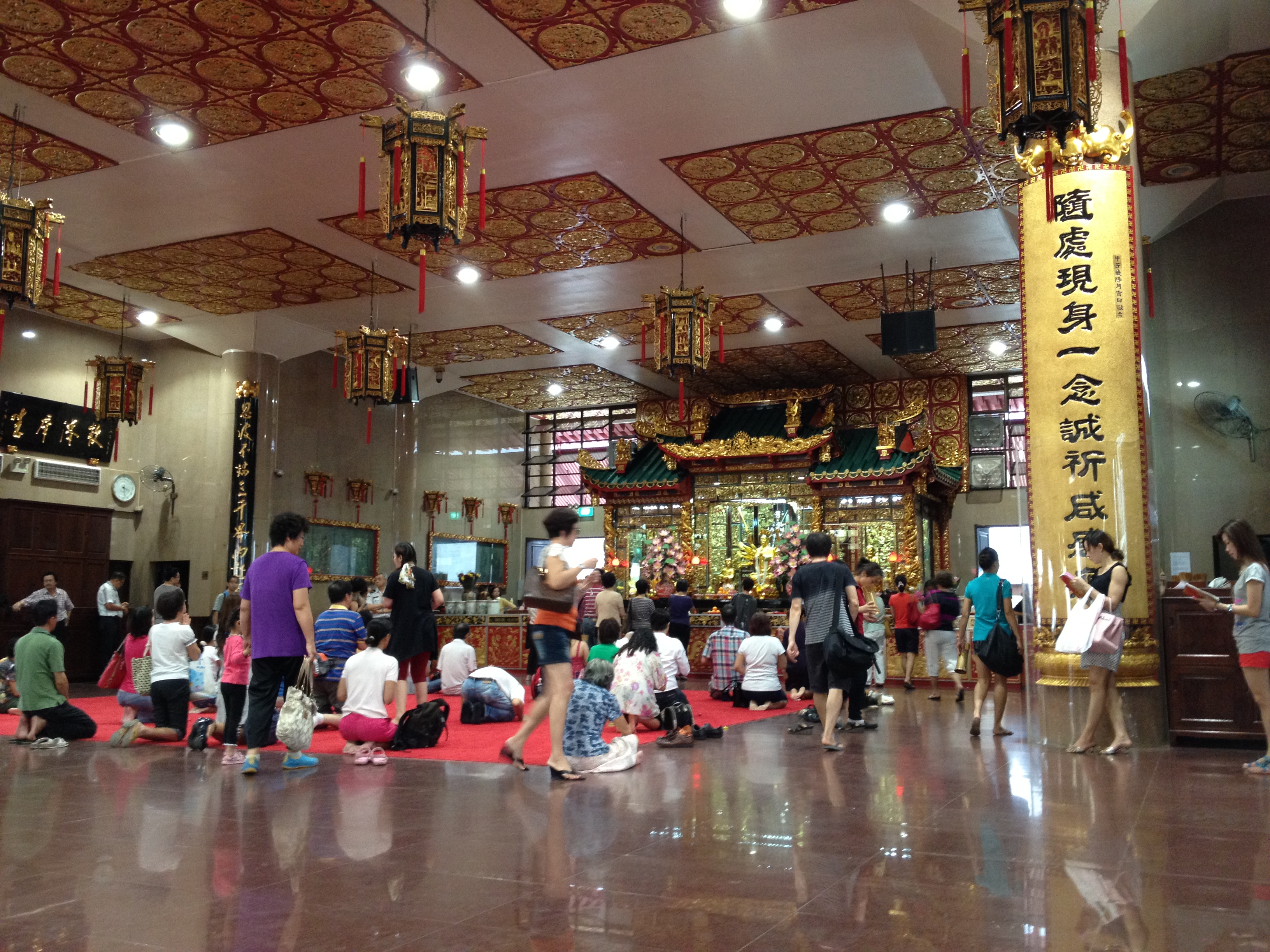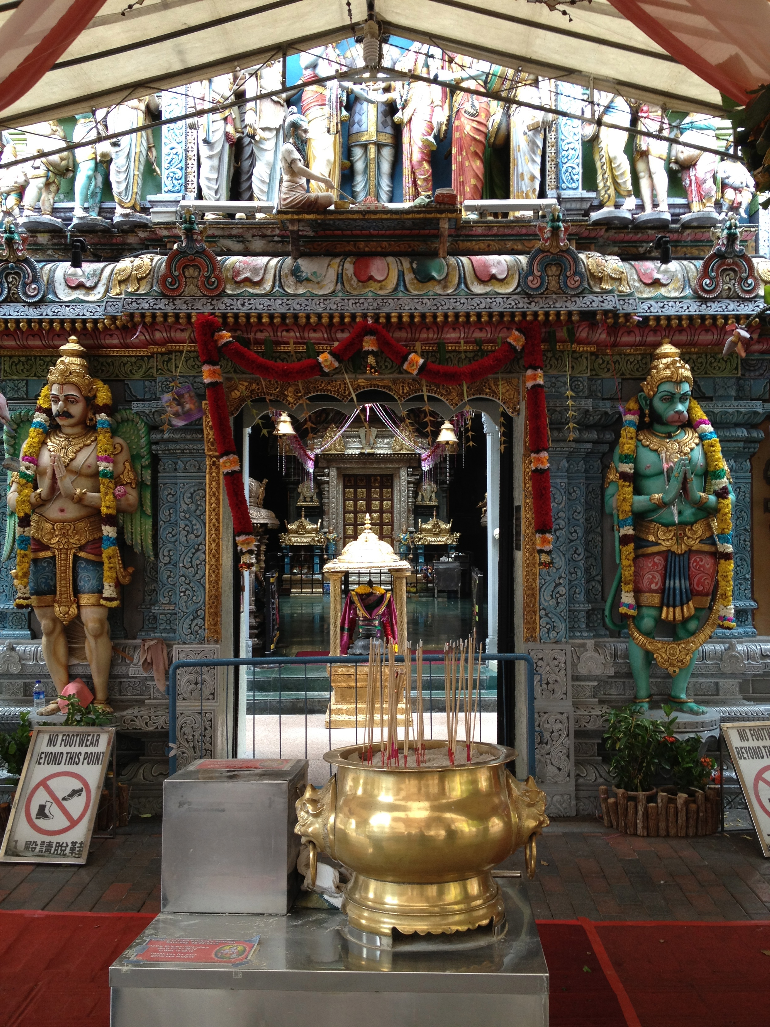 Le premier temple, où l’on vénère le dieu Krishna, est hindou mais des fidèles taoïstes chinois viennent quand même, semble-t-il, y faire leurs prières. Le temple « Kwan Im Thong Hood Cho » attire foule de monde, venus prier « The Goddess of Mercy » dans l’espoir de réussite et de chance ; agenouillés, ils s’inclinent, agitant entre leurs mains une sorte de canette remplie de bâtons d’encens incandescents. Ce temple serait le seul édifice du quartier à avoir résisté aux bombardements de 1942 durant la guerre avec les japonais.