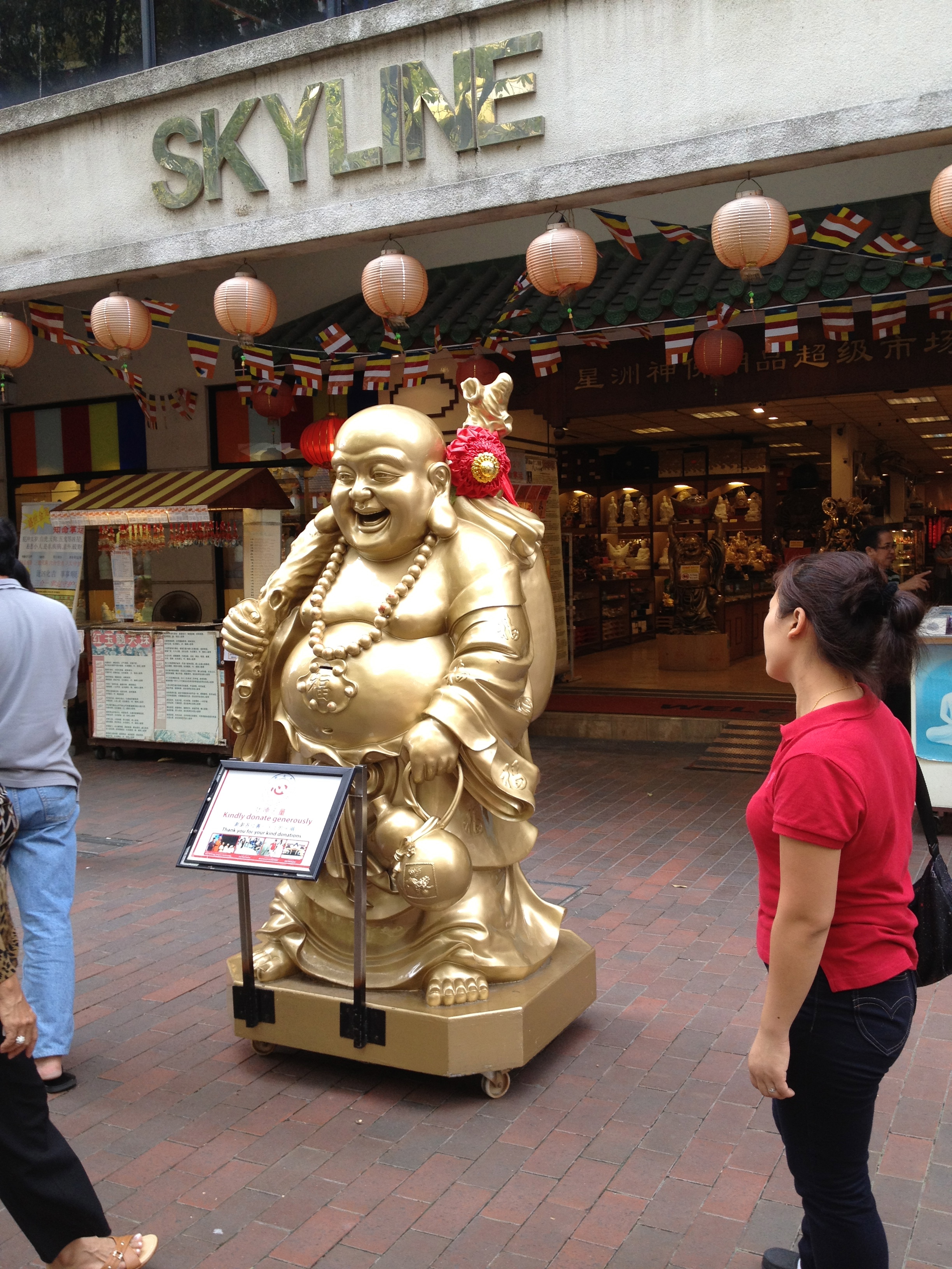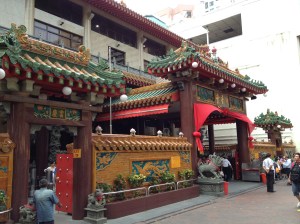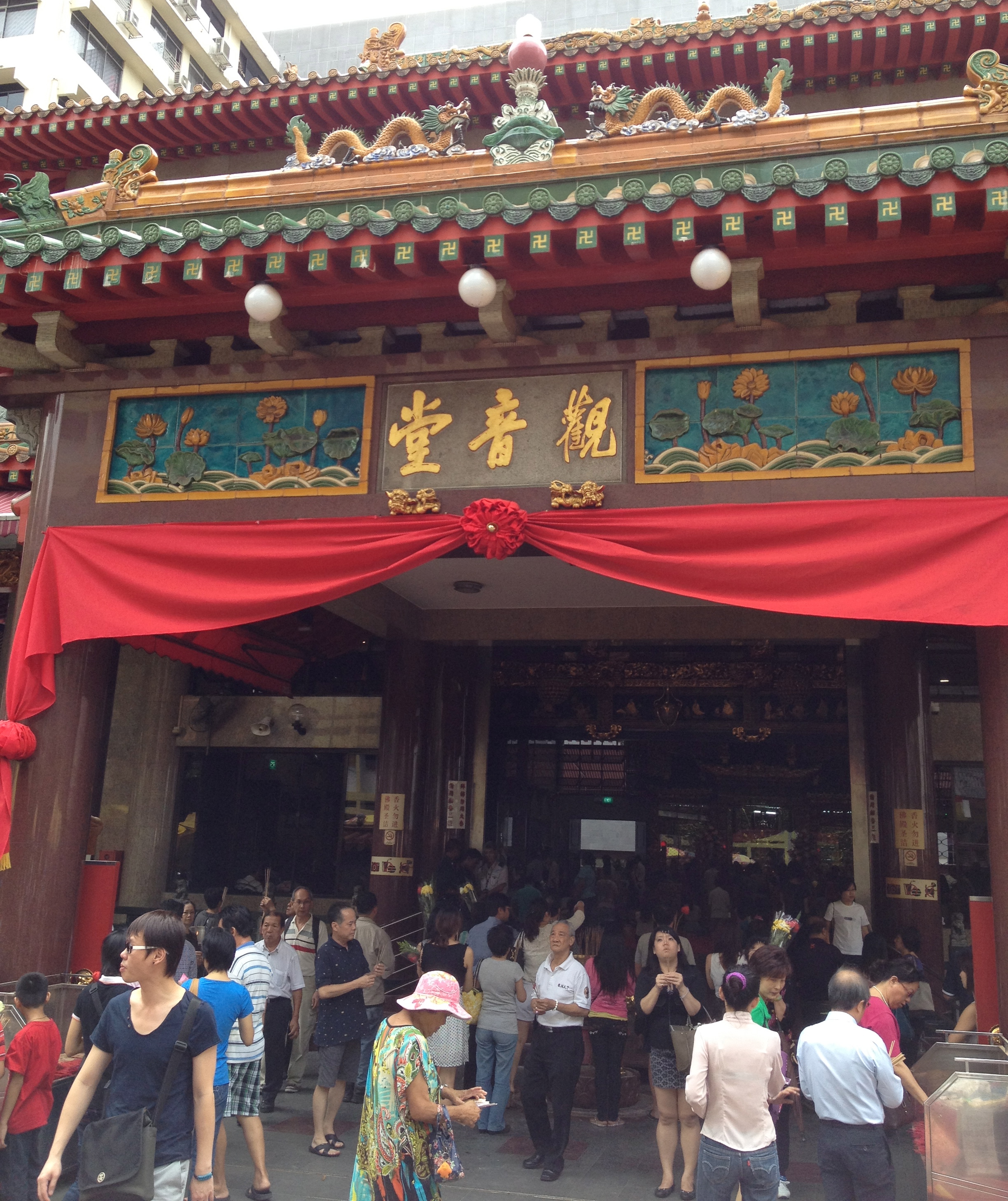 Je repère juste de l’extérieur, une synagogue, très bien gardée, avant de me diriger vers une rue piétonne animée et y découvrir deux temples très fréquentés. Je suppose que cette période des festivités de la mi automne (étrange pour un pays qui ne connaît pas les saisons !) justifie le nombre impressionnant de gens qui vénèrent les bouddhas, les encensent, les caressent, leur apportent des offrandes ; nous sommes milieu d’après-midi, un jour de semaine. La rue regorge de vendeurs d’encens et de fleurs, de boutiques d’objets sacrés, de diseurs de la bonne fortune.