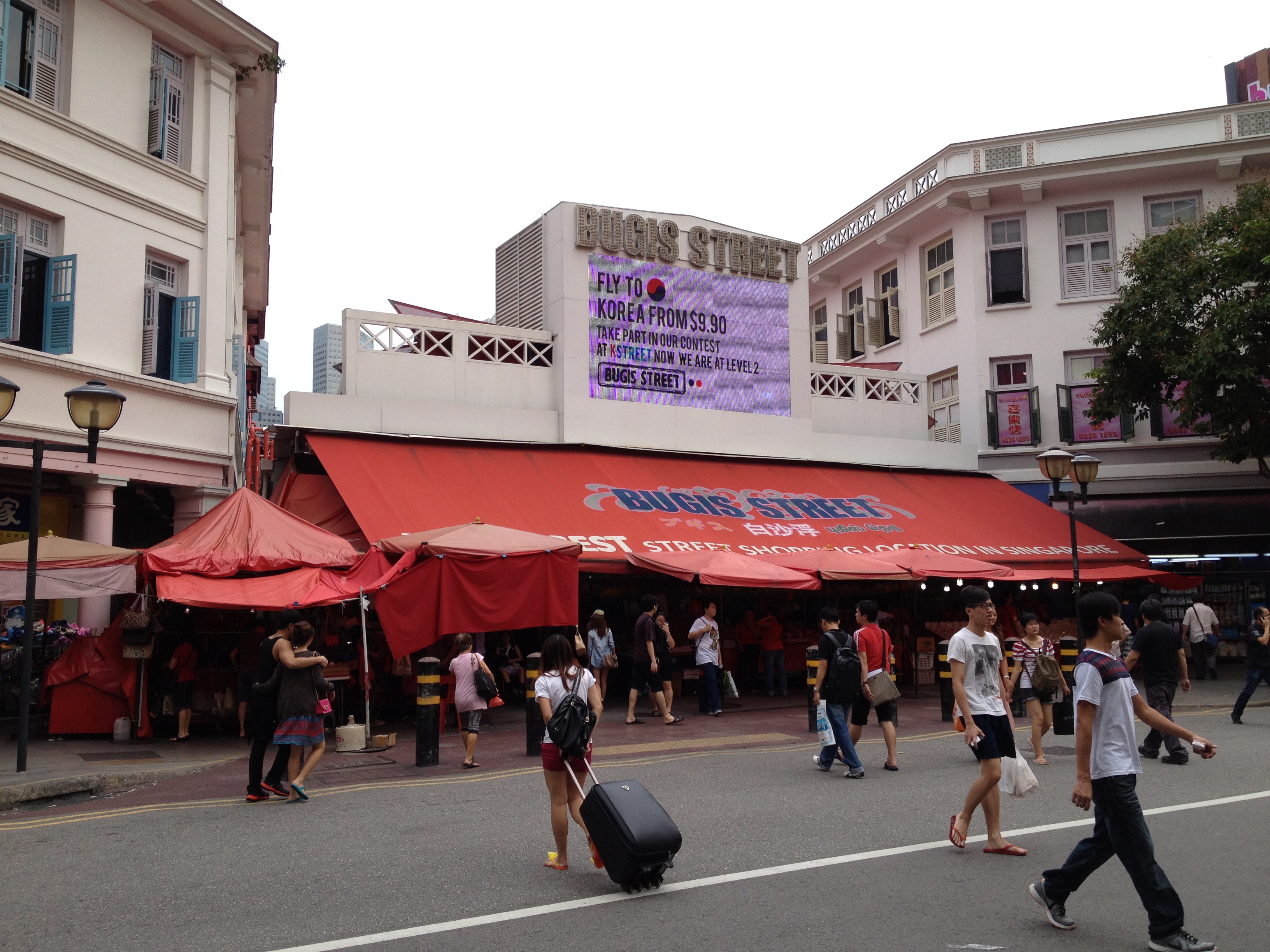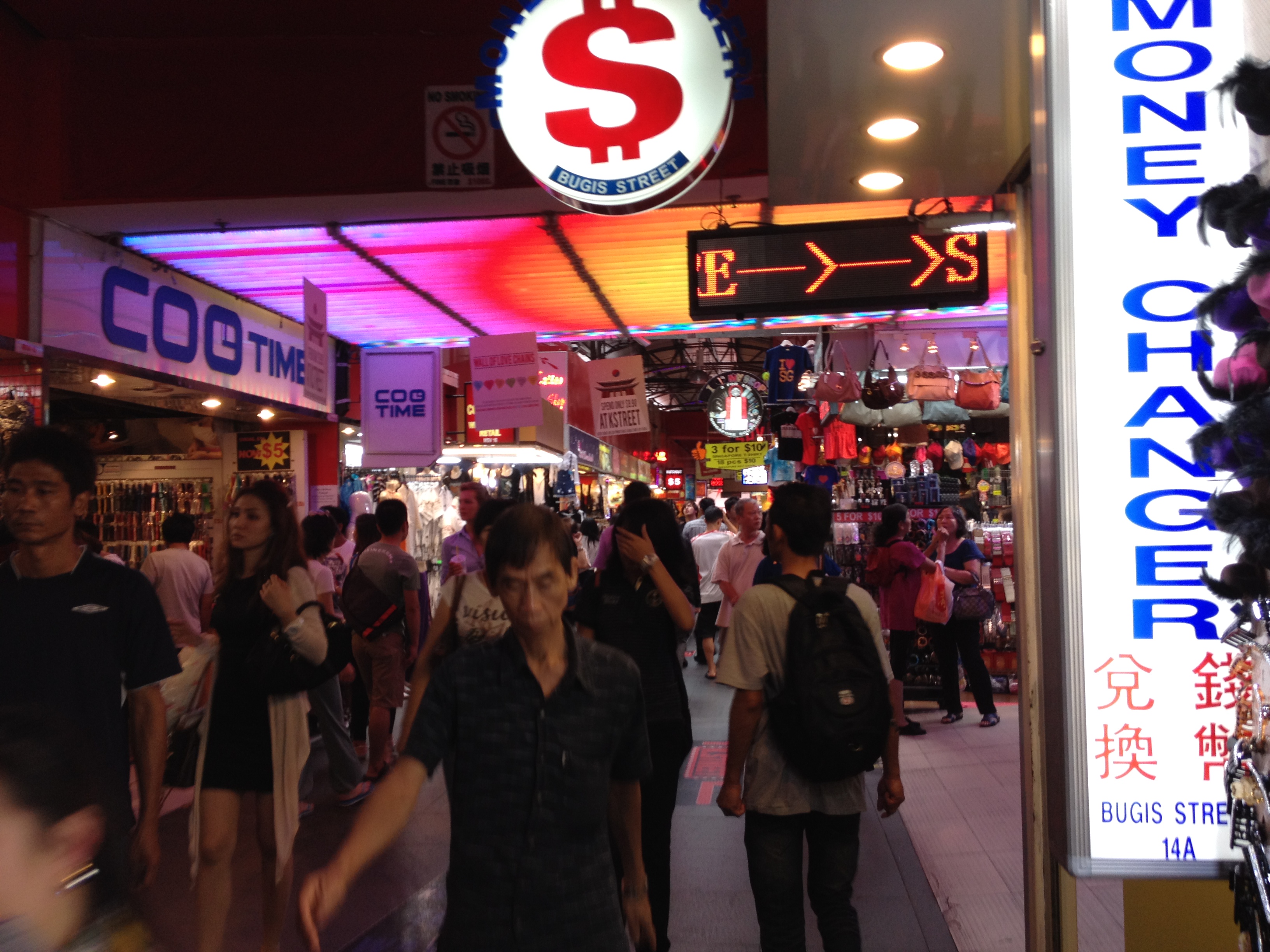 Pour rejoindre la rue des grands centres commerciaux et des grands hôtels, je traverse Bugis Streets, un véritable souk chinois couvert, assez sombre, avec échoppes sur échoppes et du monde partout dans ce labyrinthe de mini ruelles … à voir !