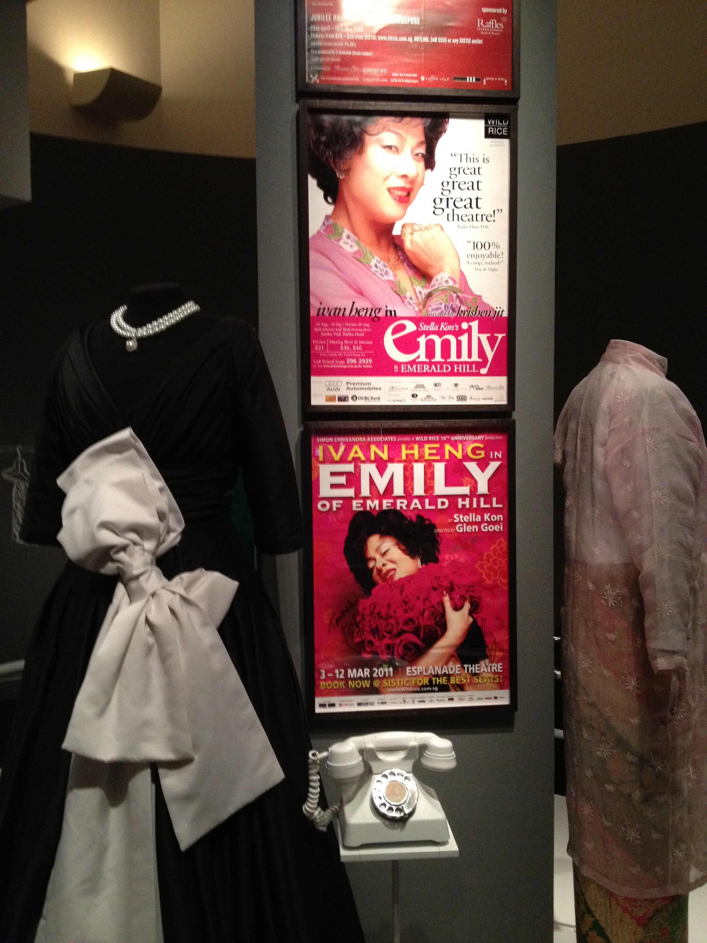 L’exposition temporaire me fait découvrir le personnage de « Emily Gan of the Emerald Hill », une icône de la culture des Peranakans, dont Stella Kon est la créatrice dans une œuvre datant de 1982. Elle a vécu à Emerald Hill, dans une villa de famille portant le nom de Oberon et elle s’est beaucoup inspirée de sa propre grand-mère pour créer ce personnage de Emily ; personnage qui a été joué au théâtre par de grandes actrices asiatiques mais tout dernièrement par UN acteur, Ivan Heng. La pièce aurait été jouée plus trois cents fois dans une vingtaine de villes de par le monde (Malaisie, Indonésie, Australie, USA, Canada, Angleterre). Ce succès fit renaître la communauté Peranakan à Singapour.
