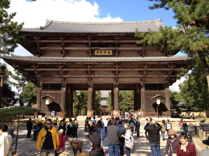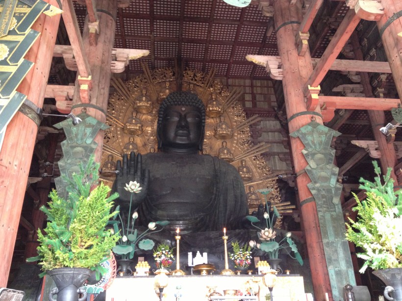 Et enfin nous découvrons le temple Todaiji qui abrite le Grand Bouddha de bronze, de 16 mètres de hauteur, la plus grande statue de bronze au monde … waouh, quelle splendeur et quelle émotion ! Bouddha en position assise, sur des pétales de lotus, est représenté avec la main droite levée, d’où partent des petits fils invisibles qui vont chercher les soucis des gens – signifiant ‘ne vous inquiétez pas’ – et la main gauche ouverte à plat – signifiant ‘je m’occupe de vous et de vos problèmes’. Cela semble incroyable qu’une telle œuvre fut construite au huitième siècle par des êtres humains, tout comme le Daibutsu, le bâtiment en bois qui abrite la statue. La plus grande construction en bois du monde, elle mesure 48 mètres de haut, 57 de long et 50 de large. Et encore ! A l’époque de sa construction il faisait 80 mètres de long mais suite à un incendie il a été reconstruit dans ses nouvelles dimensions. Son toit de tuiles d’argile pèse trois mille tonnes ; dans les années 1980, il a été démonté pour des rénovations et on raconte que la construction a alors grandi de 11 cm. De nombreux pratiquants possèdent un carnet pour calligraphie dans lequel ils font dessiner dans chaque temple visité sur leur vie, le nom du temple ; à leur mort ce cahier de 50 pages doit être complet et brûlé dans le cercueil pour ouvrir le chemin du paradis !