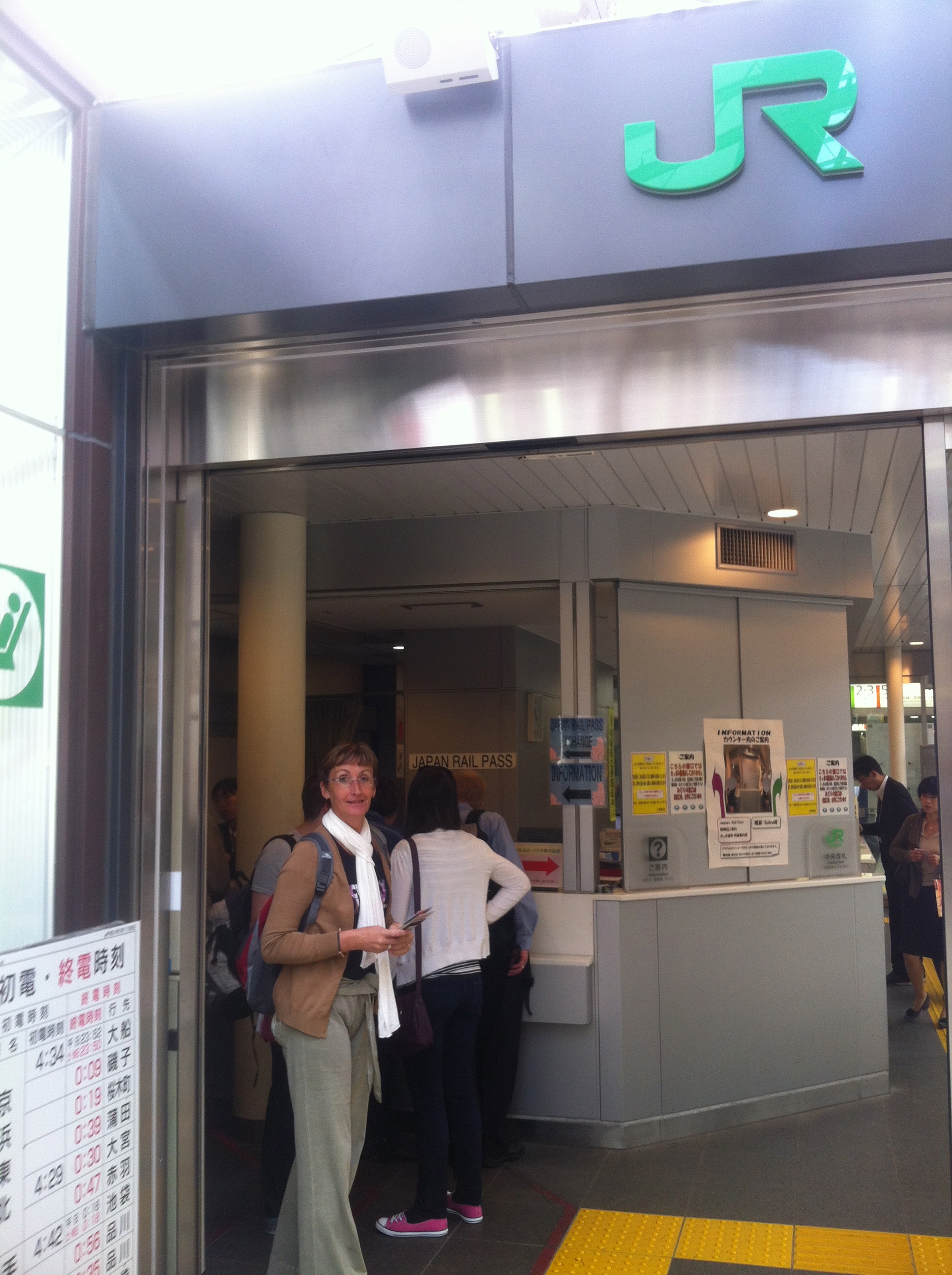 Nous voici arrivés à Ueno Station, c’était assez facile et nous prenons des forces dans un « Vie de France », avec de délicieux croissants mais un personnel qui ne parle pas l’anglais … le bonjour, le merci, le bon appétit se devinent ; elles sont très souriantes et parlent énormément. Il semble que les japonais ne soient pas du tout avares de mots. Le ton est chantant, nous nous faisons l’oreille gentiment, c’est joli. Ici nous déposons l’argent et reprenons le change sur un petit plateau ; chaque pays a ses coutumes. A Tokyo, le réseau de trains et de métro est très dense et je l’ai déjà un peu étudié avant de partir ; aux interconnexions, il faut souvent ressortir et chercher la gare du train ou du métro que l’on cherche. Ainsi à la gare JR (Japan Railway), nous parvenons à faire trois démarches et en sommes assez fiers : Yves achète à un guichet automatique, avec un minimum d’indications en anglais, des cartes multi-réseaux SUICA ; nous échangeons les vouchers achetés à Singapour contre un JR Pass pour les grandes lignes de train – beaucoup de cachets, de papiers à remplir et un double contrôle par une autre opératrice ; et c’est à un troisième guichet que nous réservons nos places pour le voyage à Kyoto de jeudi – en présentant un papier avec la date, la destination et l’heure, tout se fait très vite. La gare grouille de monde, sans toutefois que ce soit fort bruyant – pas de cris, pas de mouvements de foules ni de bousculades.