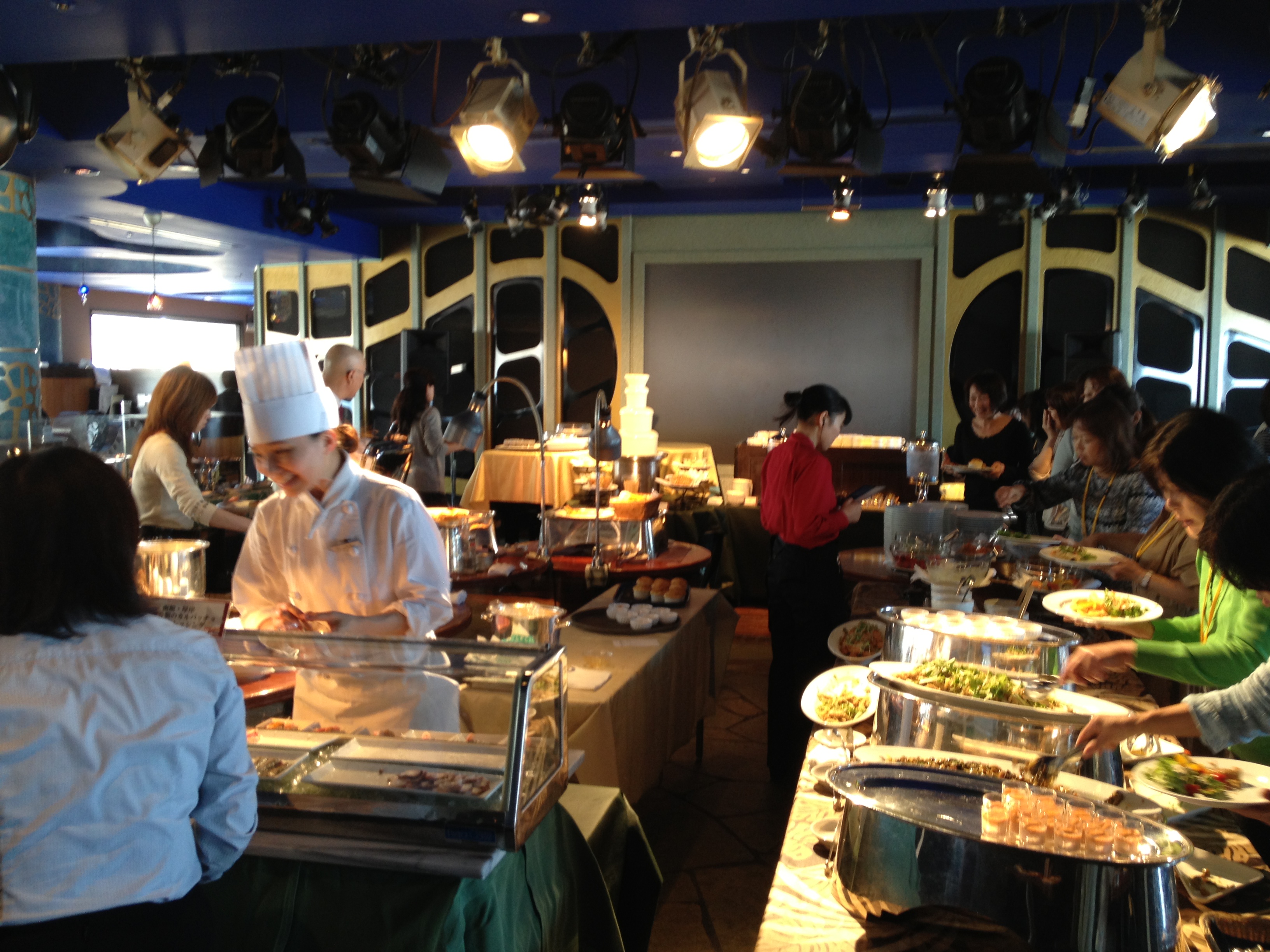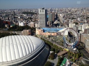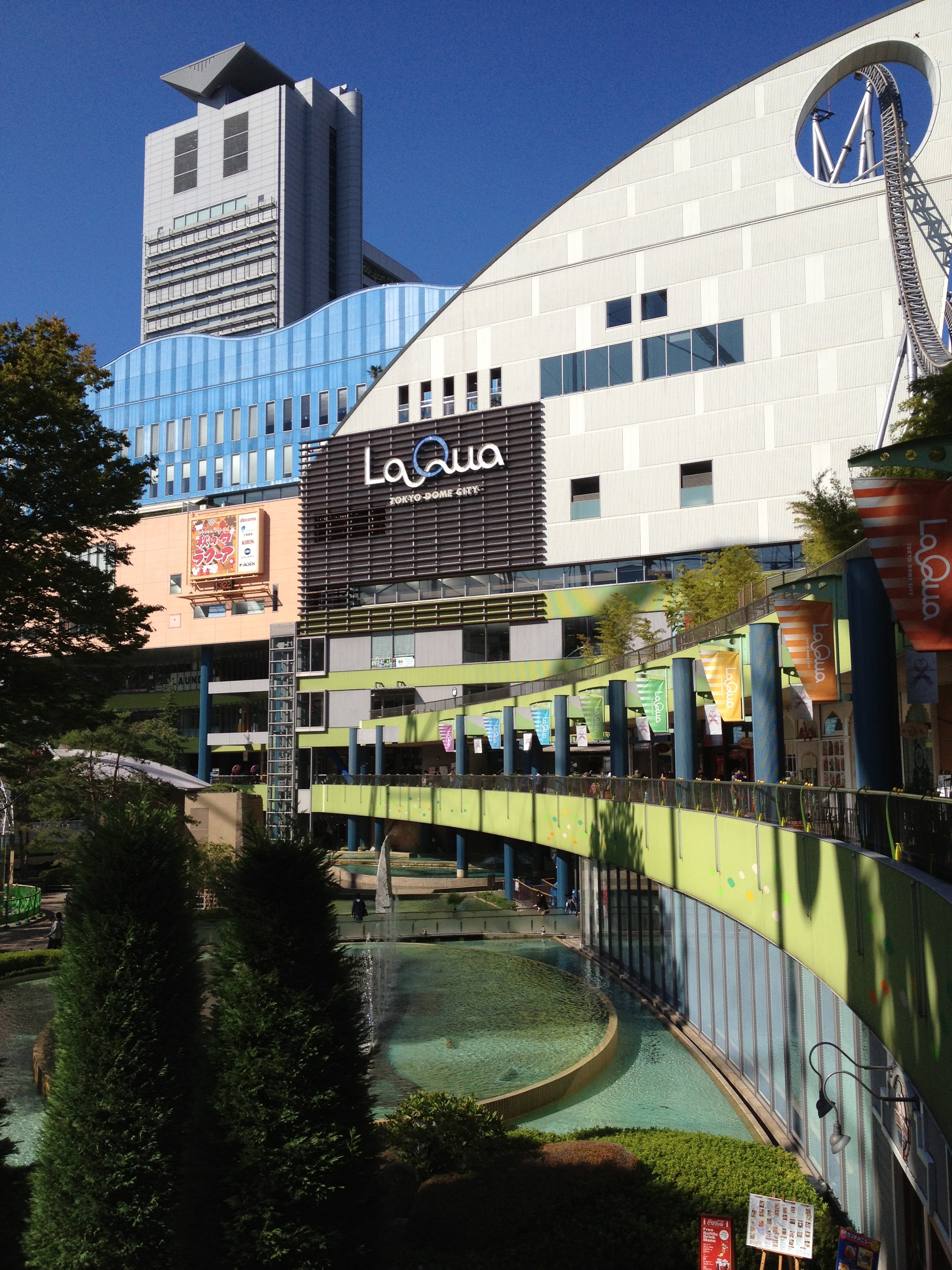 Midi approche, le ventre tiraille, nous débutons très fort avec un lunch au 43ème étage du Dome Hotel ; le buffet est magnifique, nous avons envie de tout goûter, la fontaine de chocolat blanc coule à flot, la vue sur 360° nous enchante. Le Dome est un stade de baseball et une salle de spectacles ; les gens y font la file pour des réservations et pour s’épargner les jambes, certains ont laissé par terre leur sac-à-dos ou ont scotché un papier pour réserver leur place. Pourrions-nous imaginer cela en Europe ? Le quartier abrite aussi un parc d’attractions avec des montagnes-russes, une grande roue, etc et bien évidemment des restaurants et le centre Laqua, notre premier centre commercial japonais. Les boutiques nous paraissent très attirantes, les décorations sont raffinées, les vêtements très attrayants ; le shopping sera pour plus tard.