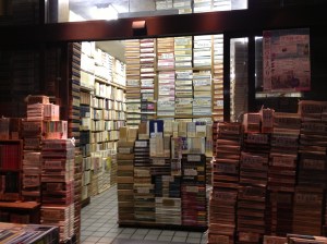 Bien requinqués nous partons à la découverte des rues au sud de l’hôtel ; pedibus nous parcourons Jimbocho, le quartier des bouquinistes (il y en aurait 160 dont le stock total dépasse 10 millions d’ouvrages). Des dizaines de petits magasins, vieilles librairies proposent des tonnes de vieux livres, illustrés, des estampes, souvent de seconde main … la ville présente ainsi plusieurs quartiers à thème ; celui-ci est totalement impressionnant, même si évidemment toutes les œuvres sont en japonais. Dans une plus grande librairie, sur huit étages, nous tentons de demander où trouver le domaine Business … eh oui, BMG est bien ici en quelques dizaines d’exemplaires traduits, avec une couverture redessinée en style manga !