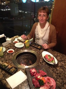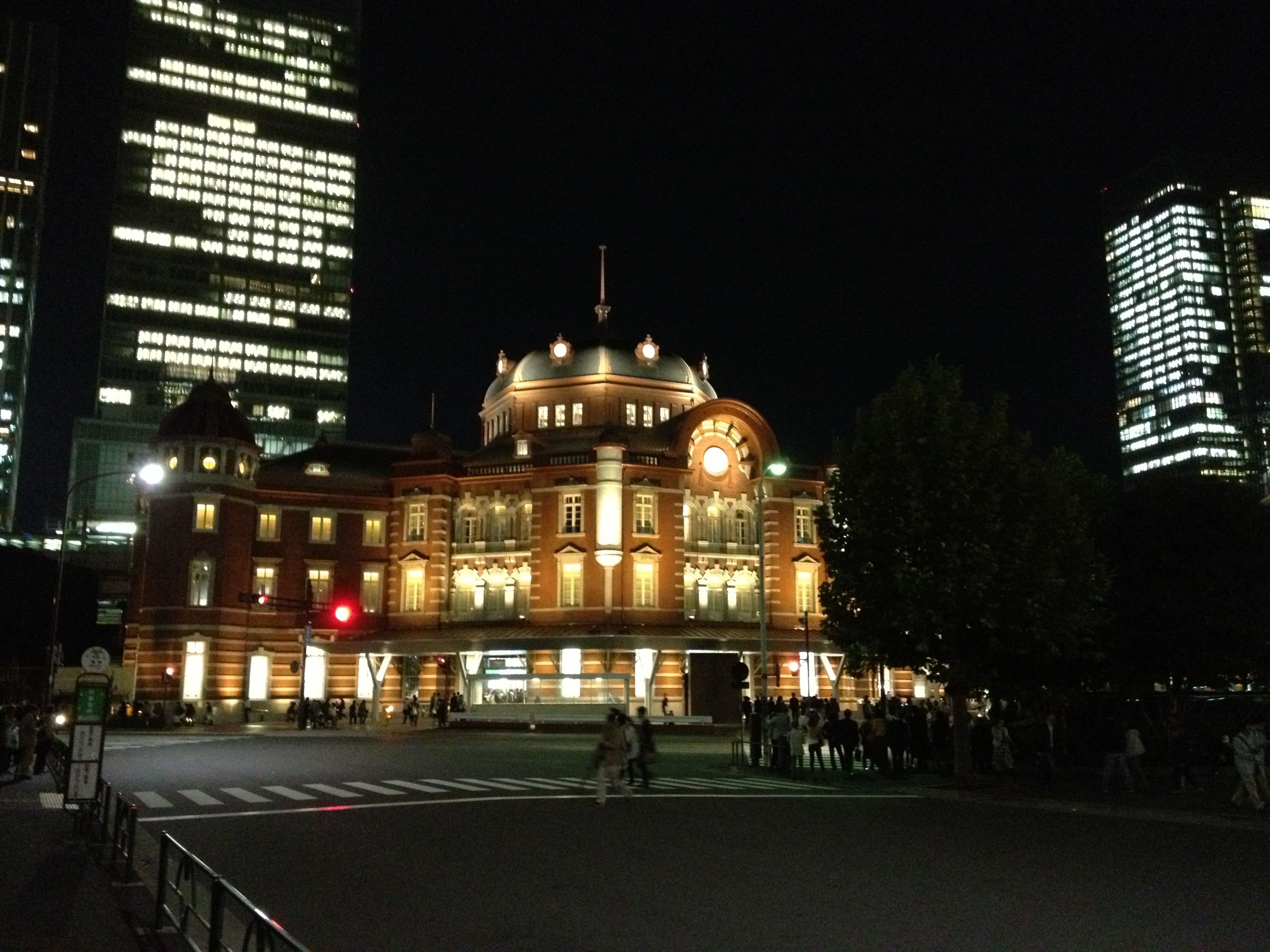 La gare centrale de Tokyo est un magnifique bâtiment immense, de briques rouges, érigé en 1914 sur le modèle de celle d’Amsterdam. Elle est le point de départ du quartier de Marunouchi, ses tours modernes, centre financier et commerçant très actif, des rues bordées d’arbres aux guirlandes lumineuses donnant presque un air de Noël avant l’heure. Les grandes marques de couture, bijouteries, montres sont ici mais dans le centre commercial nous découvrons de nouvelles marques locales. Les décors de boutiques sont merveilleux, les vendeuses sont dynamiques, elles sont élégamment habillées, maquillées, coiffées de chapeaux, excentriques ; elles essaient des vêtements ou manteaux, au point de les confondre avec des clientes … la seule différence est probablement qu’elles ne portent pas de sac-à-main et qu’elles parlent haut et fort, avec ce ton chantant. Un monde de la mode qui paraît réellement très fascinant, un vrai plaisir. Une rue de restaurants au dernier étage, tous très attrayants au vu des photos mais pas facile d’en comprendre plus. Yves a une envie de viande, un bon morceau de steak et c’est moi qui choisis … un établissement où, pas de chance, il n’y a ni photo ni english menu, juste une vitrine où j’ai vu beaucoup de viande ! Un seul jeune serveur parvient à nous expliquer que ce sera une sorte de charbonnade avec une variété de morceaux différents ; on se régale, dans la bonne humeur, faisant griller nous-même nos morceaux qu’il faut ensuite manger avec les baguettes … merci de nous avoir donné une bavette ! La viande n’a pas du tout la couleur rouge d’un filet de bœuf comme nous le connaissons, elle est au contraire très nervurée de blanc mais elle fond littéralement dans la bouche. La vue plongeante sur la gare éclairée de briques rouges ajoute au charme de ce premier souper japonais qui restera un de nos meilleurs souvenirs gastronomiques. L’expérience métro puis train pour le retour vers l’hôtel est concluant, nous passons notre permis ‘déplacement à Tokyo’ avec succès. Le sentiment est assez étrange pour moi ; parmi une population à 99% japonaise, nous devrions nous sentir tellement différents et pourtant leur taille, leur habillement, leur discrétion me permettent presque de me confondre plus facilement dans leur monde.