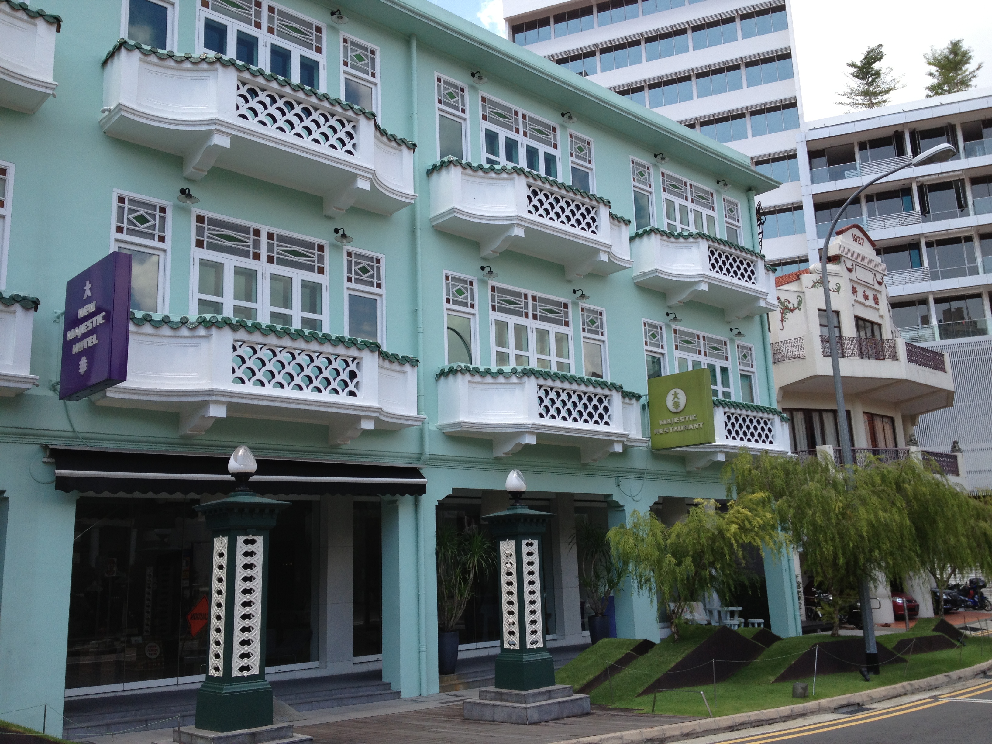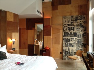 Le New Majestic Hôtel est réputé pour avoir toutes chambres différentes, décorées selon un thème par un designer local. C’est Theseus Chan qui a nommé la nôtre ‘Work‘, la couvrant au sol et aux murs de panneaux de bois contreplaqués, avec une circulation tout autour de la baignoire attenante au lit … original comme disposition, et look très ‘art déco’, donnant une nouvelle définition dit-il, à ‘living in a box’.