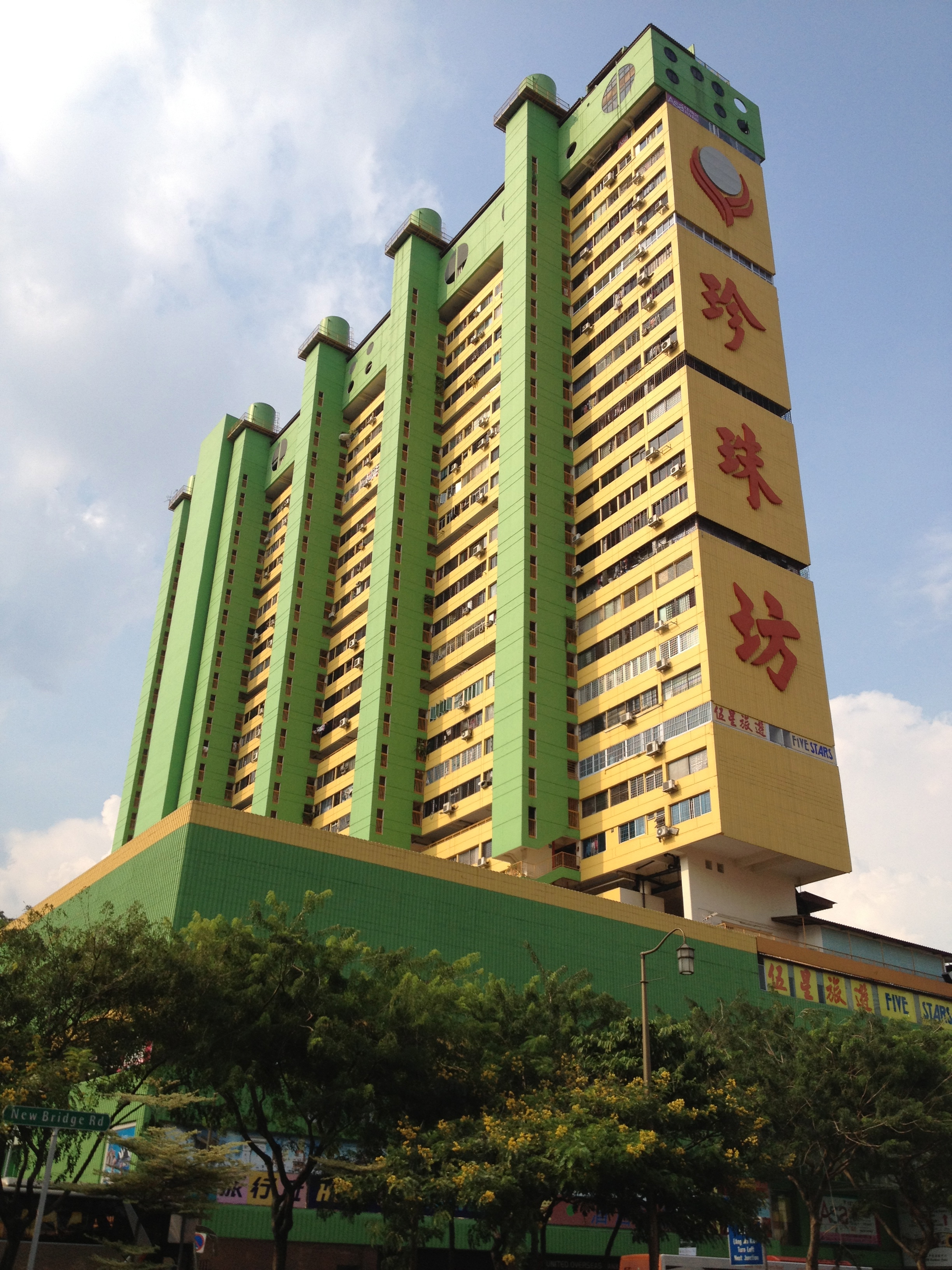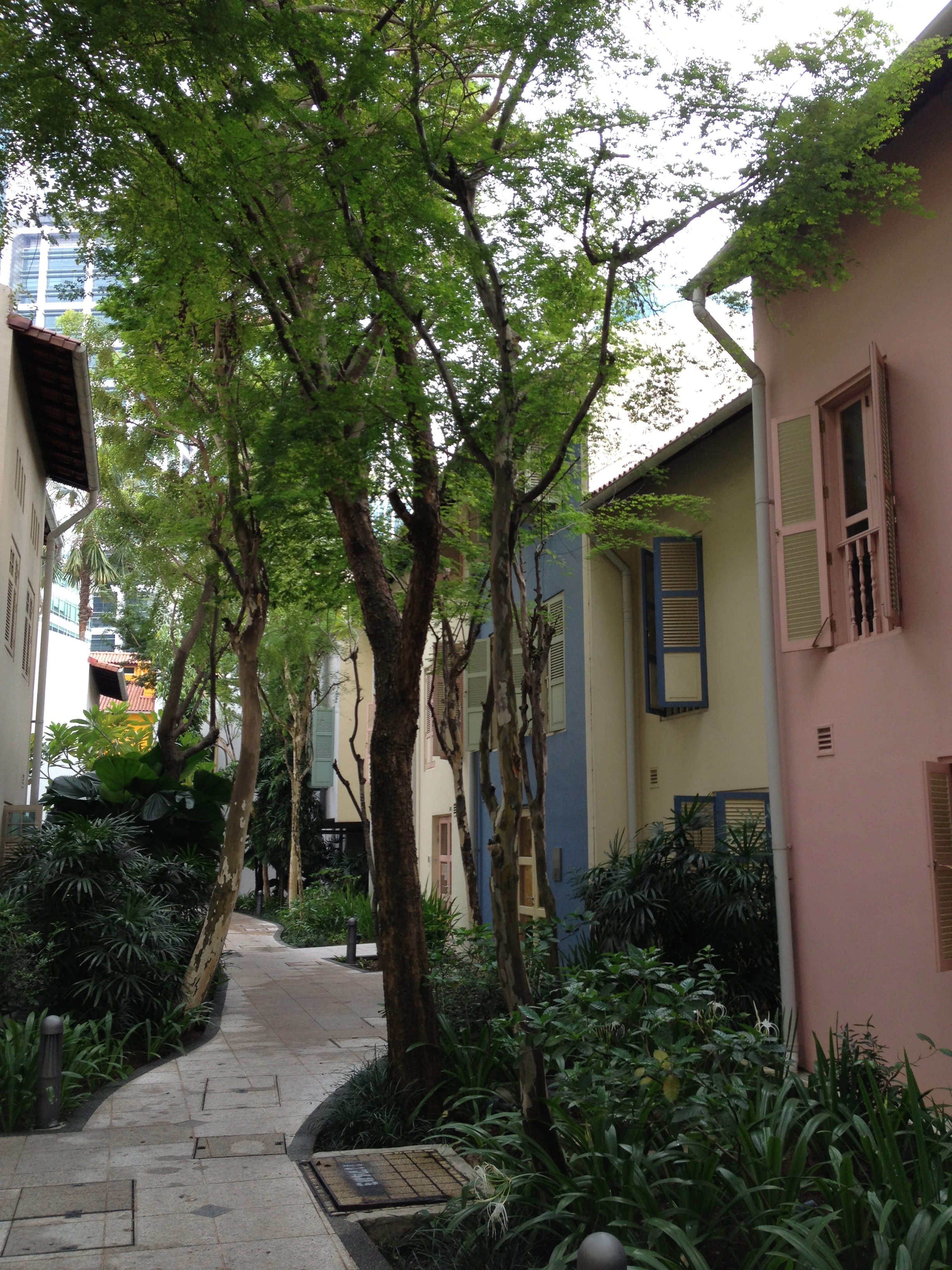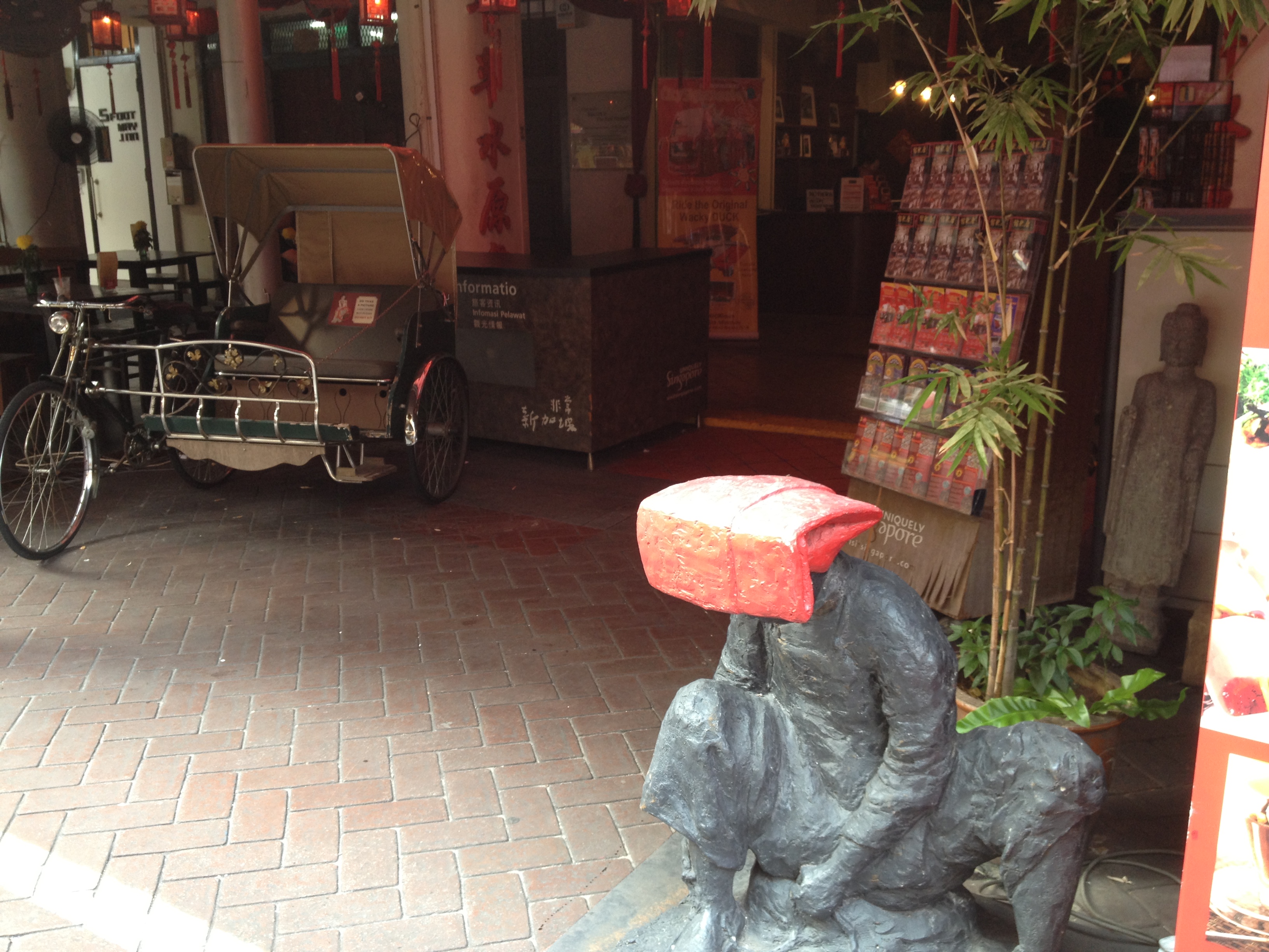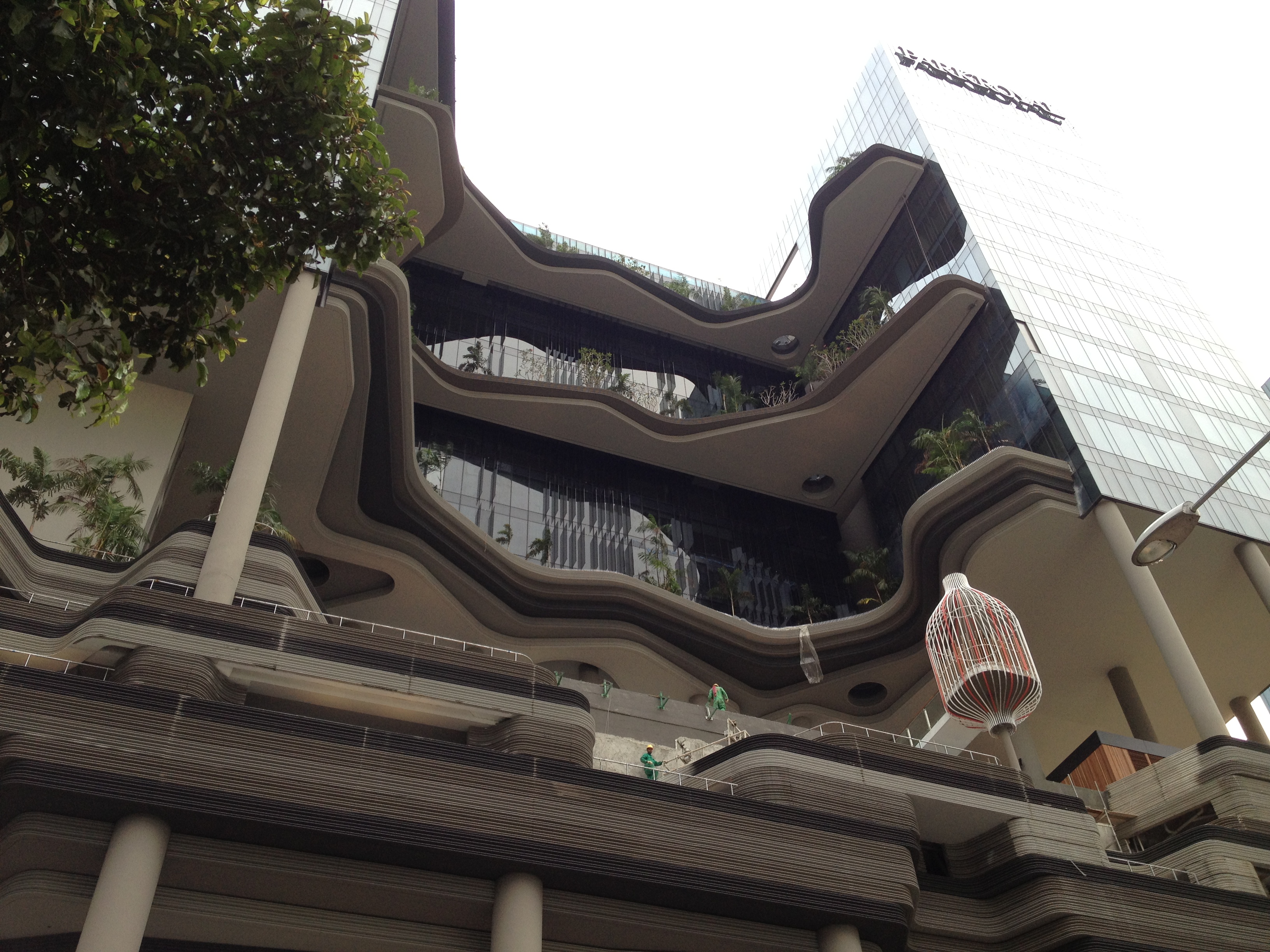 Yves donne une présentation à une trentaine de personnes du comité de direction d’un ministère de Singapour, dont il recevra des échos très positifs. Le prochain voyage se concrétise, j’ai en main les yuans commandés et la récupération de nos passeports avec le joli visa n’est plus aujourd’hui qu’une formalité rapide. Pour nous imprégner déjà, nous passons une partie du week-end dans Chinatown. Je déambule à présent sans plan, dans les ruelles à la recherche de coins insolites et j’en trouve toujours. Les constructions en chantier progressent à vue de nez et cet après-midi je suis en admiration devant l’envergure du bâtiment ParkRoyal, avec ses couches comme des strates horizontales, ses arbres plantés bien haut dans les étages, ses cages à oiseaux décoratives qui sont déjà suspendues alors que les ouvriers travaillent encore le gros œuvre.