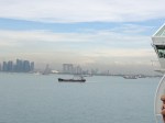 Les bateaux se multiplient autour de nous, les îles apparaissent à mesure que le but se rapproche ; et je pense bien que nos fameuses îles de Kusu et St John’s en sont du nombre. Accoudés au bastingage nous assistons à la montée à bord du pilote, à l’arrivée en douceur et à l’amarrage au quai de Marina South Pier. La Grande Roue, les Marguerites, le Marina Bay Sands sont tout proches … nous sommes bien chez nous ! Et doublement chez nous de par la chaleur humide qui nous assaillit ; l’heure d’attente sur un pont, en mangeant quelques pâtes et fruits, nous rappelle vite le climat de Singapour …