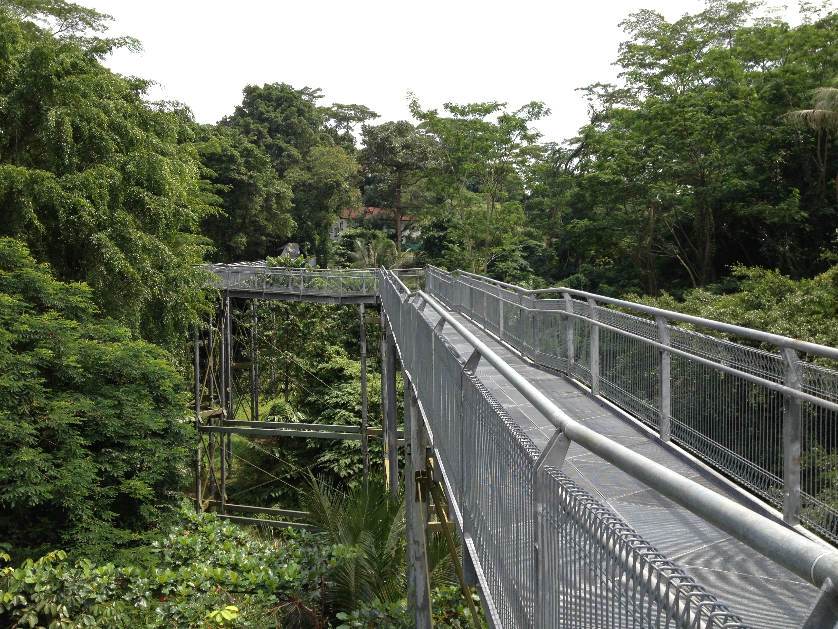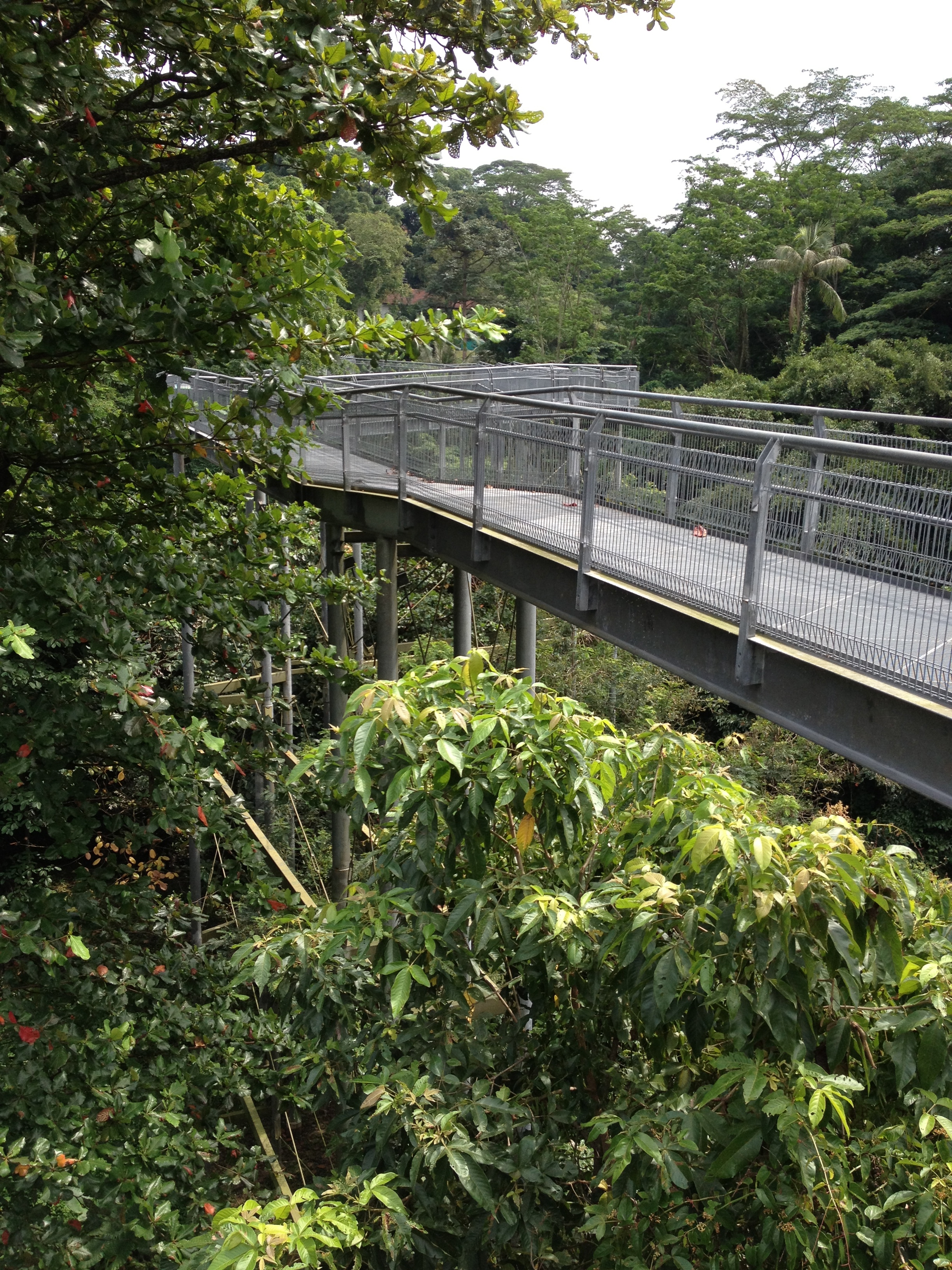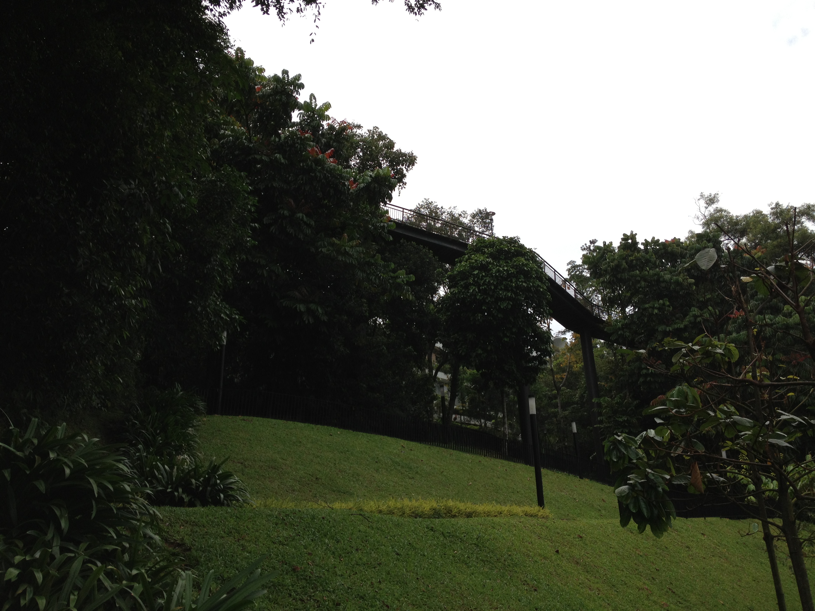 A mi-chemin, le canopy longe Preston Road, une petite rue coincée dans les bois où s’alignent de superbes bungalows ‘black and white’ ; à l’origine construits pour les officiers de l’armée britannique, ils sont maintenant prisés par les riches expatriés de Singapour. Ensuite ce chemin en fer, zigzague en lacets, comme si j’étais en montagne, pour rejoindre la promenade du sommet, Hilltop Walk, du parc de Telok Blangah.