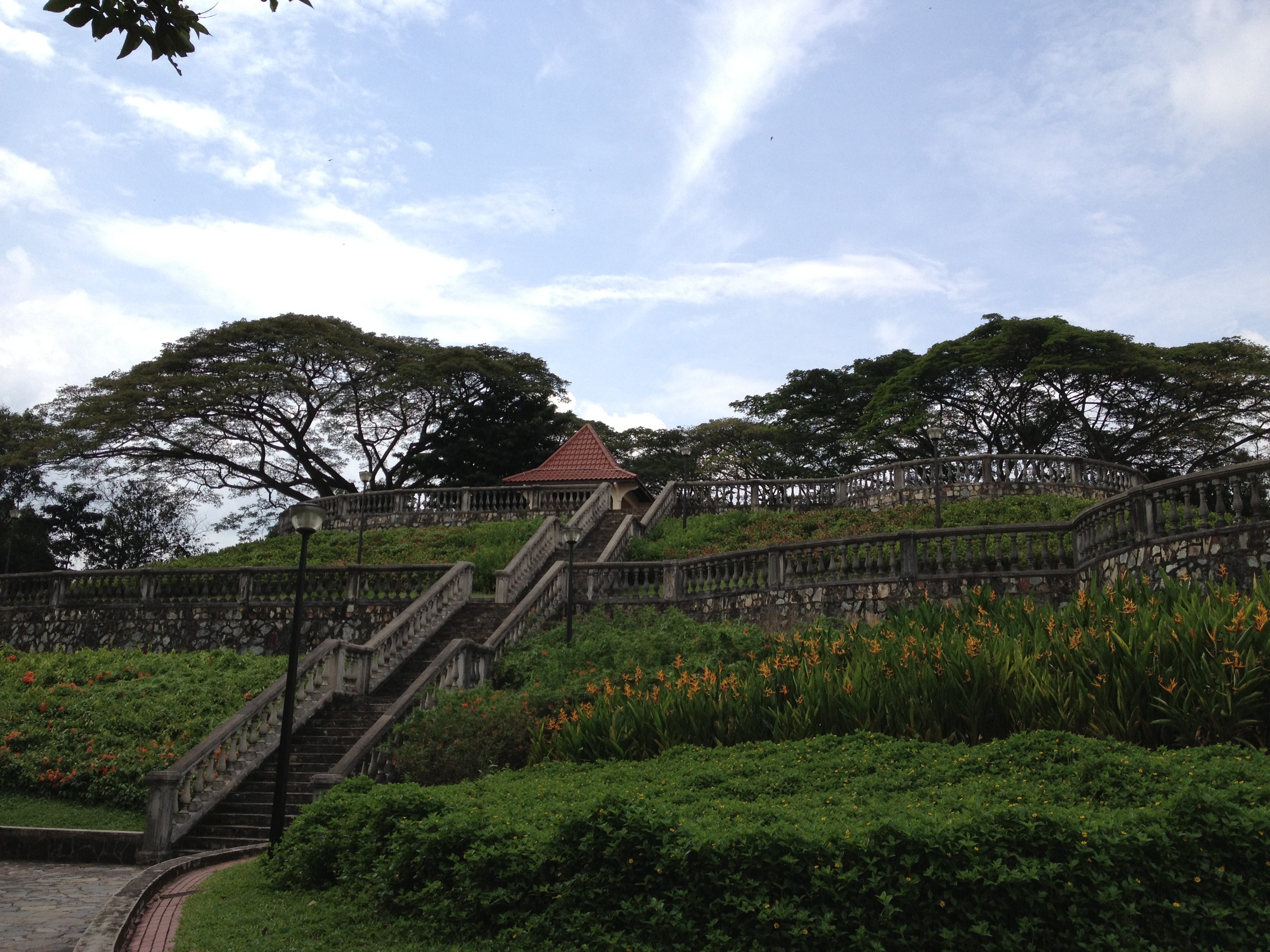 Je poursuis toujours en direction de l’est et gravis soudain un promontoire, appelé ‘Terrace Garden‘, de style romanesque et peu asiatique, tout en étages circulaires avec au sommet une vue splendide presque sur 360 degrés – la mer, les îles, la forêt, les buildings avec ce contraste de la nature abondante avec l’ultra-modernité de la ville. Je m’y pose, laisse le temps à mon souffle de ralentir et à ma température de se rafraîchir …
