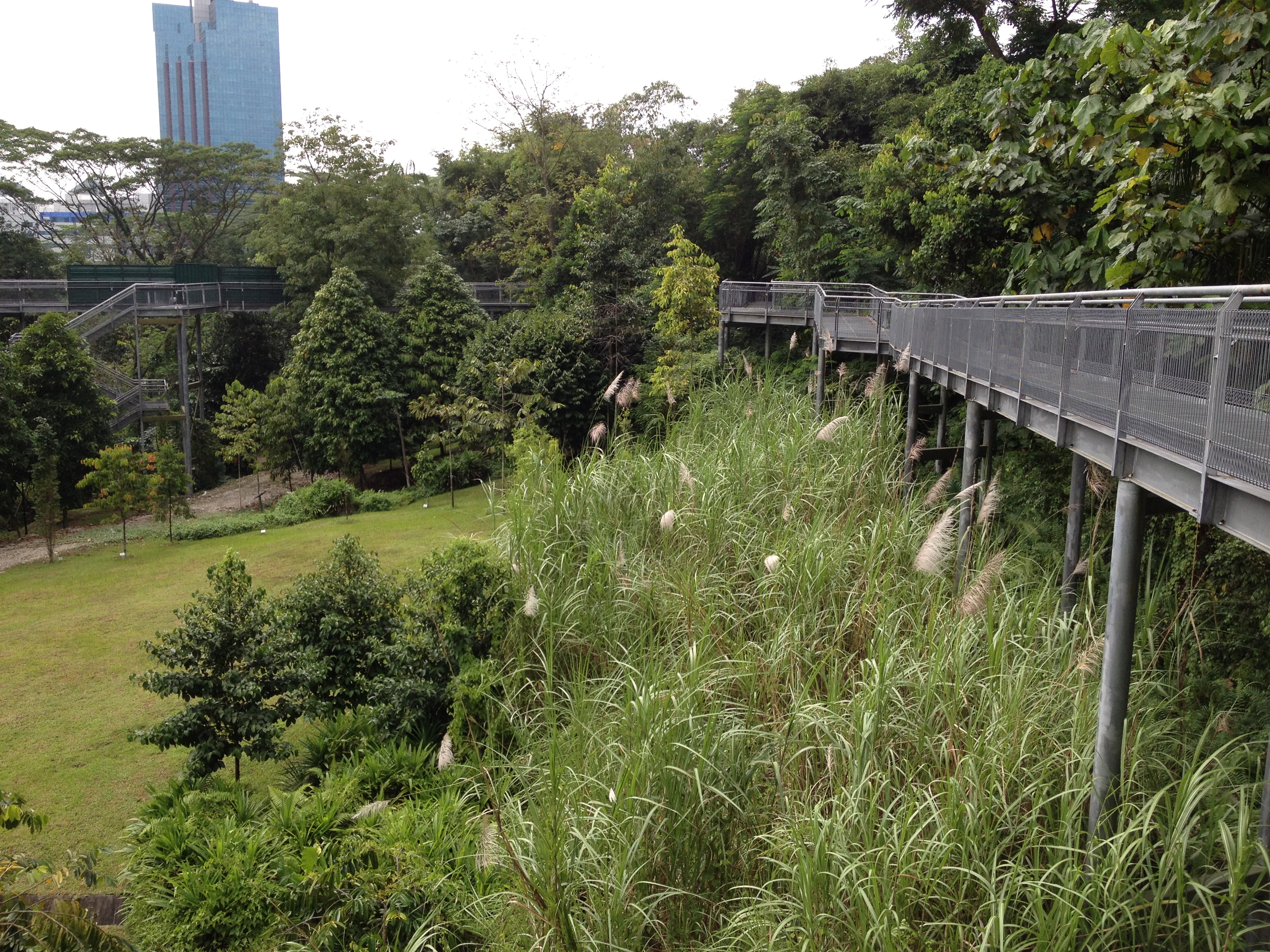 Tous ces parcs sont bien fléchés et l’on passe de l’un à l’autre en suivant les indications PCN (Park Connecting Network). Ainsi je monte, à travers la forêt, la colline face à moi pour retrouver un autre canopy, le premier que j’ai traversé au début de notre séjour – pas très confiante à l’époque – , celui de KentRidge Park. La végétation ici est à nouveau plus dense et plus sauvage ; c’est beau, c’est paisible, il fait très chaud et humide. Encore un petit effort et je sors de la forêt dans le Parc des Sciences, qui se trouve en face de l’hôpital universitaire, de l’autre côté de Buona Vista Road.