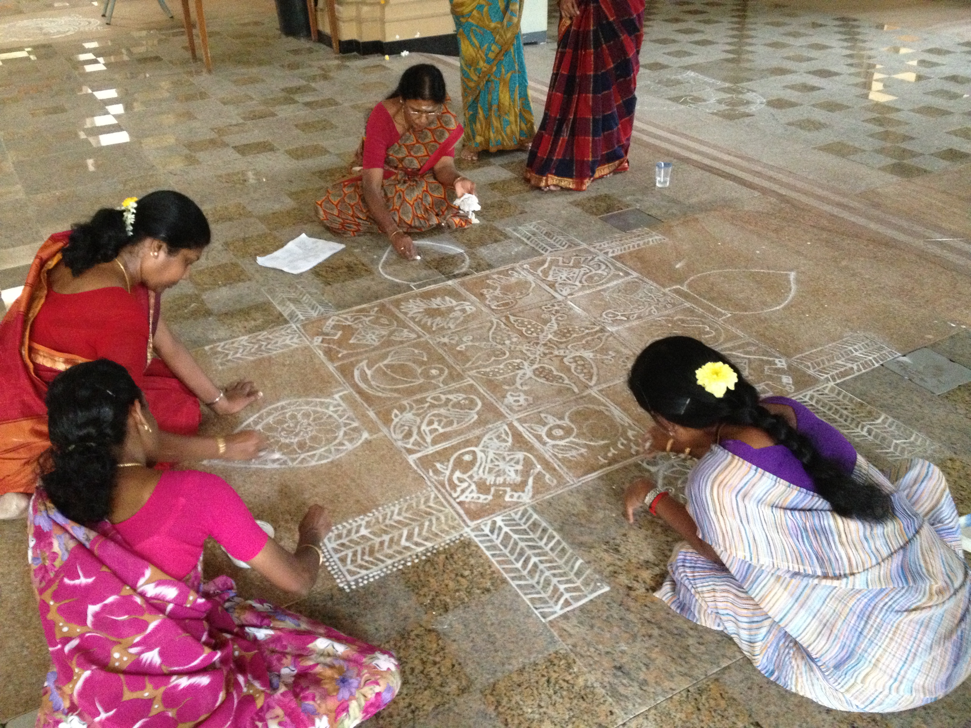 Nous quittons ensuite la rue des magasins sans que Olivier ait fait le moindre achat – il a pris plaisir par contre à sillonner dans un ‘premier’ grand magasin d’électronique. Il préfère marcher plutôt que de prendre le métro et nous voici partis vers le parc présidentiel Istana, puis vers le temple hindou Sri Thendayuthapani qui pour une fois a ses portes grandes ouvertes. Il s’y prépare une fête, des gens s’activent, décorent, des dames à même le sol y font des arabesques, des dessins à la craie blanche liquide avec leurs doigts. On nous laisse photographier, c’est plaisant.