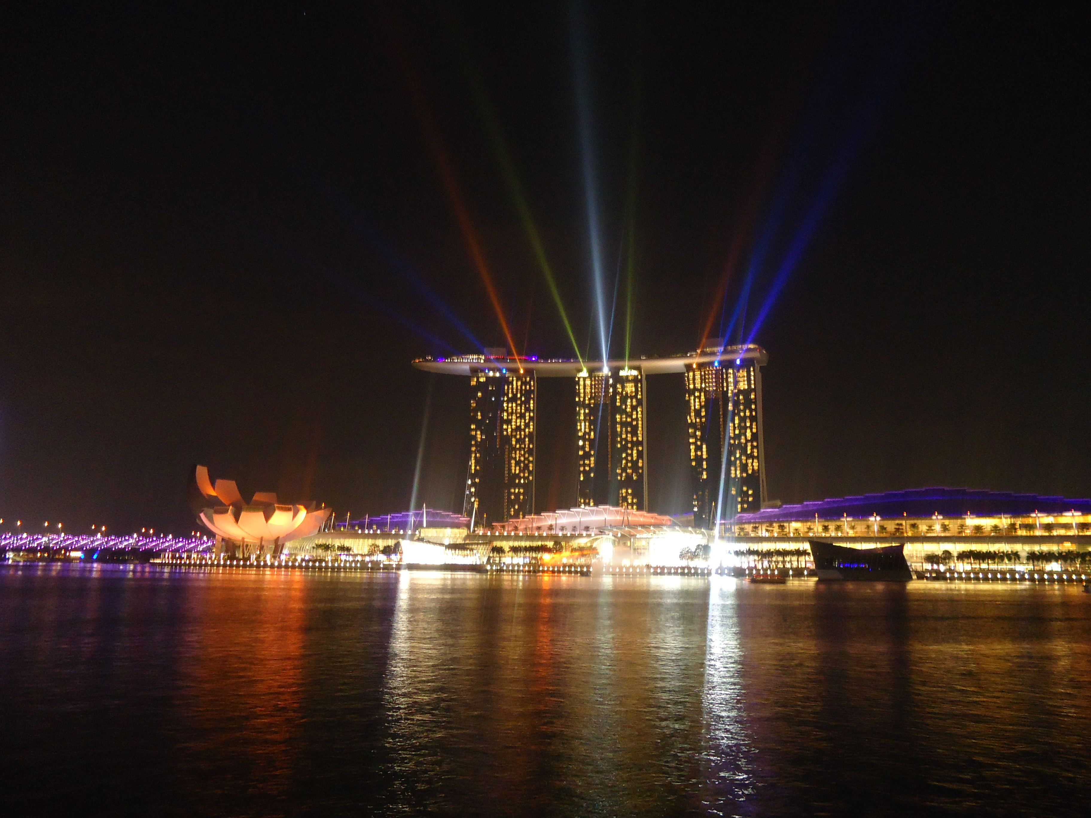 Et c’est l’heure du second Water Light Show de l’autre côté de la baie; attablés à un bar en terrasse – où la serveuse nous prend pour un couple – le spectacle a un attrait tout aussi intéressant, avec les spots situés sur le ‘bateau – tgv’ qui projettent des faisceaux lumineux fascinants, au son de la musique.