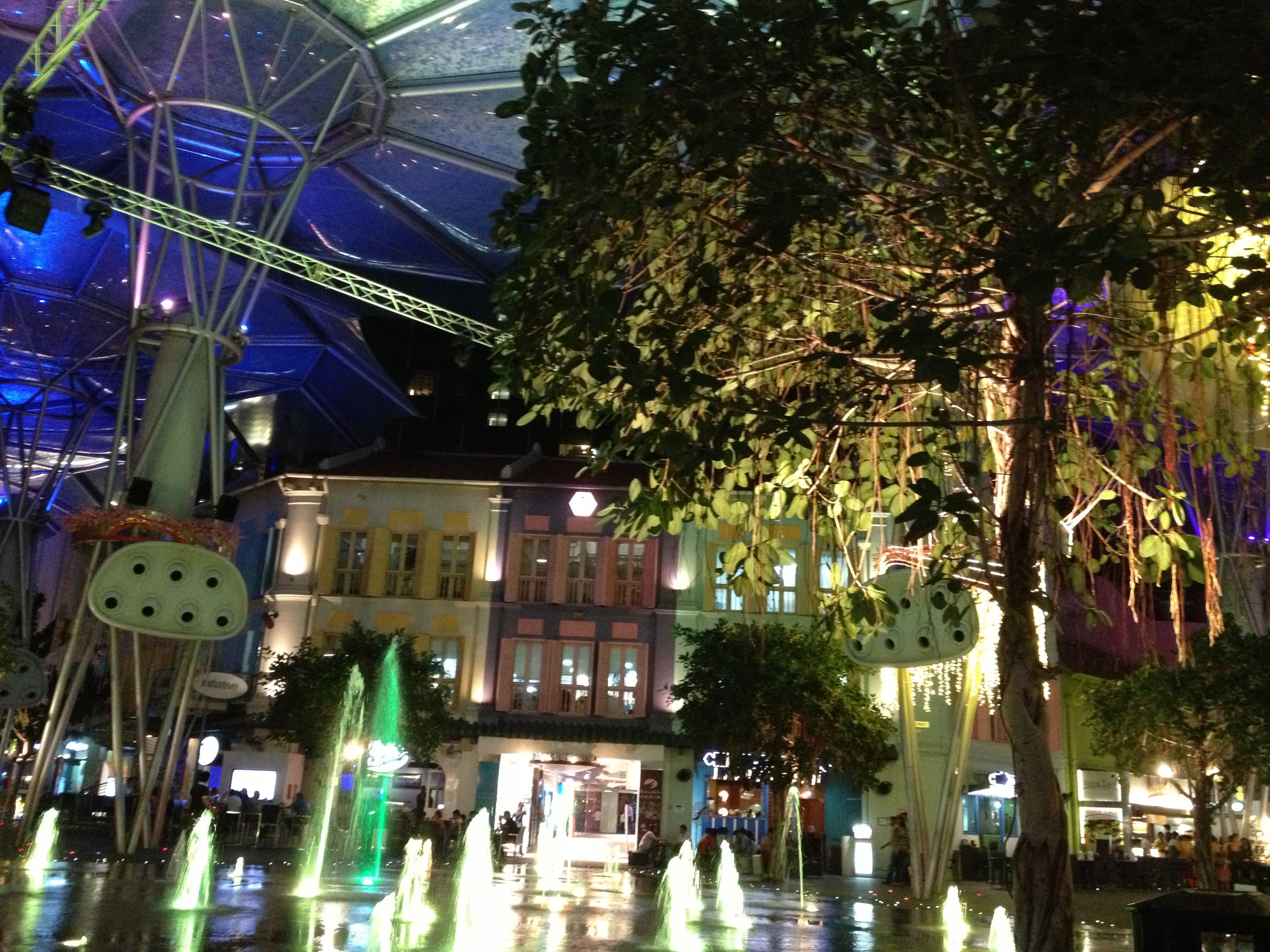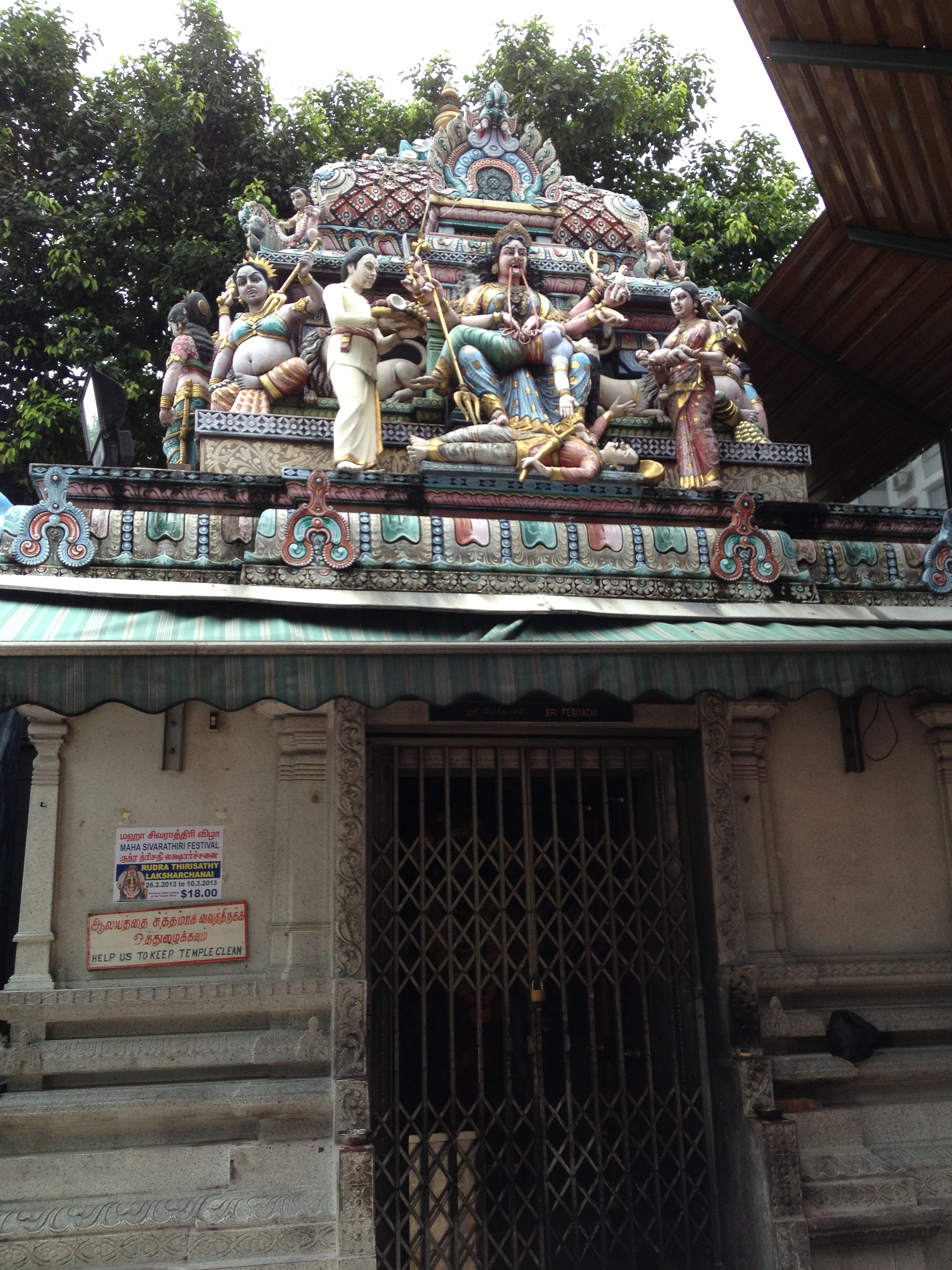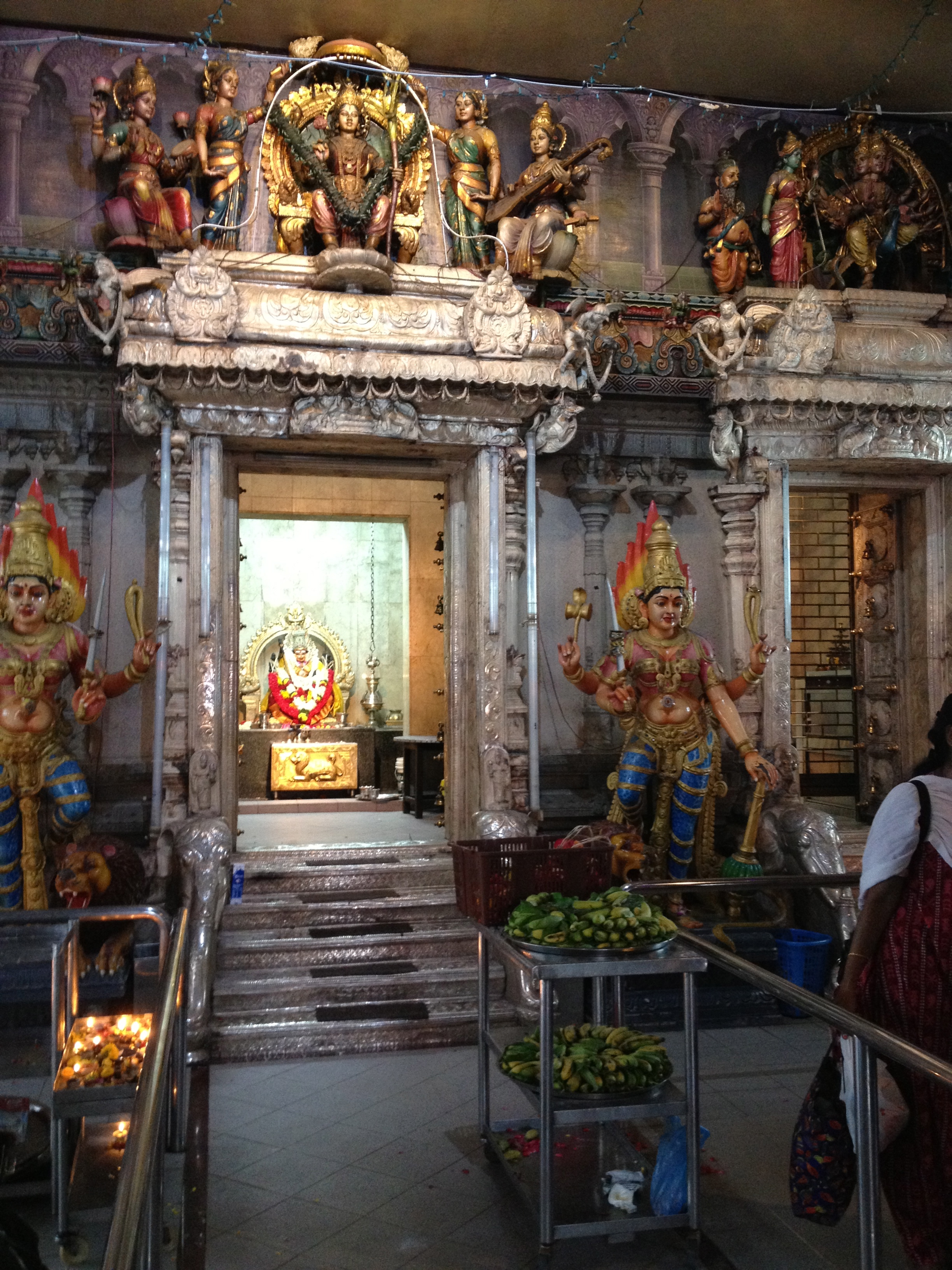 Dès que Anaelle et Mathieu ont émergé, tout étonnés de l’heure … et se sont restaurés, nous partons en vadrouille. L’idée les tente assez de commencer par un centre commercial … ils ont entendu dire que Singapour est la ville du shopping! Et on se perd dans les étages et les contours de VivoCity. Ensuite ce sera l’ambiance colorée, parfumée, enjouée de Little India, qui donne une toute autre image de Singapour. C’est la première fois que je pénètre dans le Temple Sri Veeramakaliamman, qui a longtemps été en rénovation. Ils découvrent qu’un temple ici est un endroit de rencontre, de discussion, de repas, d’offrandes et non seulement de prières … il est très peuplé ce mardi, jour particulier des cérémonies d’adoration qui débutent par le tintement des clochettes à l’entrée.