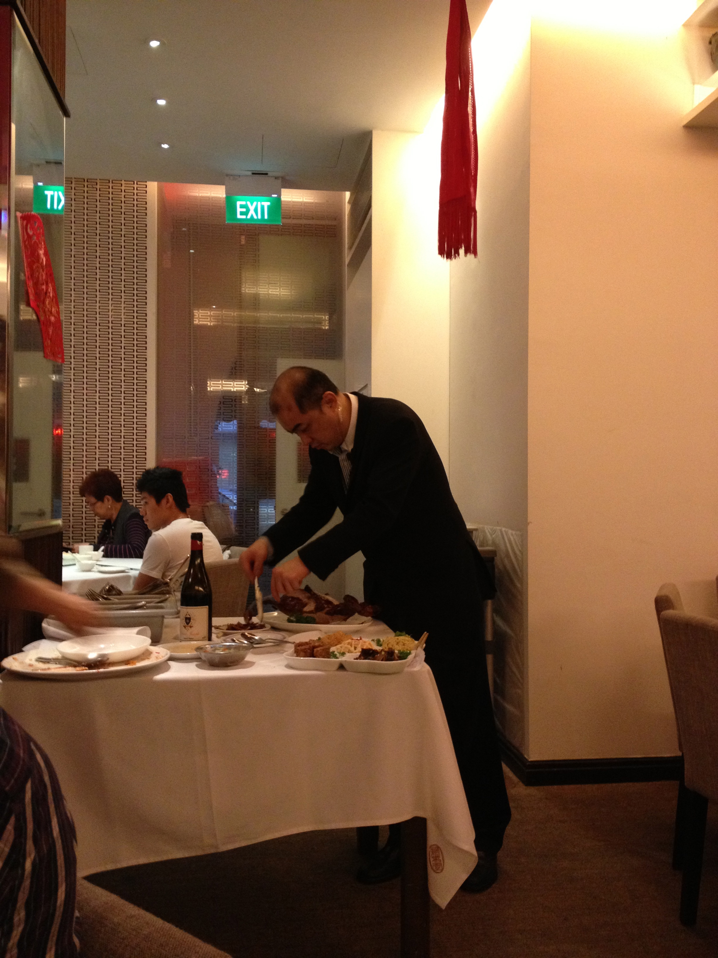 Je suis parvenue à réserver le Pekin Duck au Spring Court pour ce soir; le chauffeur de taxi s’étonne que nous connaissions cette adresse, surtout fréquentée par des chinois … il s’inquiète de savoir si nous avons une réservation, car c’est Chinese New Year, nous dit-il … comment l’ignorer? Il nous confirme que c’est la meilleure adresse en ville pour ce délicieux canard laqué. Nous y sommes reconnus; nous garnissons la table d’autres plats comme du porc aigre-doux, des crevettes panées … Aux tables voisines, les chinois pratiquent cette tradition du grand plat de choux et autres légumes, que tous les convives mélangent ensemble en se souhaitant le meilleur pour 2013!