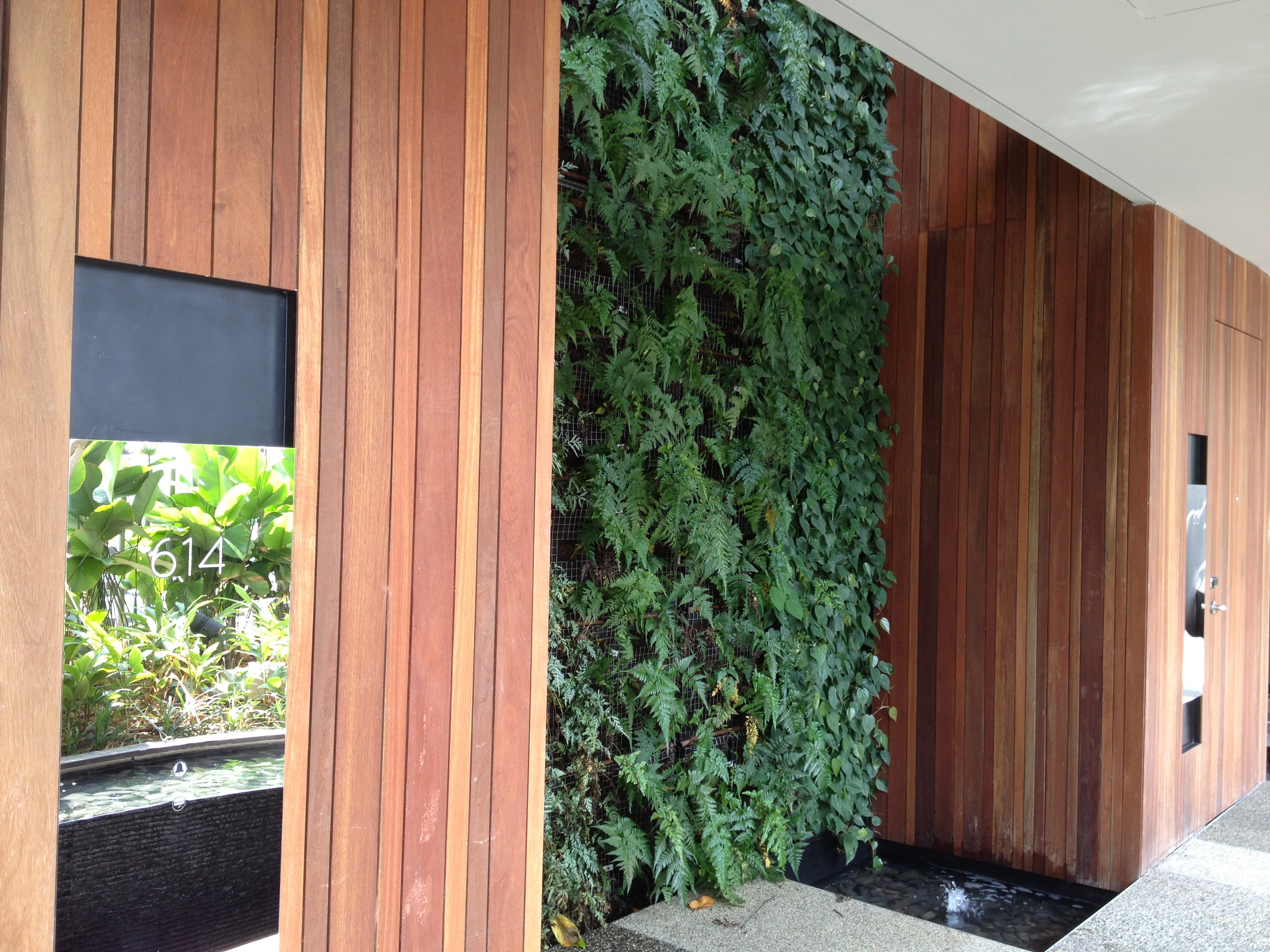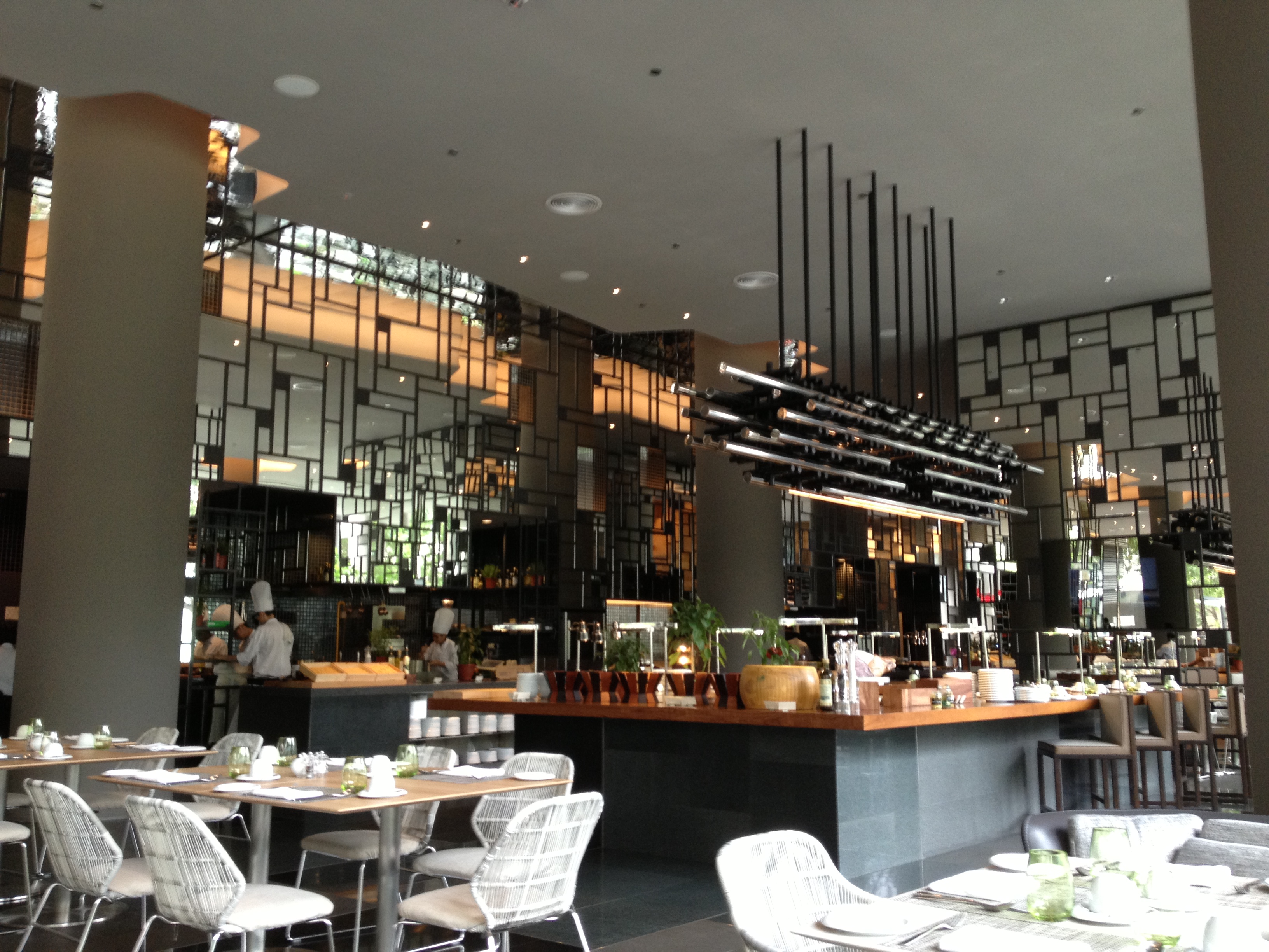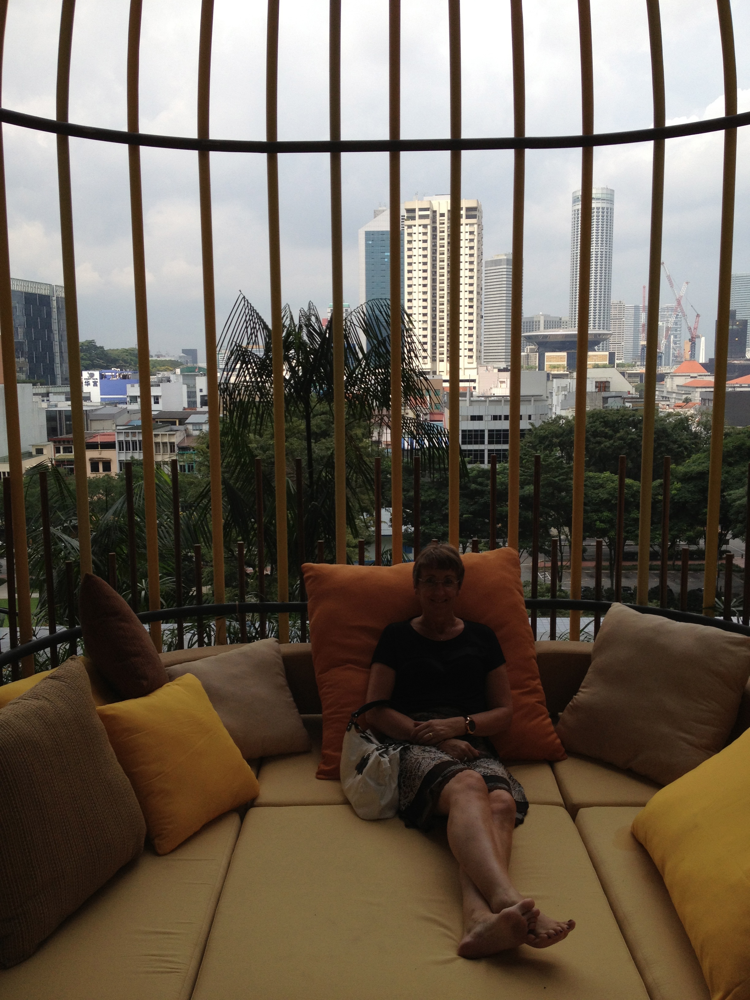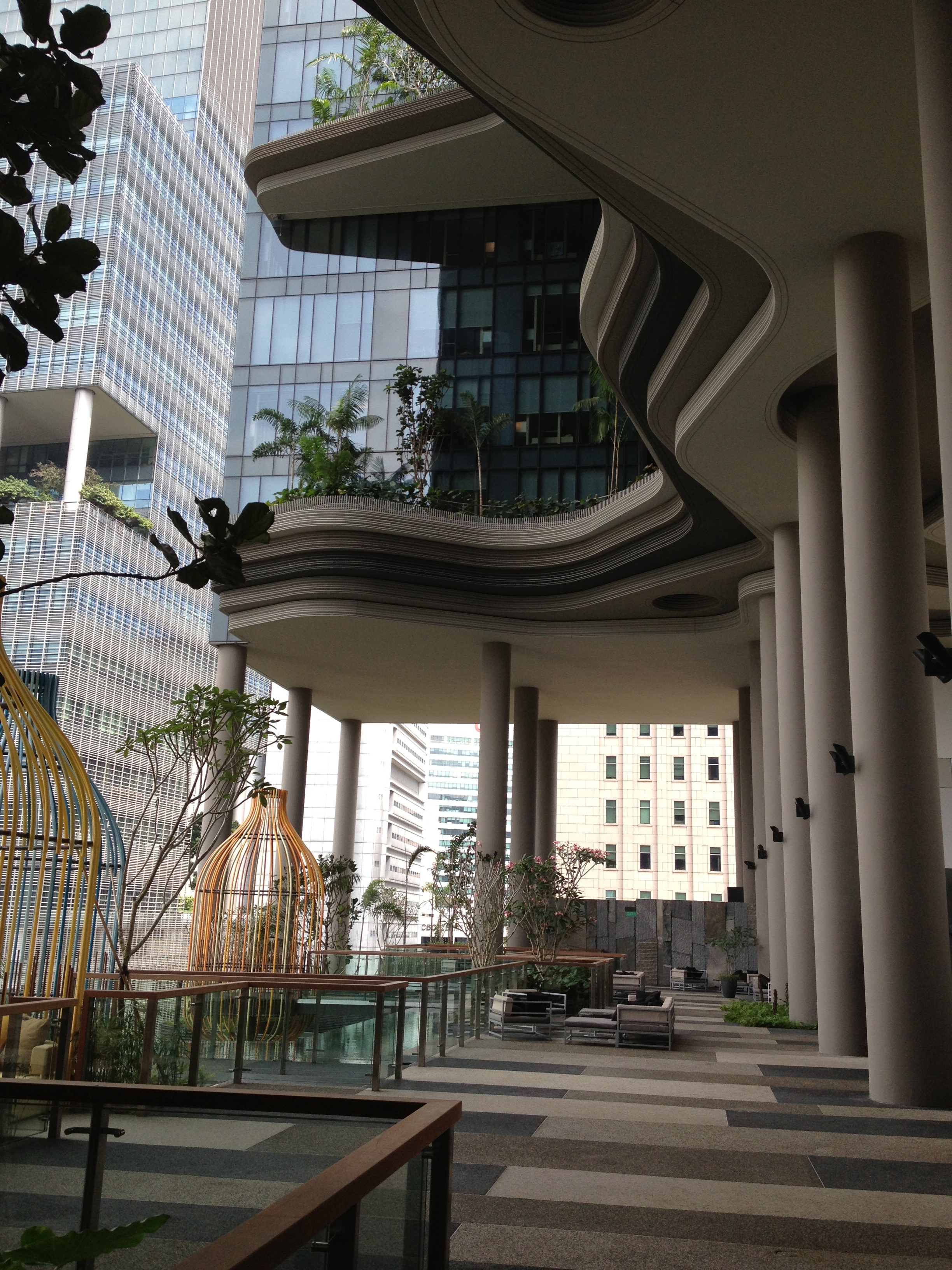 Depuis que nous sillonnons Singapour, nous avons pu admirer l’avancement d’un bâtiment super original sur Upper Pickering; les architectes ont créé ici une œuvre hors du commun. Le bâtiment est imposant mais en même temps aéré, avec de la végétation bien haut dans des espaces troués et ce qui de loin ressemble à des cages à oiseaux sont des nacelles où se reposer au bord de la piscine … piscine débordante, impressionnante aussi. Ce fut une bonne surprise quand je me suis rendu compte que ce serait un hôtel et non un immeuble administratif ou locatif. L’offre booking de lancement était trop tentante que pour résister … Nous sommes tous sous le charme du design et de la technologie – qui par exemple facture directement une boisson prise dans le mini-bar dès qu’elle est soulevée trente secondes. Les murs de verdure qui mènent aux chambres donnent l’impression de vie, de fraîcheur ainsi que les bassins d’eau longeant les corridors. Tout sent le beau, le propre, le neuf … Les miroirs donnent partout une impression fuyante des dimensions, les parois de bois ondulés font penser à des vagues, les superpositions de plaques rainurées font dire à Yves que les architectes aiment les maquettes en bois contreplaqué.