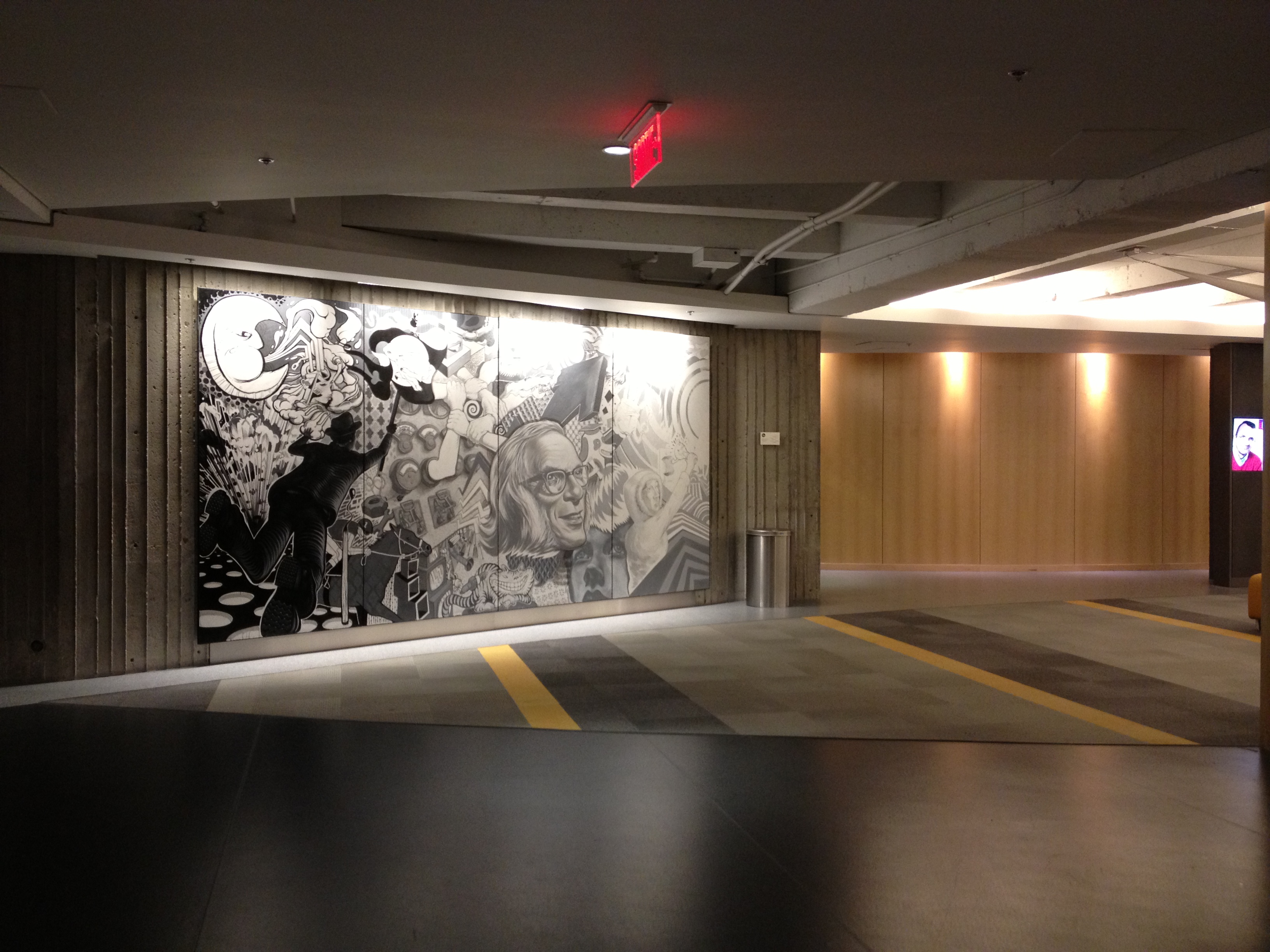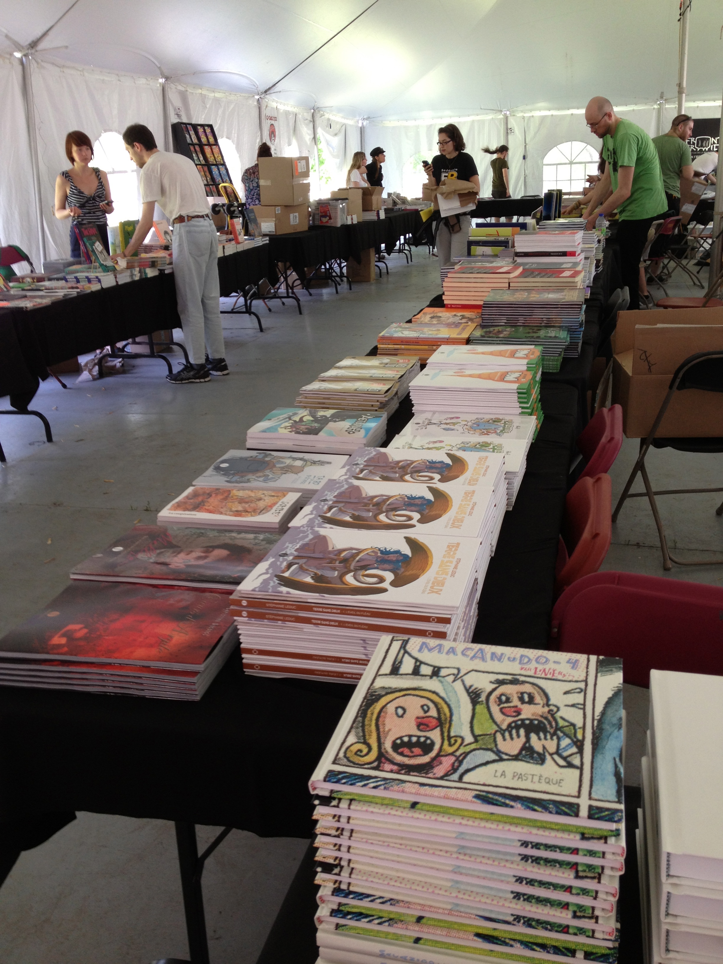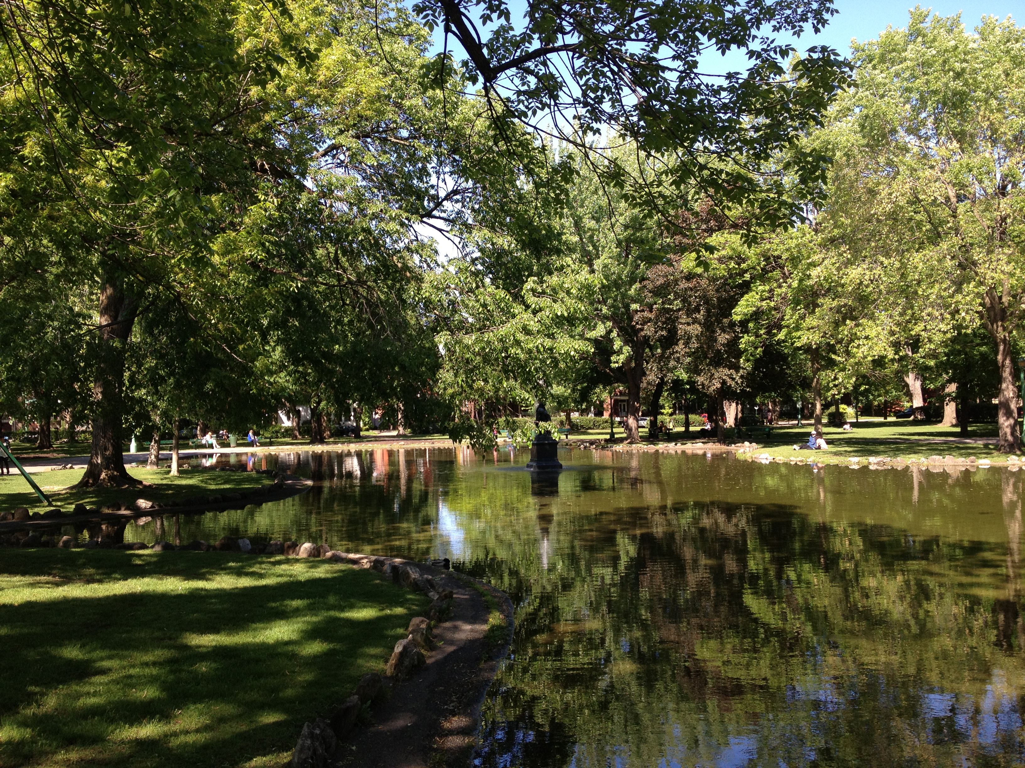 La fraîcheur je la cherche à l’ombre des beaux arbres du parc La Fontaine, aménagé sur les terrains d’une ancienne ferme d’une grande famille écossaise. C’est un véritable lieu de rencontre, de balade, d’activités comme le tennis, le base-ball, le beach-volley. Des classes y pratiquent leur sport tandis que les vélos, les rollers, les promeneurs circulent sur les sentiers. Mais pourquoi donc Montréal a-t-elle choisi cette période pour assécher ses lacs d’agrément? Pas de chance, les deux lacs artificiels ici sont en cours de nettoyage des algues … c’est nettement moins joli et les pauvres canards ne doivent eux non plus pas être très contents. Ma récompense sera de découvrir l’installation du Festival de la BD où j’emmènerai Yves demain.