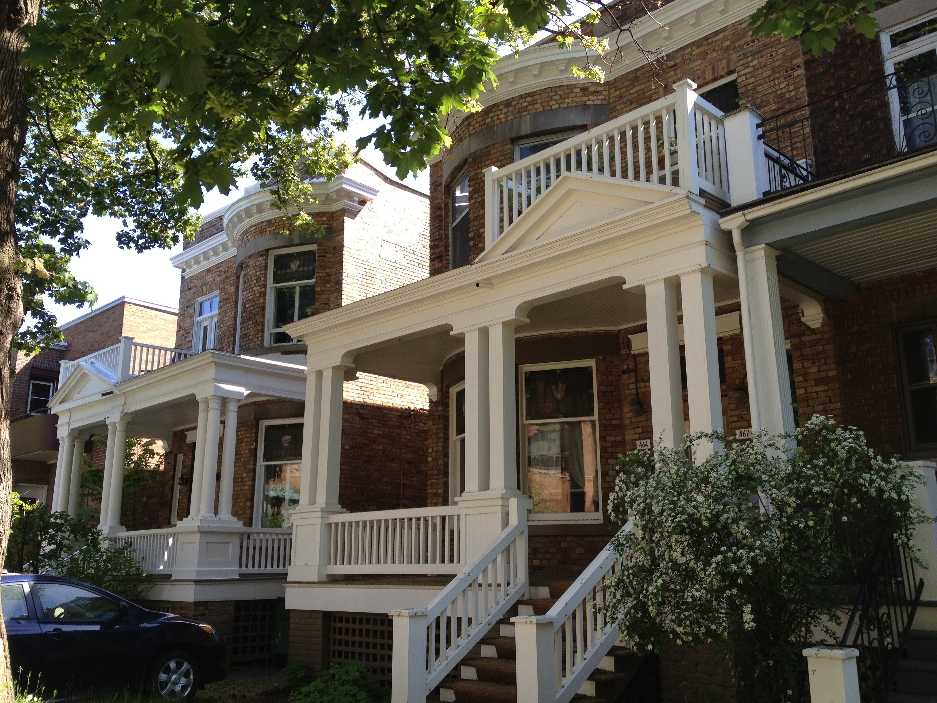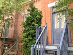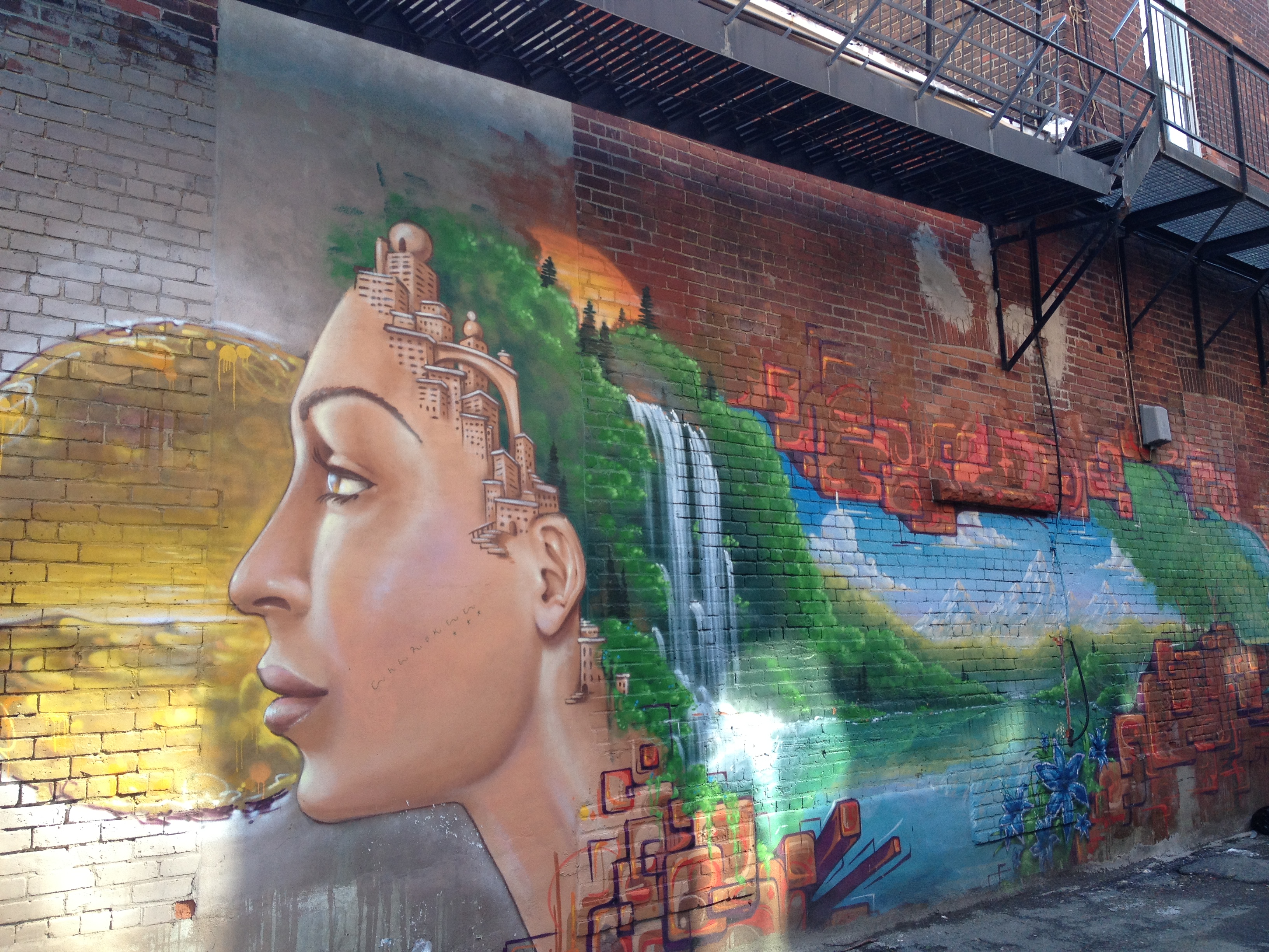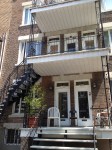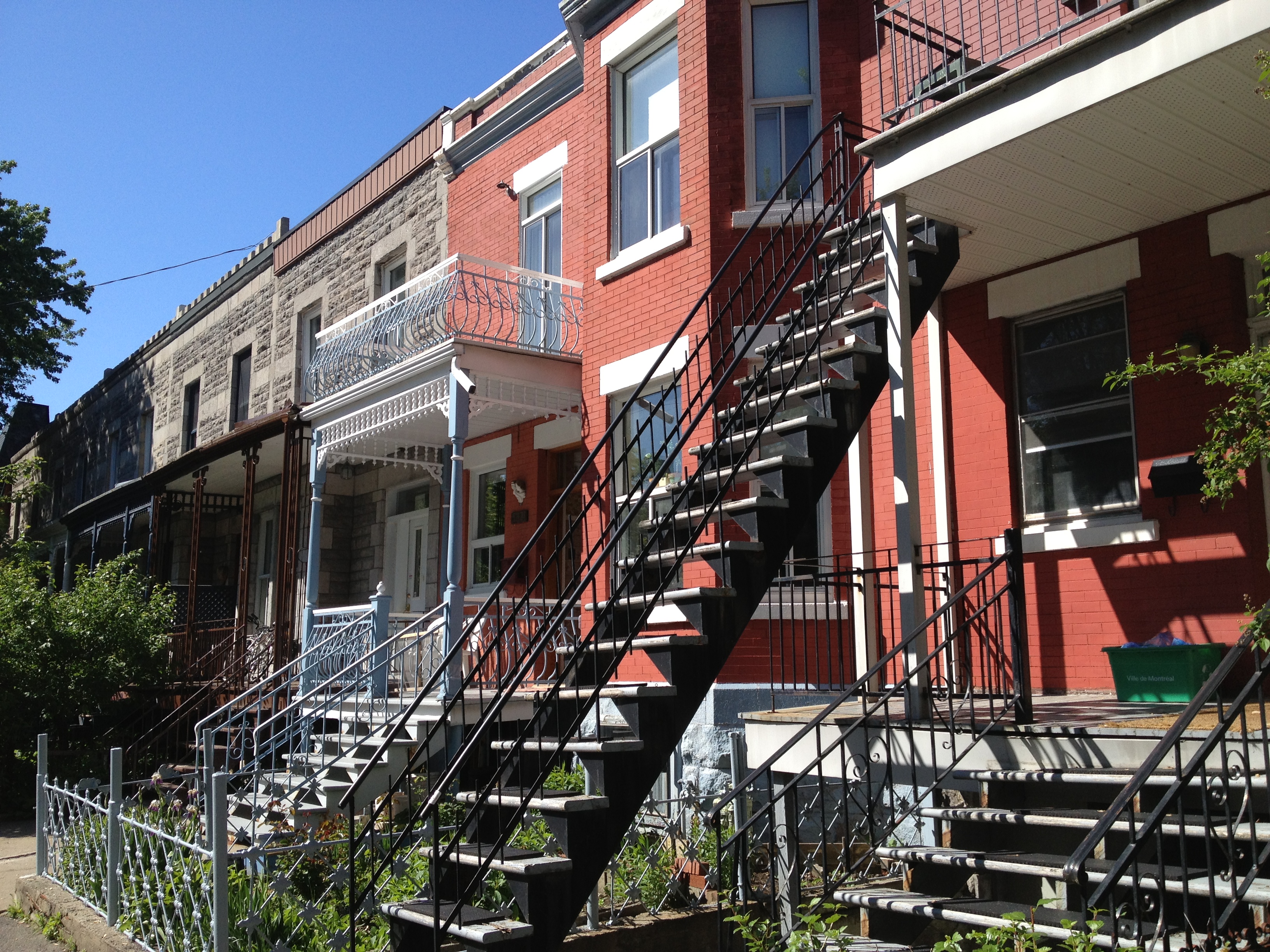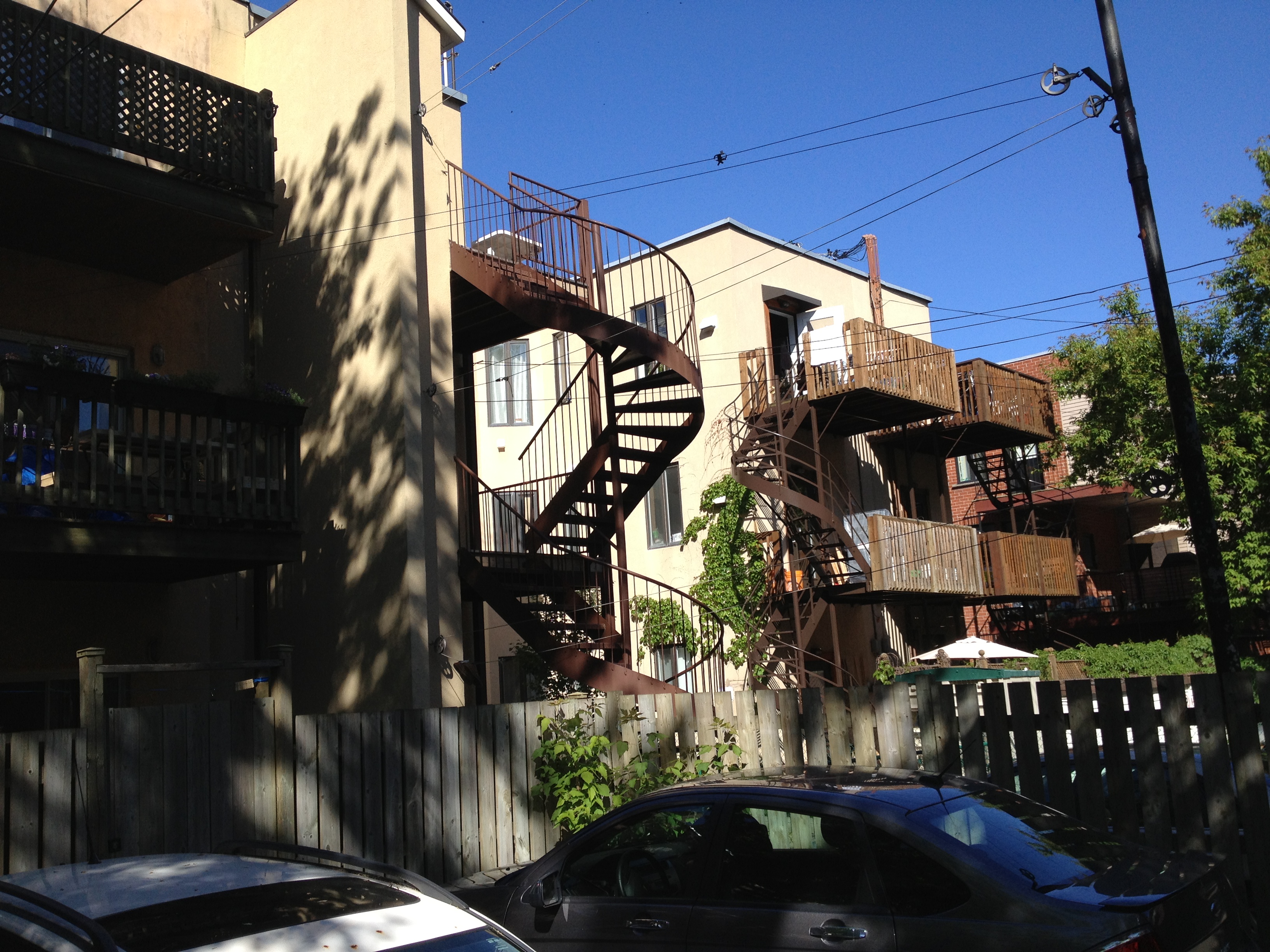 Après deux jours dans mon quartier, je repars en exploration, cette fois vers le Plateau. Il était au départ le coin des vieilles familles ouvrières francophones et ensuite il fut recherché par les artistes, les intellectuels et plus récemment par les jeunes professionnels. Des avenues animées le cernent avec commerces, bistrots, galeries mais dès que je flâne dans les rues centrales du quartier, je trouve une quiétude, accentuée par cette verdure abondante. Les habitations, aux façades colorées, sont ici très typiques, des duplex ou triplex, étroits et allongés auxquels on accède par des escaliers extérieurs aux contours amusants et sur la largeur de ce qui serait une bonne maison, on trouve quatre ou cinq logements, tous accessibles par une porte à la rue, individuelle. Entre deux rues d’habitations de ce type, je m’immisce parfois indiscrète dans la petite ruelle qui reçoit les faces plus privées, également avec des escaliers courbés, des petits jardins, des terrasses dans les étages. Je me situe sur la rue St. Denis dans sa partie supérieure, la rue Fabre ou Cherrier, la rue Duluth que j’aime beaucoup. Ce qui me fascine et attire de suite mon regard, ce sont ces grandes peintures sur les pignons des maisons; certaines sont de vraies œuvres d’art et aujourd’hui je suis gâtée.