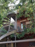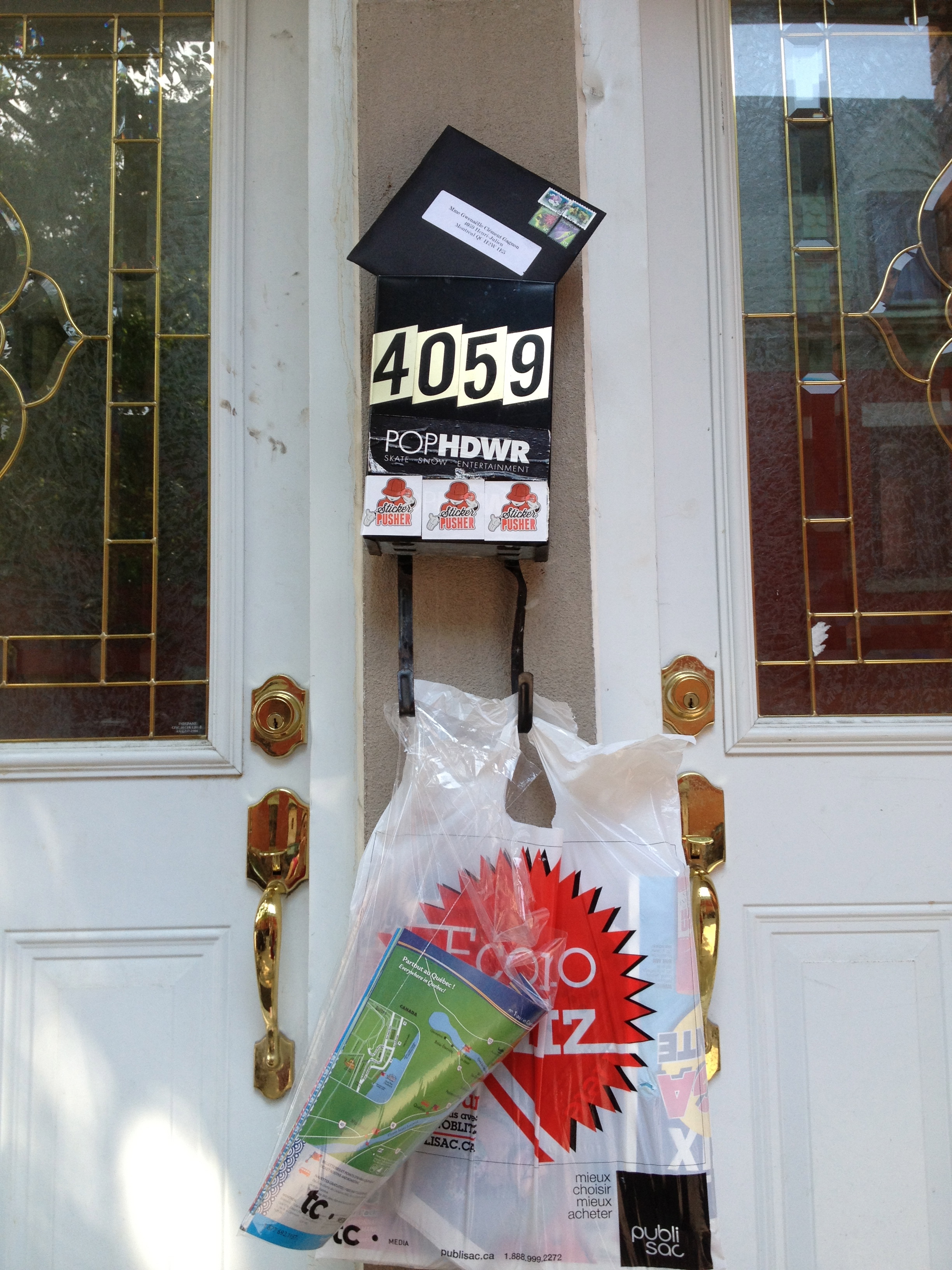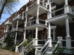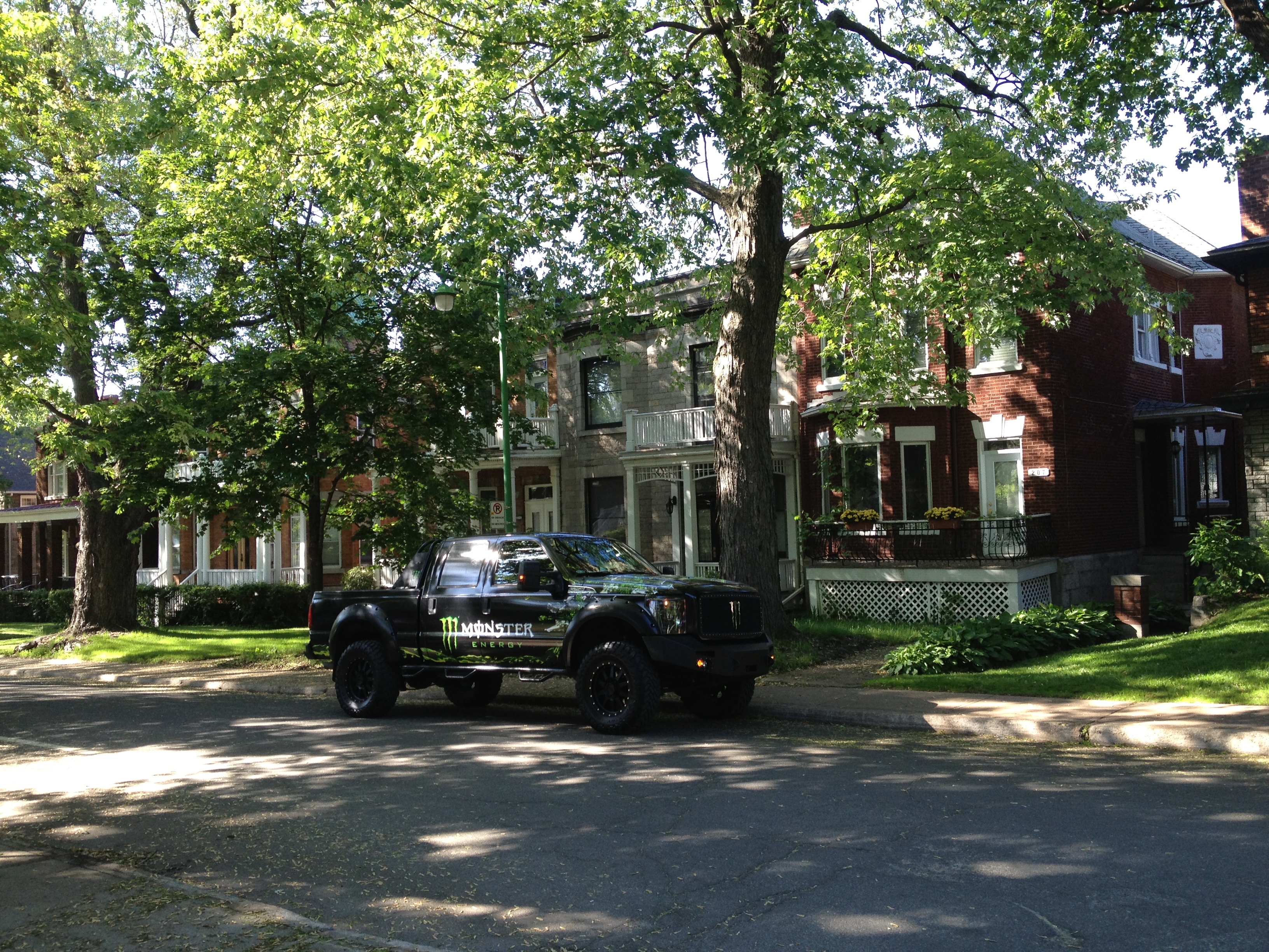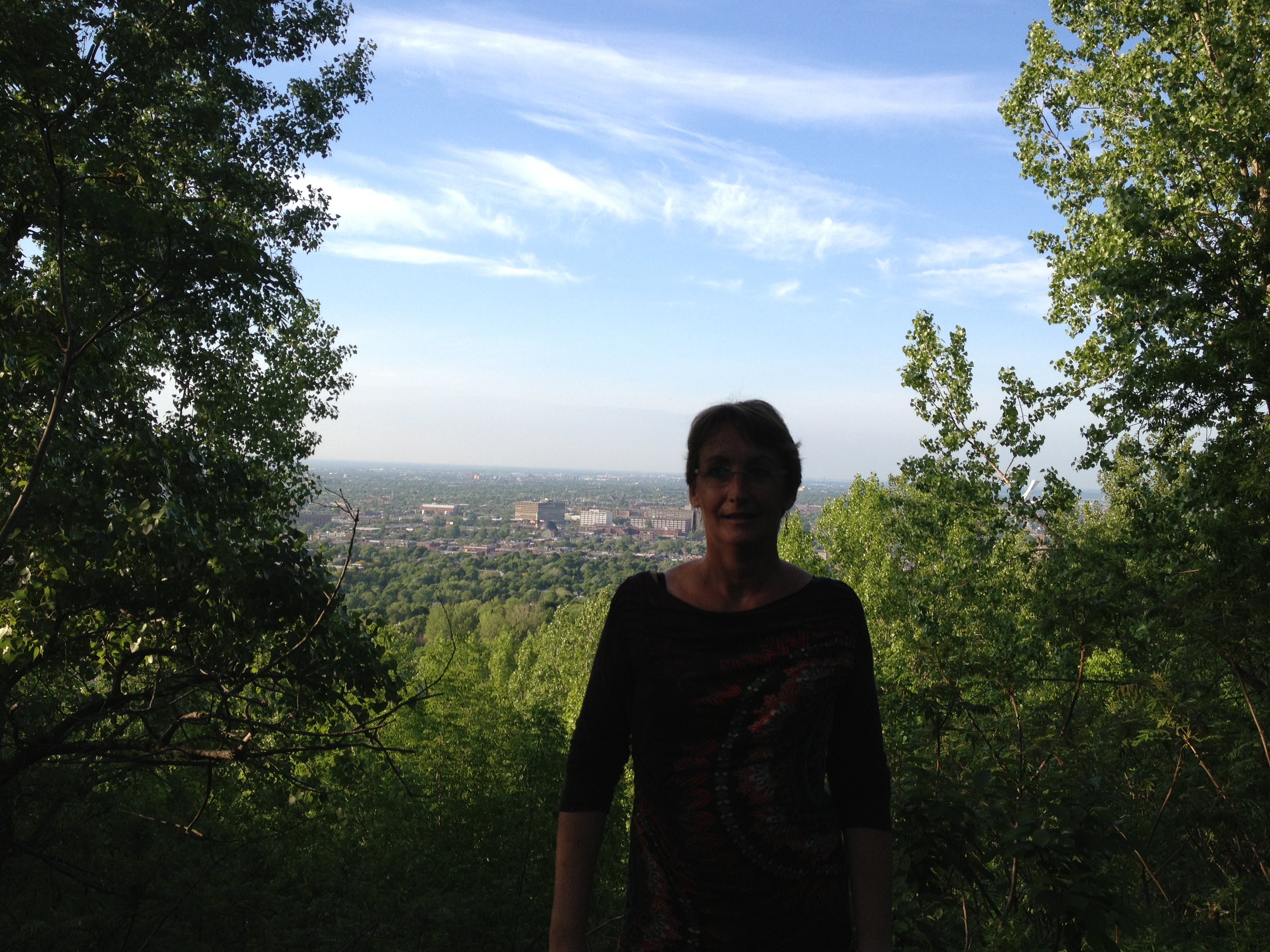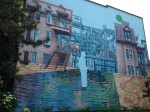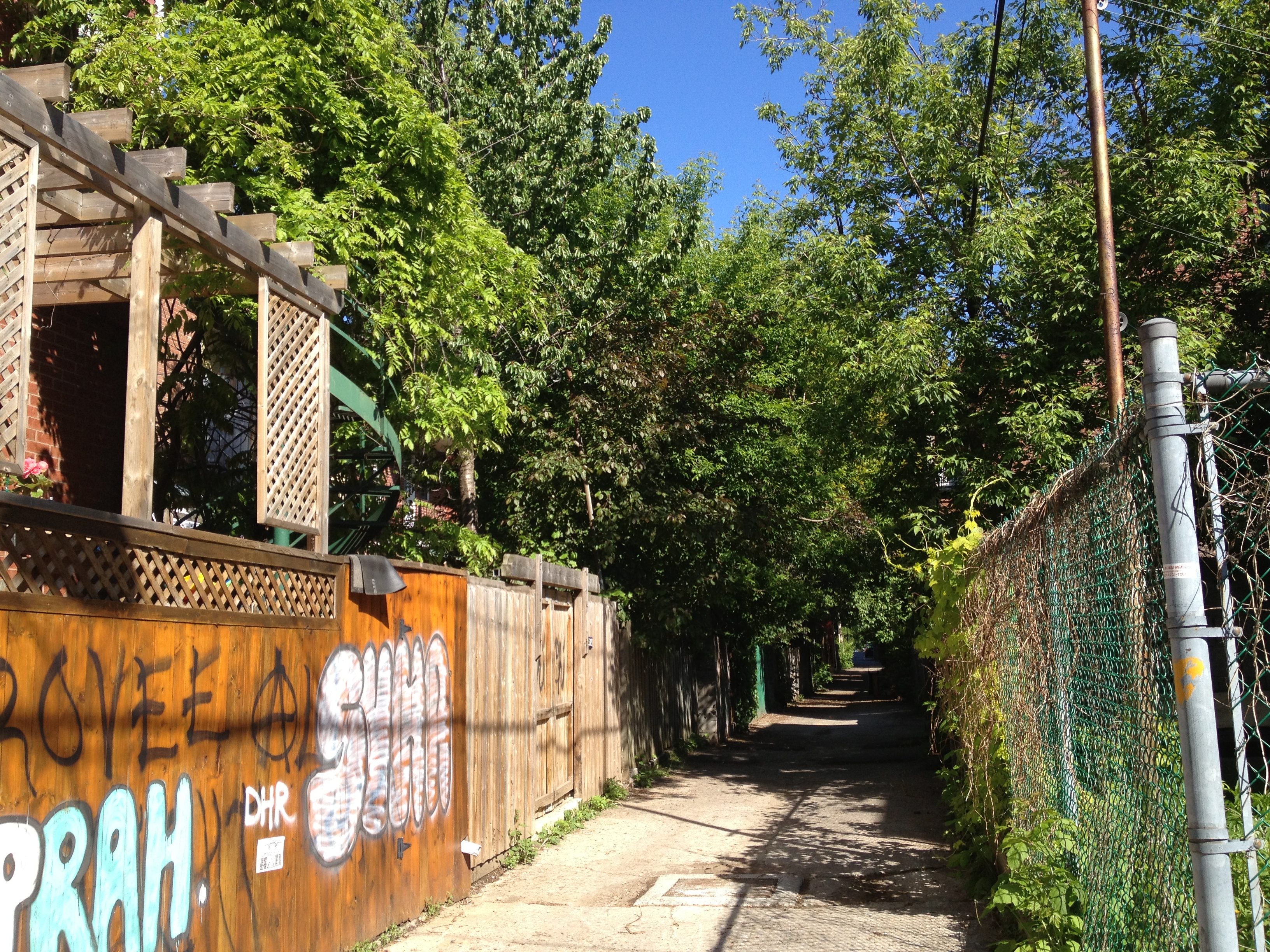 Après deux jours dans mon quartier, je repars en exploration, cette fois vers le Plateau. Il était au départ le coin des vieilles familles ouvrières francophones et ensuite il fut recherché par les artistes, les intellectuels et plus récemment par les jeunes professionnels. Des avenues animées le cernent avec commerces, bistrots, galeries mais dès que je flâne dans les rues centrales du quartier, je trouve une quiétude, accentuée par cette verdure abondante. Les habitations, aux façades colorées, sont ici très typiques, des duplex ou triplex, étroits et allongés auxquels on accède par des escaliers extérieurs aux contours amusants et sur la largeur de ce qui serait une bonne maison, on trouve quatre ou cinq logements, tous accessibles par une porte à la rue, individuelle. Entre deux rues d’habitations de ce type, je m’immisce parfois indiscrète dans la petite ruelle qui reçoit les faces plus privées, également avec des escaliers courbés, des petits jardins, des terrasses dans les étages. Je me situe sur la rue St. Denis dans sa partie supérieure, la rue Fabre ou Cherrier, la rue Duluth que j’aime beaucoup. Ce qui me fascine et attire de suite mon regard, ce sont ces grandes peintures sur les pignons des maisons; certaines sont de vraies œuvres d’art et aujourd’hui je suis gâtée.