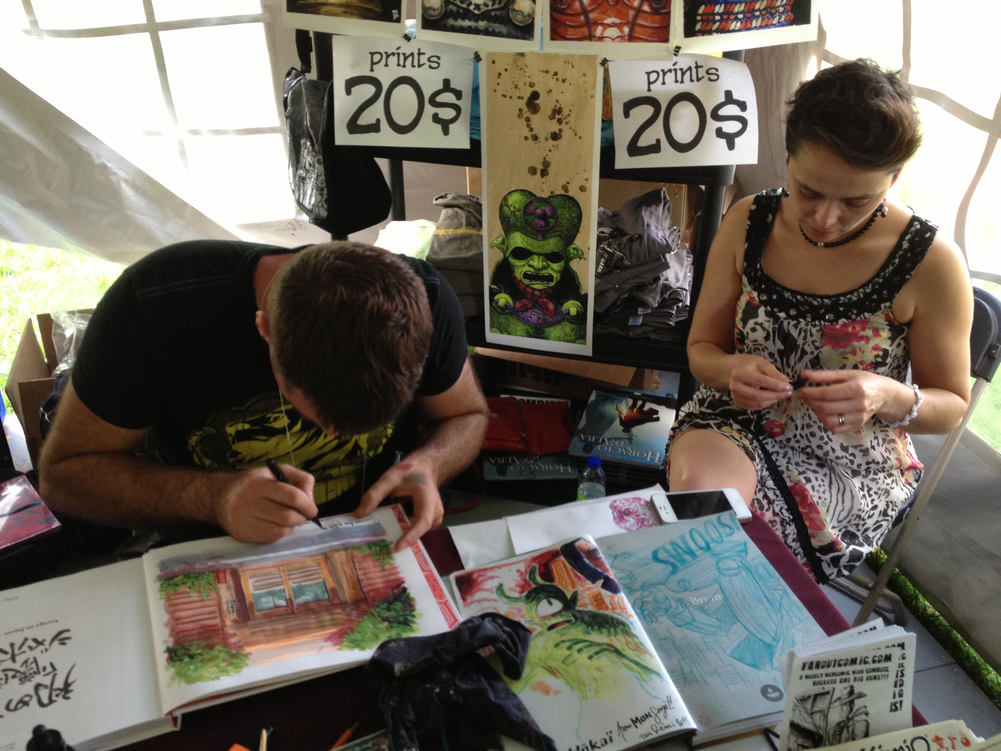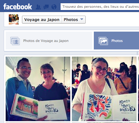 Enfin – se dit Yves – nous atteignons la tente d’exposition des BDs. C’est un festival jumelé avec celui de Lyon, pour sa seconde édition et qui attire de nombreux passionnés. Coup de foudre pour un livre bande dessinée sur Tokyo – le Japon nous poursuit – et pendant la magnifique dédicace de son auteur, nous entamons une longue et intéressante discussion avec Sandrine et Rémi, le jeune couple marseillais qui a réalisé ce splendide ouvrage, souvenirs de leur voyage de noce. Eux aussi sont tombés amoureux du Japon, nous échangeons à n’en plus finir et … une heure plus tard, nous serons en photo sur leur page Facebook!