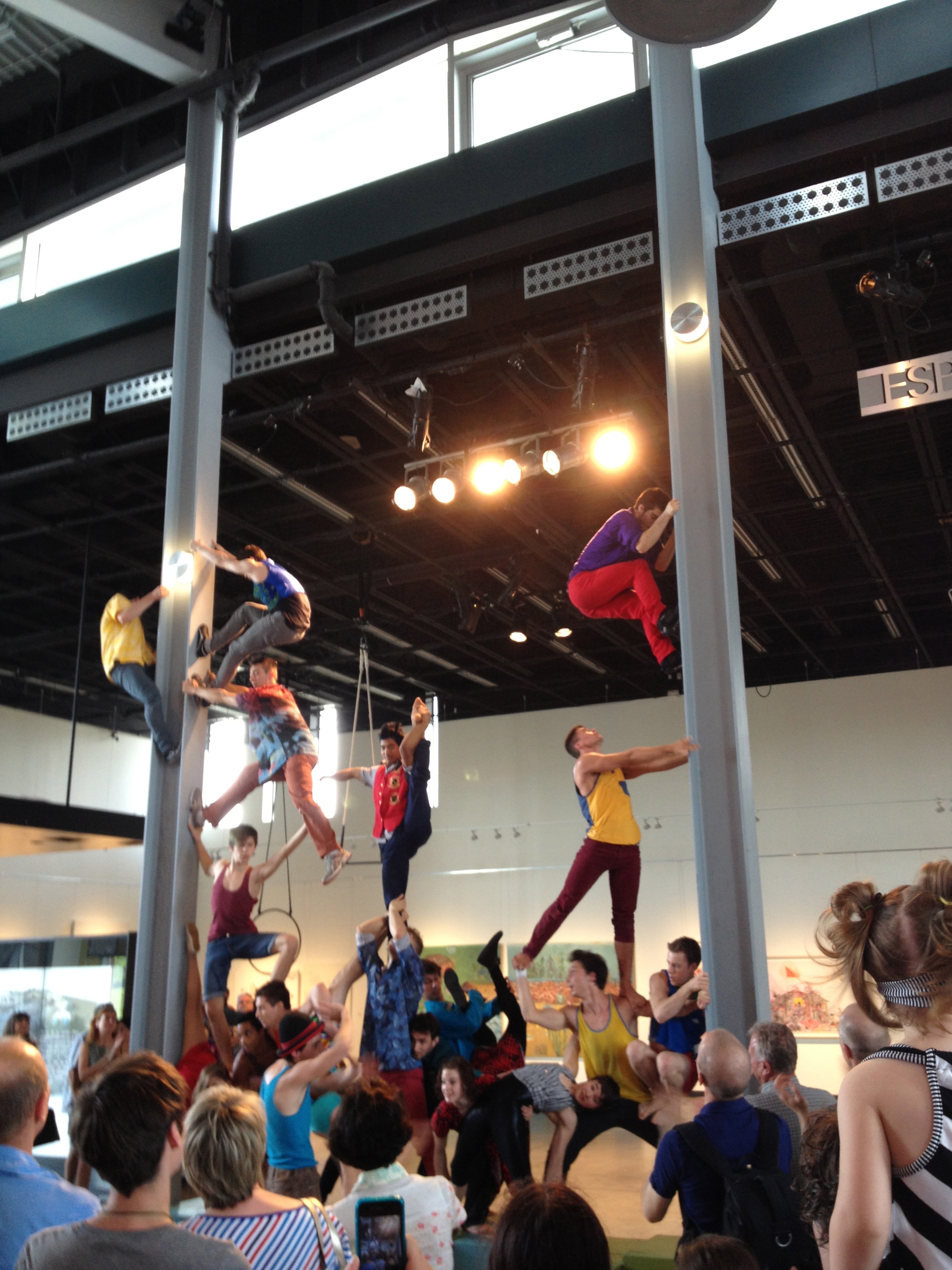 Édifié en 2004, une énorme construction circulaire, appelée TOHU, abrite une salle de spectacle pouvant accueillir mille-sept-cents spectateurs où sont programmés des cirques du Québec et du monde entier. Nous sommes heureux de trouver ici la porte ouverte et encore plus heureux de nous mêler à la foule qui s’anime devant des jeunes qui donnent un spectacle dans le hall; vif, sous une musique entraînante, de l’acrobatie juste sous nos yeux! Des gens près de moi on en main des billets pour un spectacle et en moins de cinq minutes, je parviens à dénicher deux places pour la représentation qui débute tout soudain de ‘Pour le meilleur et pour le pire‘. Quelle chance … la magie opère sur les adultes et sur les enfants nombreux, captivés par tout un spectacle qui est construit comme une chorégraphie, sur le thème du mariage, de la fête, de la déception, de la jalousie, de la timidité … tout en blanc, en voile, en pureté. Ce sont des acrobates et des artistes prodigieux, dont le travail quotidien doit être intensif; Alain Francoeur est le concepteur et metteur en piste de ce spectacle où nous admirons des performances folles aussi bien à la roue, qu’au mât chinois aussi rapide que mes petits écureuils, à la corde ou au fil de fer qui donne des frissons, la jonglerie avec des anneaux et un parapluie très drôle, les clowns qui font beaucoup éclater de rire les petits, et la féerie du cerceau aérien et du duo de trapèze qui sont probablement mes préférés. Un moment très fort sur fond de musiques et de chansons connues.