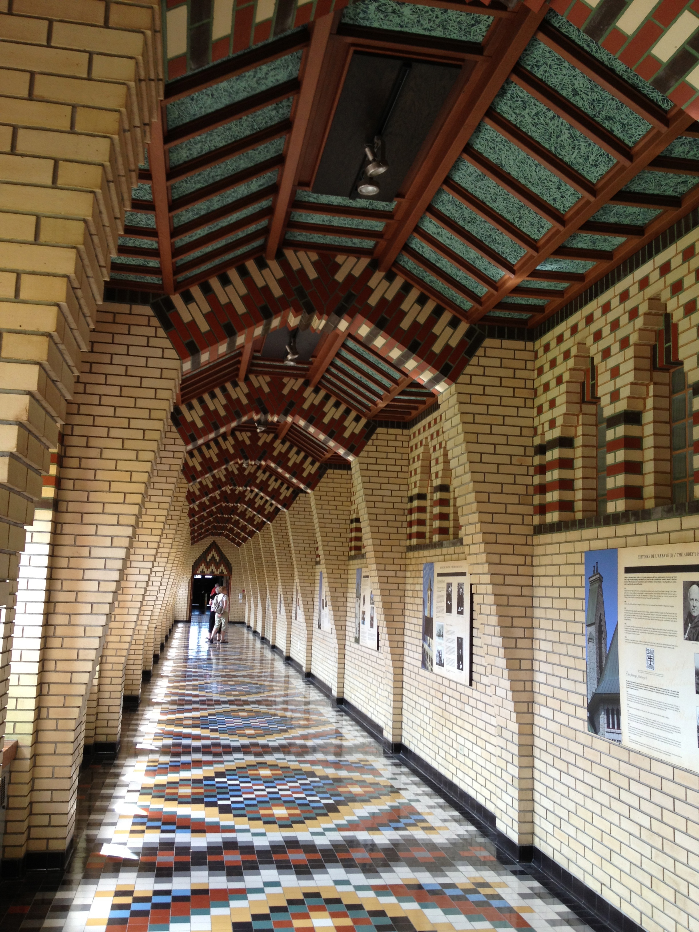 Une dizaine d’années plus tard, le monastère est élevé au rang d’abbaye, il compte soixante moines et des soutiens financiers vont permettre d’ajouter un clocher, l’hôtellerie et la crypte de l’église abbatiale, dessinés par un disciple de Dom Bellot, le moine architecte Dom Côté. C’est lui qui a eu l’idée de colorer les joints entre les pierres de l’édifice, ce qui est assez surprenant et se remarque de suite. Les couleurs sont d’ailleurs très présentes dans le choix des briques et des carrelages du corridor que l’on peut encore traverser, un vrai damier.