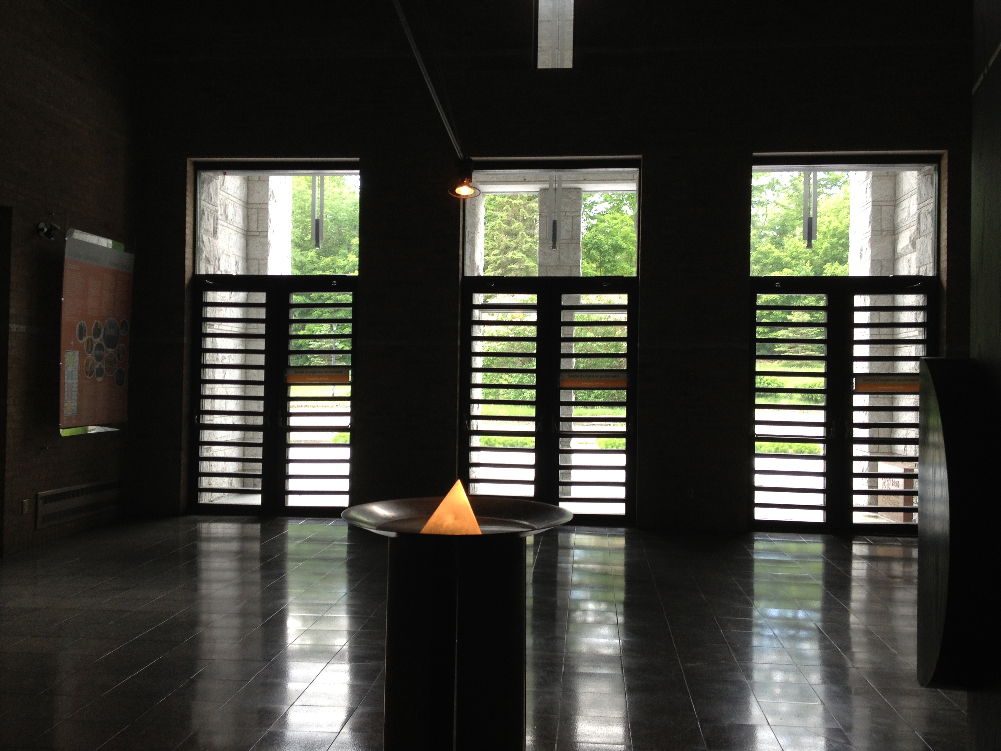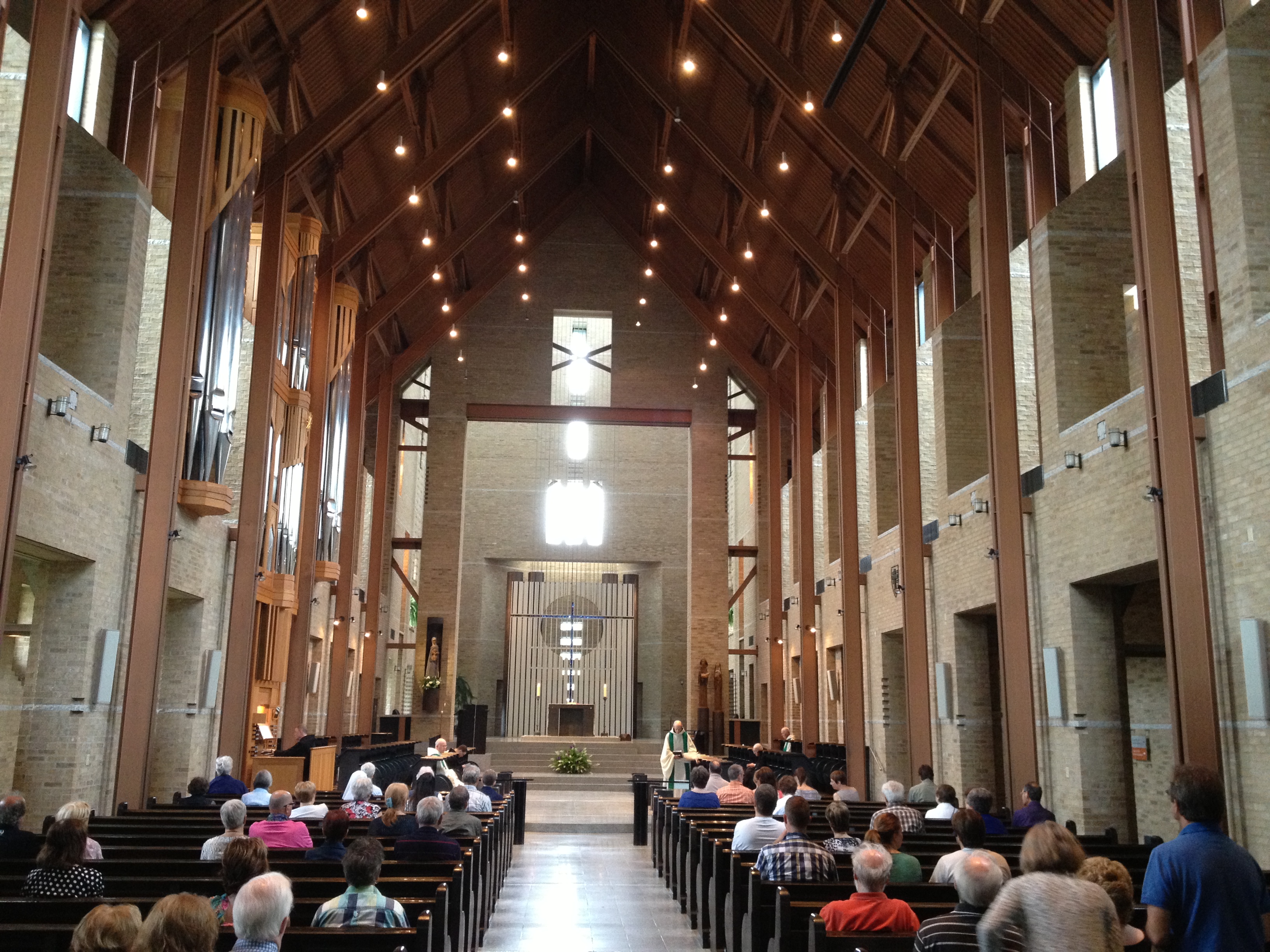 L’édifice s’insère magnifiquement bien, entre deux ailes anciennes; difficile à décrire le pourquoi mais l’uniformité du lieu est incontestable, un vrai chef d’œuvre. Nous pénétrons tous ensemble dans l’église pour assister à la messe chantée par les moines, tout est chanté même les lectures et l’évangile, sur ce ton universel qu’ont ces chœurs de monastères … clore les yeux et se laisser enchanter par la mélodie, parfois accompagnée de l’orgue joué par le père abbé lui-même. C’est par contre au moment de l’homélie que l’on se rappelle que nous sommes au Québec.