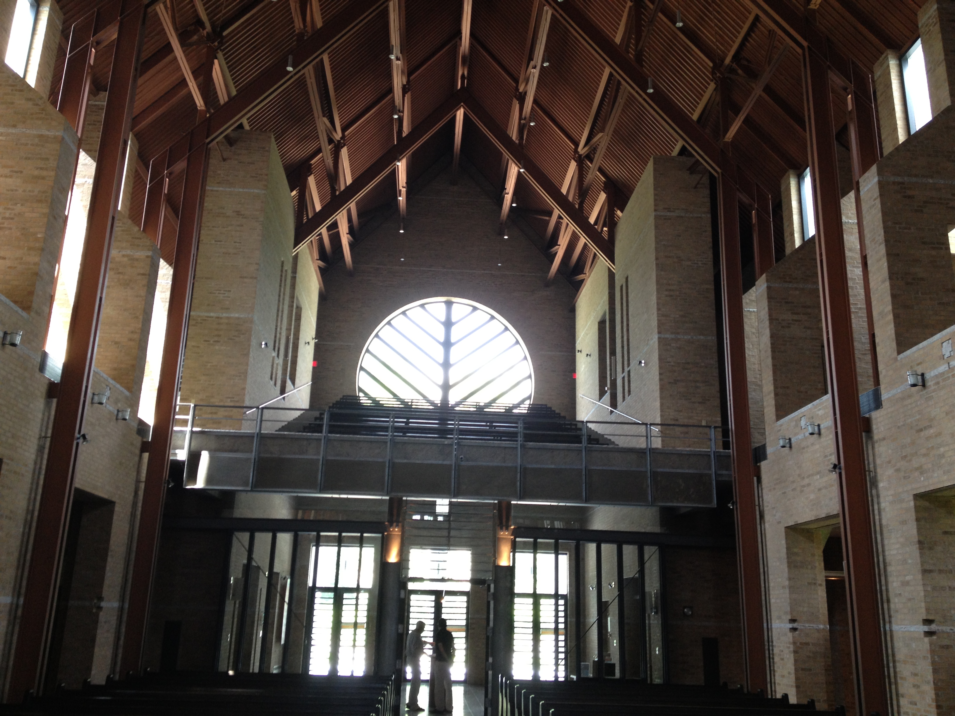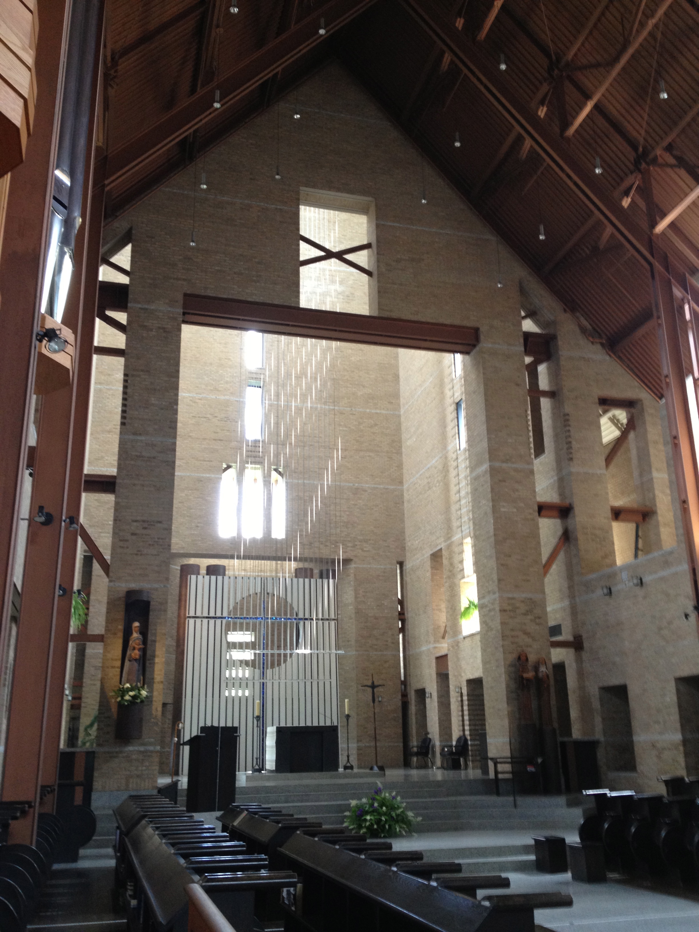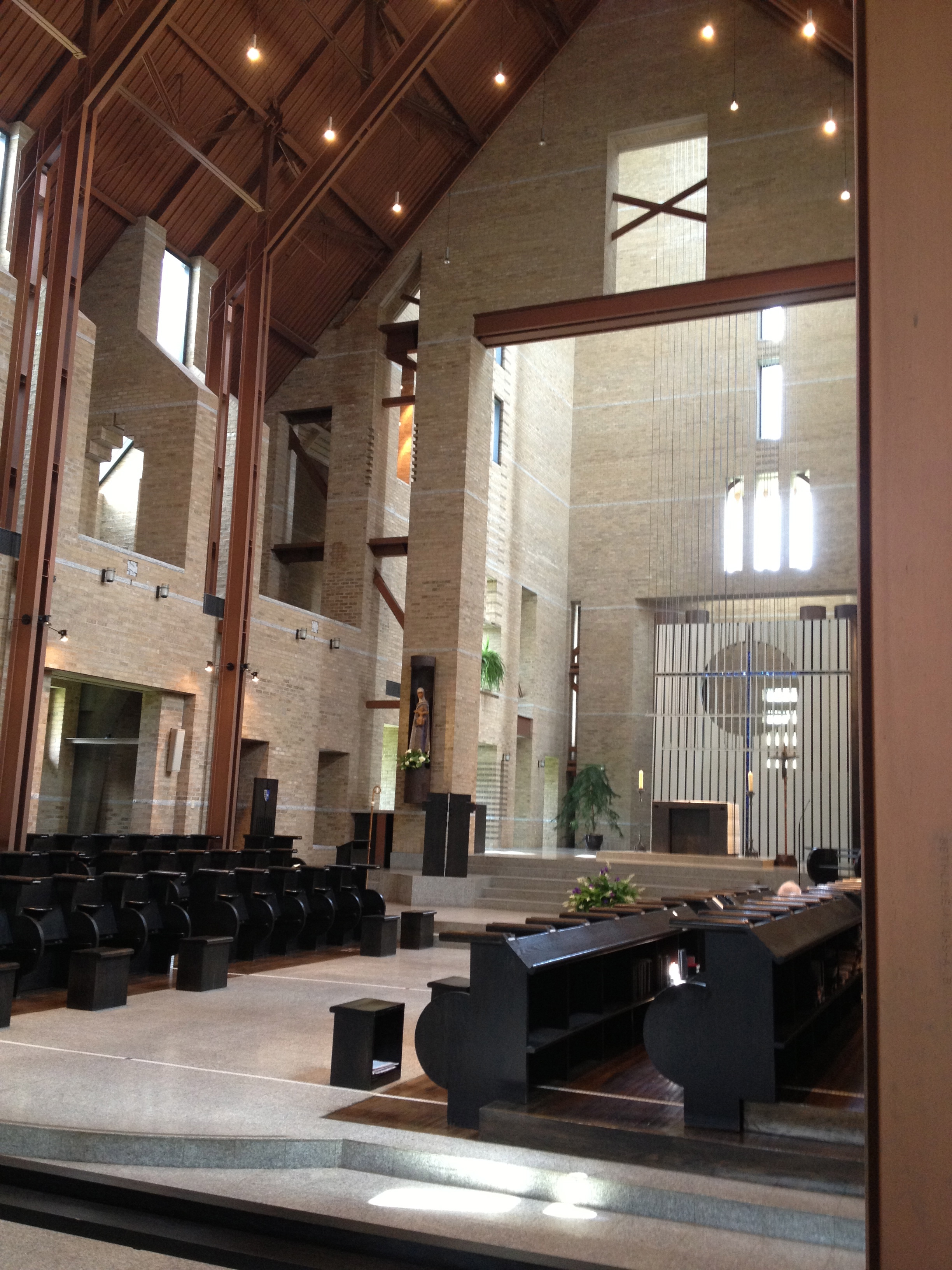 L’église est tellement superbe, élancée, éclairée par les rayons du soleil qui pénètre par les nombreuses fenêtres haut-perchées; ce soleil qui va justement éclairer l’autel au moment où tous les moines y sont réunis pour l’eucharistie. Une énorme charpente métallique soutient la construction, séparée des corps de briques; les lumières, les croix, les stalles, les bancs, … tout a été dessiné dans la recherche et la sobriété, procurant un effet d’ensemble face auquel il est impossible de rester indifférent. Il y a toute une symbolique dans les divers éléments, que Dan nous narre avec passion et humour. Derrière l’autel, une énorme croix toute simple d’éclats de verre bleu de Murano attire le regard et devant elle, des rideaux de câbles d’acier qui, éclairés par le soleil tombant du puits de lumière de la tour, donnent une impression de pluie vivante reliant le ciel à la terre, tandis qu’à l’autre extrémité c’est une très jolie rosace qui laisse pénétrer la clarté, sur le narthex et sur ce bénitier où scintille un petit triangle doré.