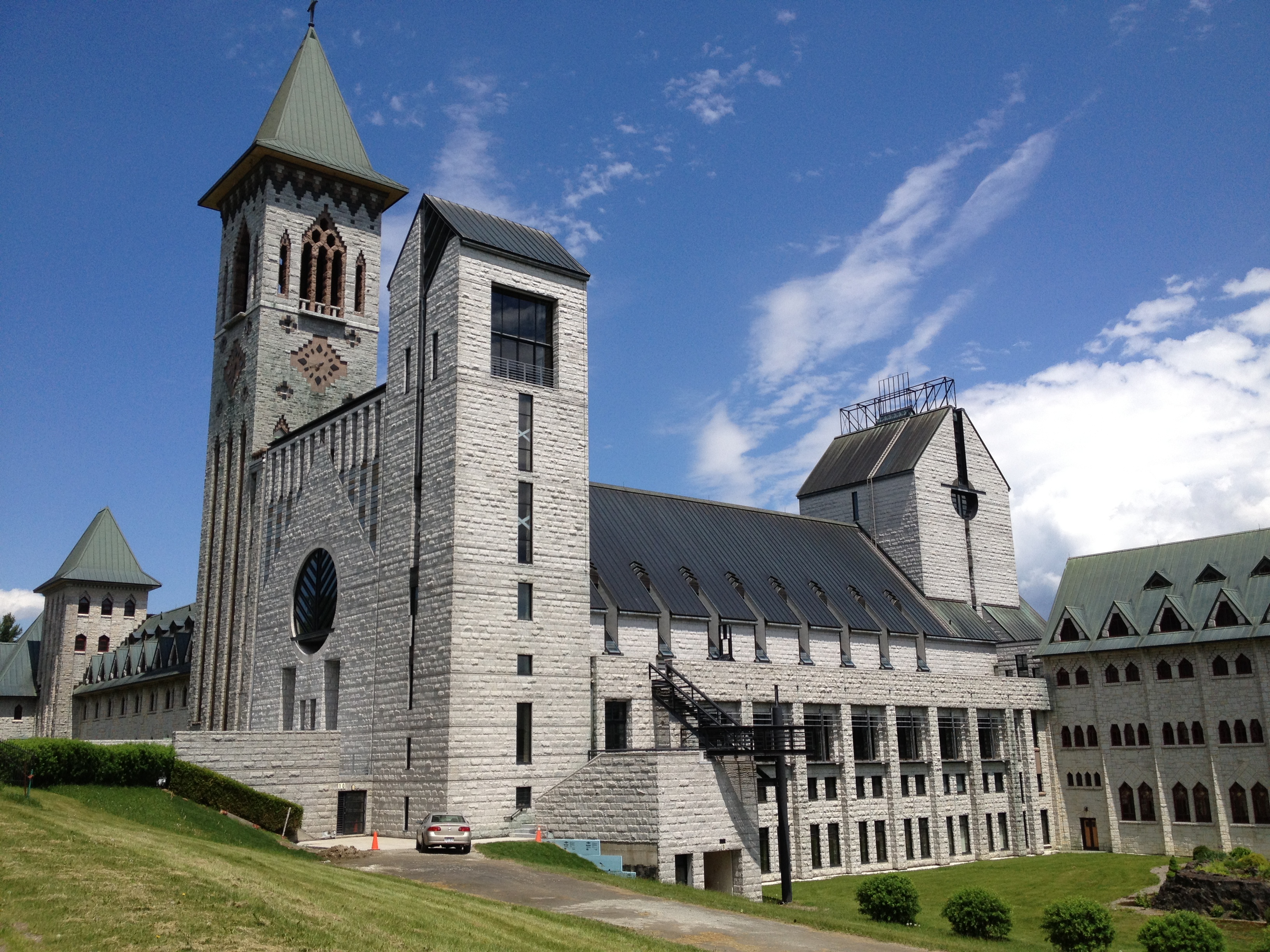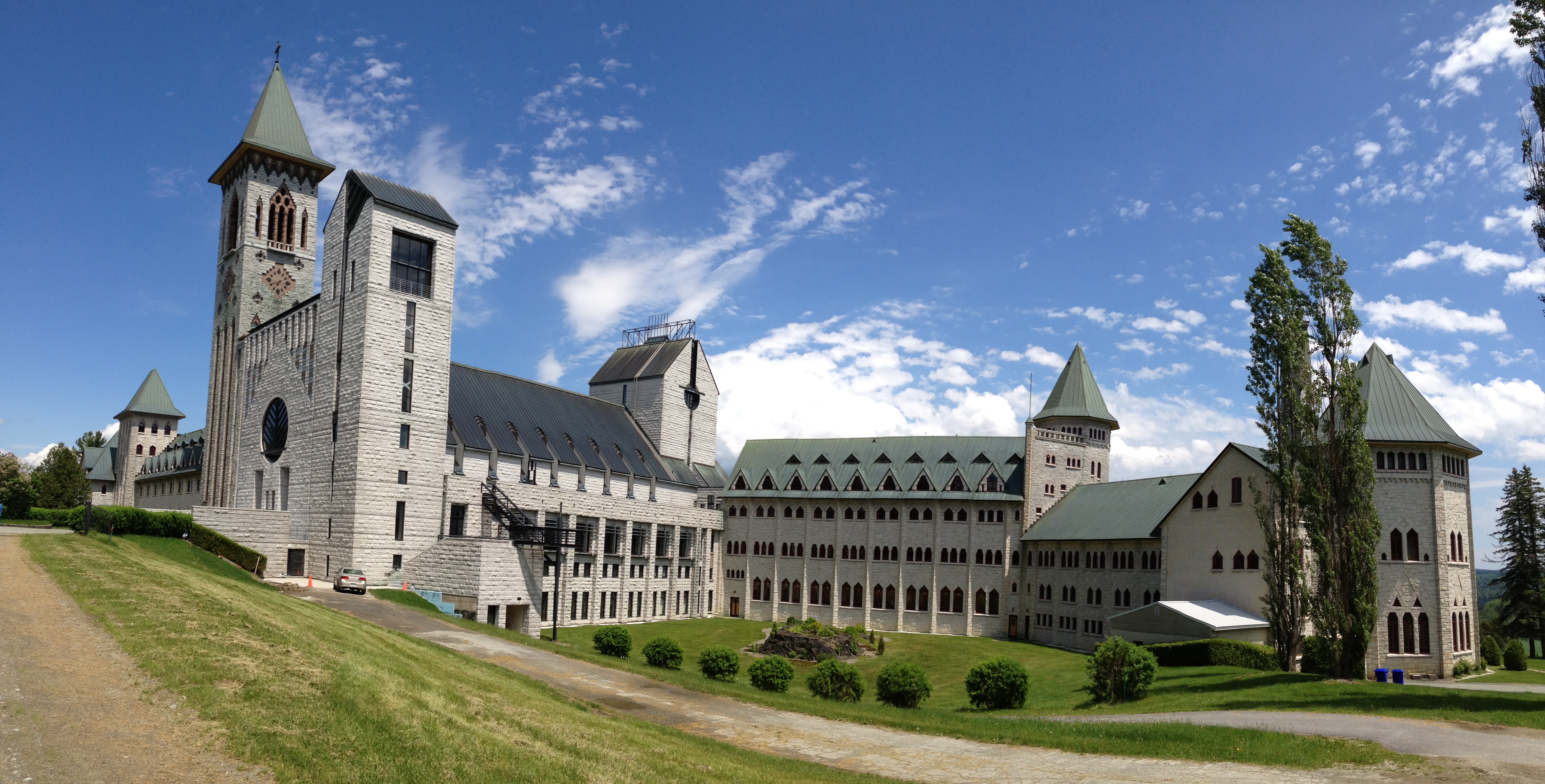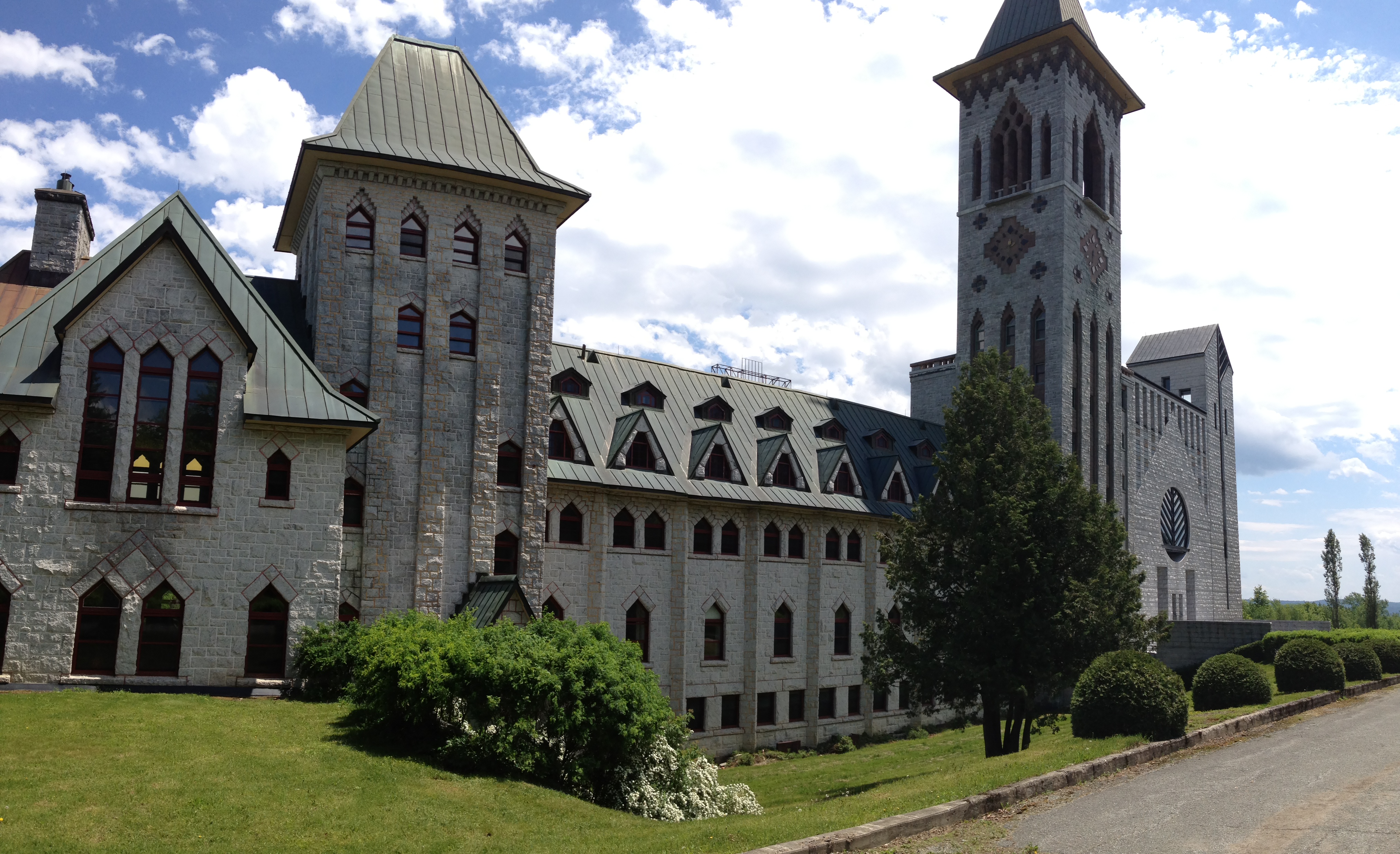 Bolton, Austin et nous découvrons le site enchanteur de l’Abbaye. La communauté compte aujourd’hui quarante moines vivant selon la règle monastique de St. Benoît; c’est en 1912 que la communauté normande de St. Wandrille, en exil en Belgique, projette de s’établir au Canada et envoie quelques moines qui achètent une ferme aux abords du lac Memphrémagog. La communauté va s’agrandir et il est décidé de construire un monastère en pierre; c’est Dom Bellot, moine architecte de Solesmes qui dessine les plans des deux ailes qui seront terminées en 1941 – c’est lui également qui a participé à la conception de l’Oratoire St. Joseph.