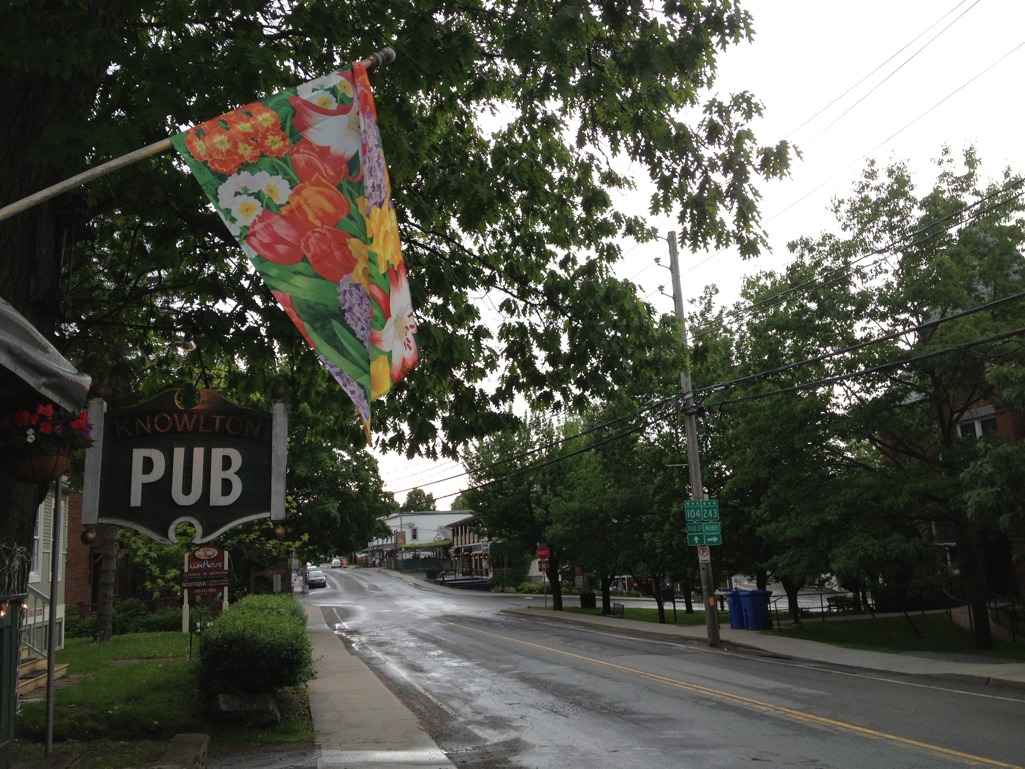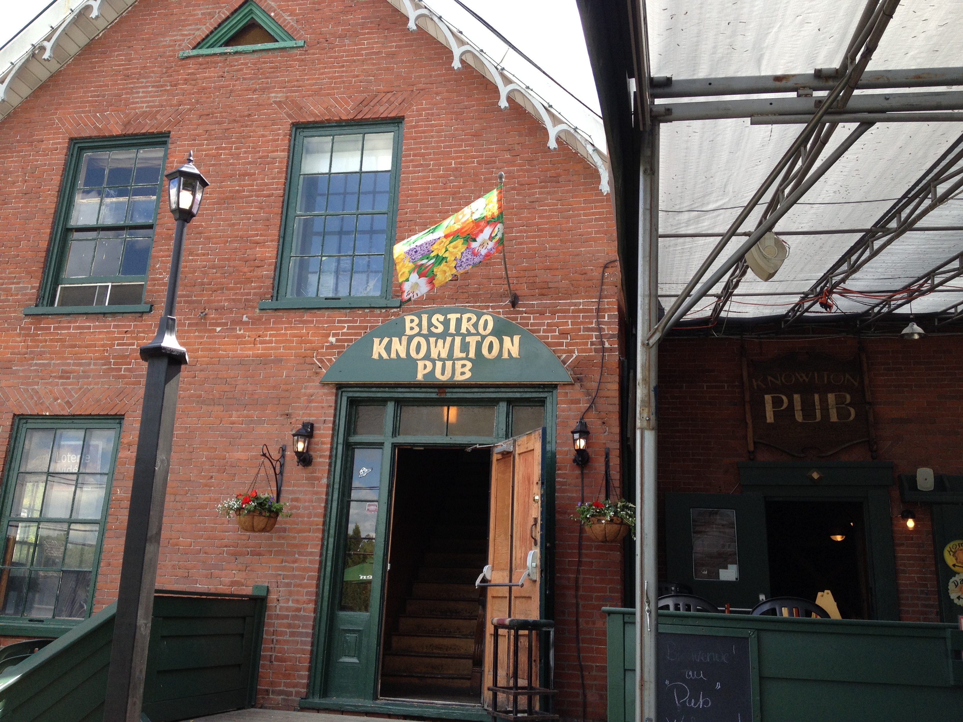 C’est dans le petit village de Knowlton que nous trouvons une terrasse dans un pub pour un lunch qui me fait découvrir le plat typique de la smoked meat, de la viande de porc fumée, coupée en lamelles que l’on déguste en sandwich entre deux tranches de pain … j’aime assez. Le pub s’appelait anciennement l’auberge Bolton Pass, située sur le chemin qui constituait la seule route carrossable entre les États-Unis et la région de Montréal via le passage difficile des montagnes du Bolton Pass.