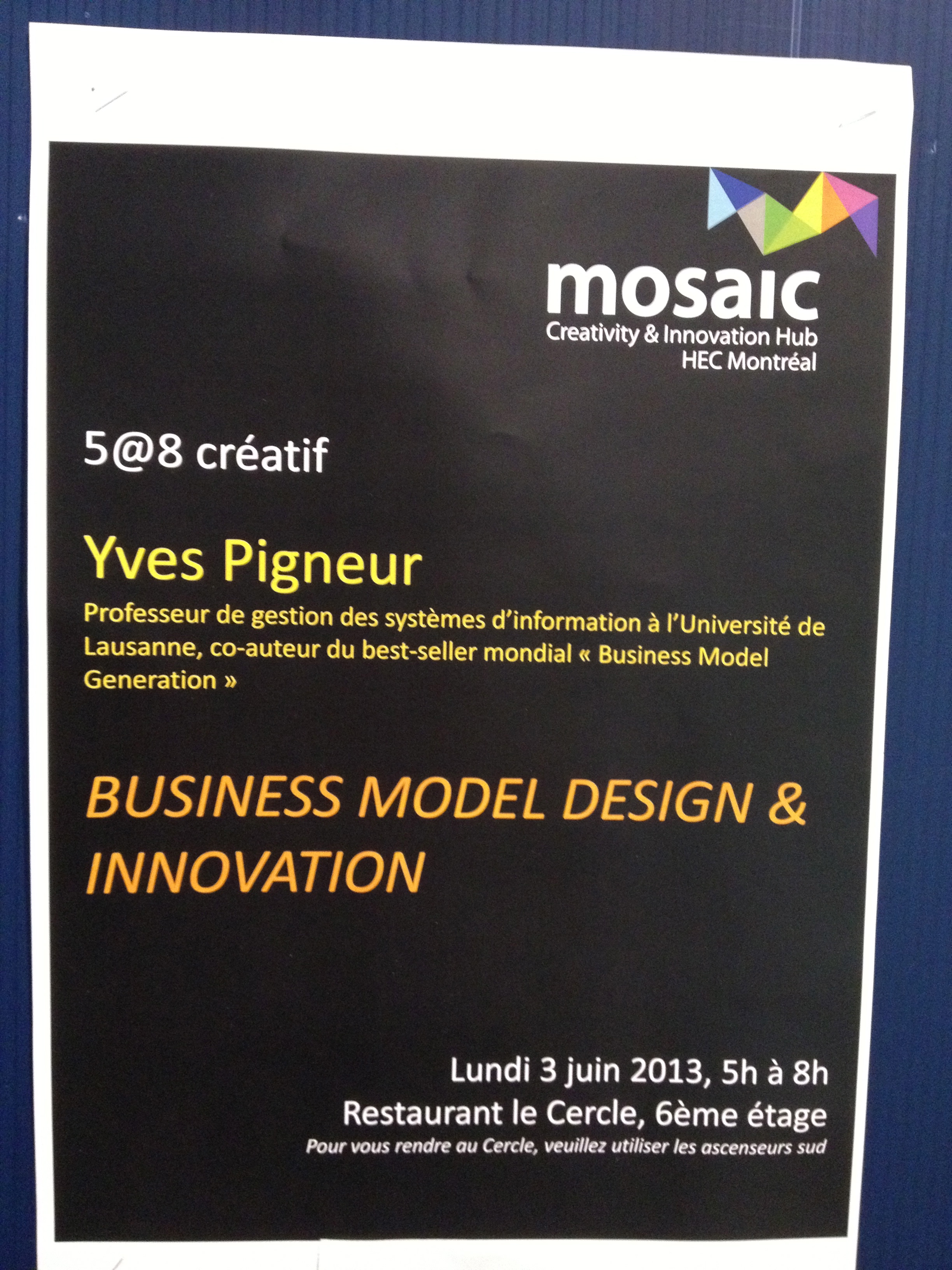 Yves a un agenda complet pour cette journée, qui se clôture en beauté avec la conférence 5@8 Créatif, organisée par le groupe Mosaic de HEC. La salle de restaurant du Cercle, au dernier étage du bâtiment est un très bel endroit, l’audience est variée avec des professeurs, des doctorants, des chercheurs, des entrepreneurs, des architectes, des designers, etc. Leur intérêt se manifeste par une bonne participation et de nombreuses questions par la suite, il y aura même une interview pour une chaîne de télévision locale tout bientôt.