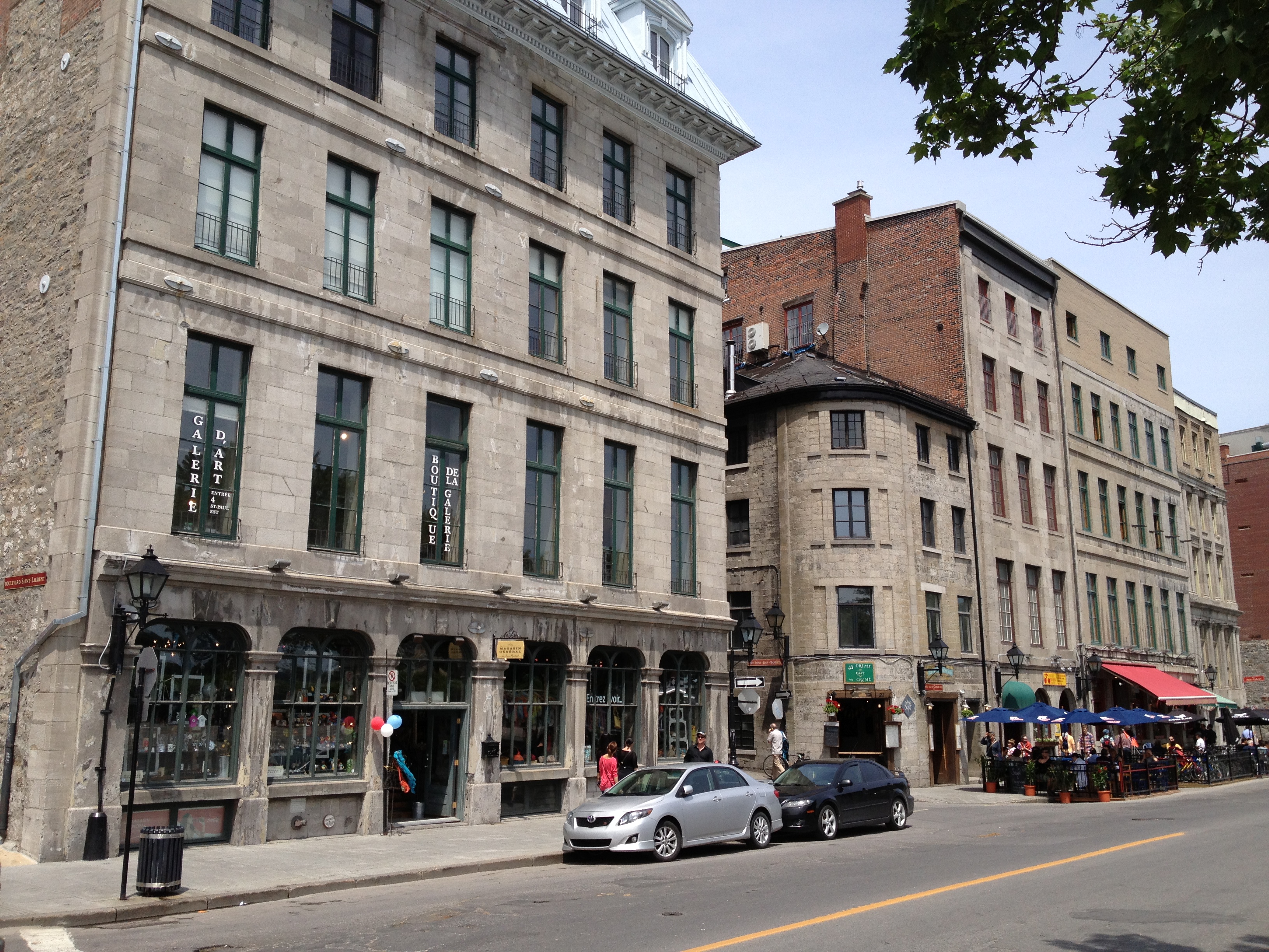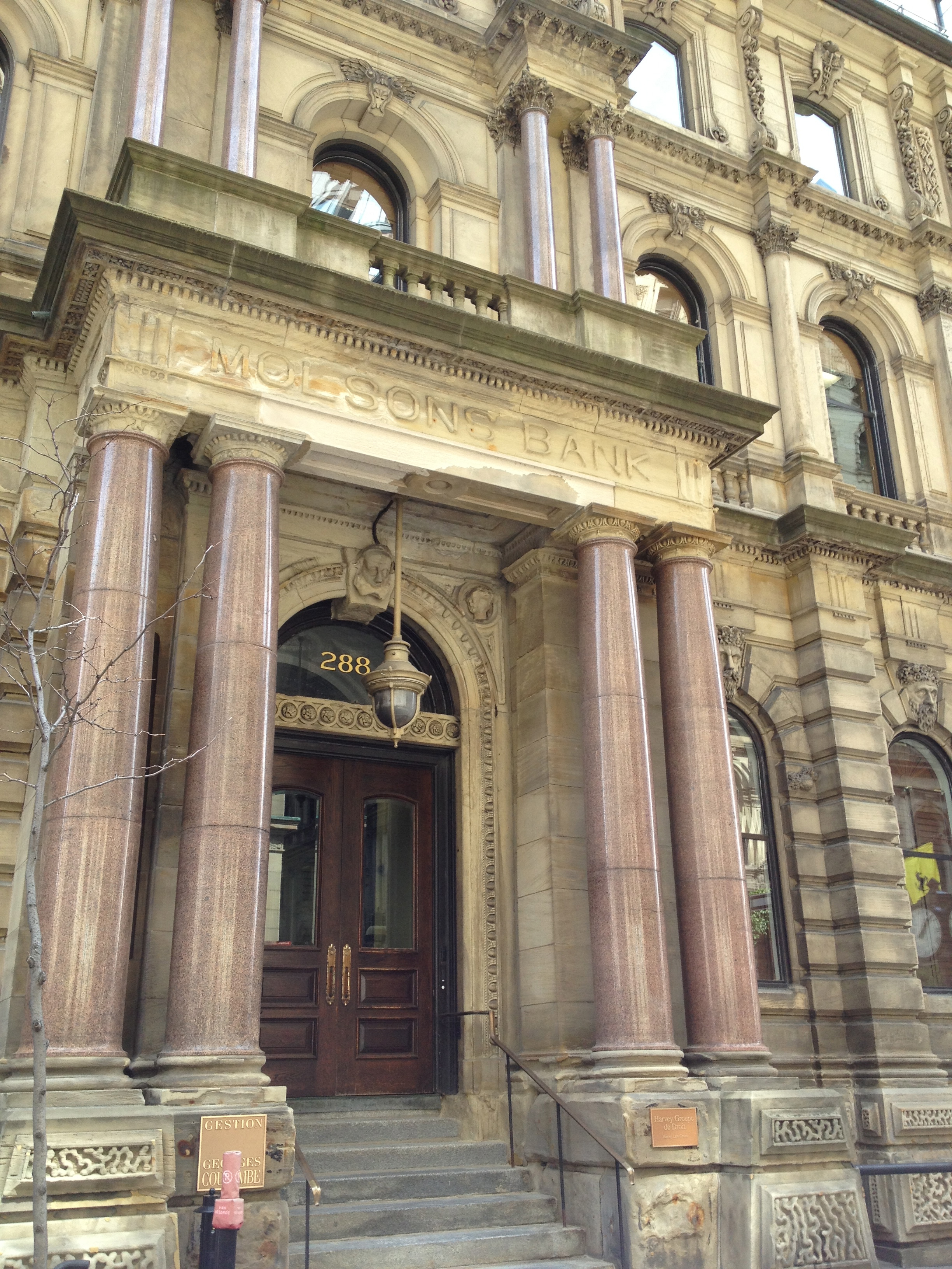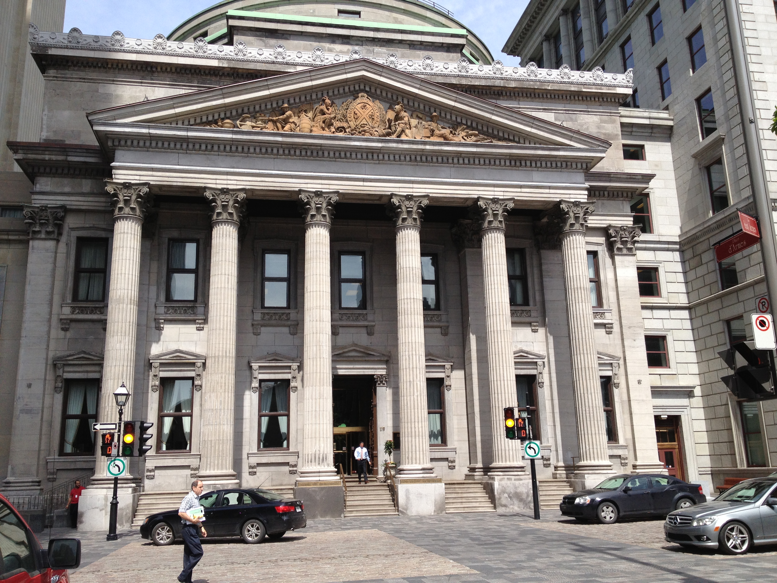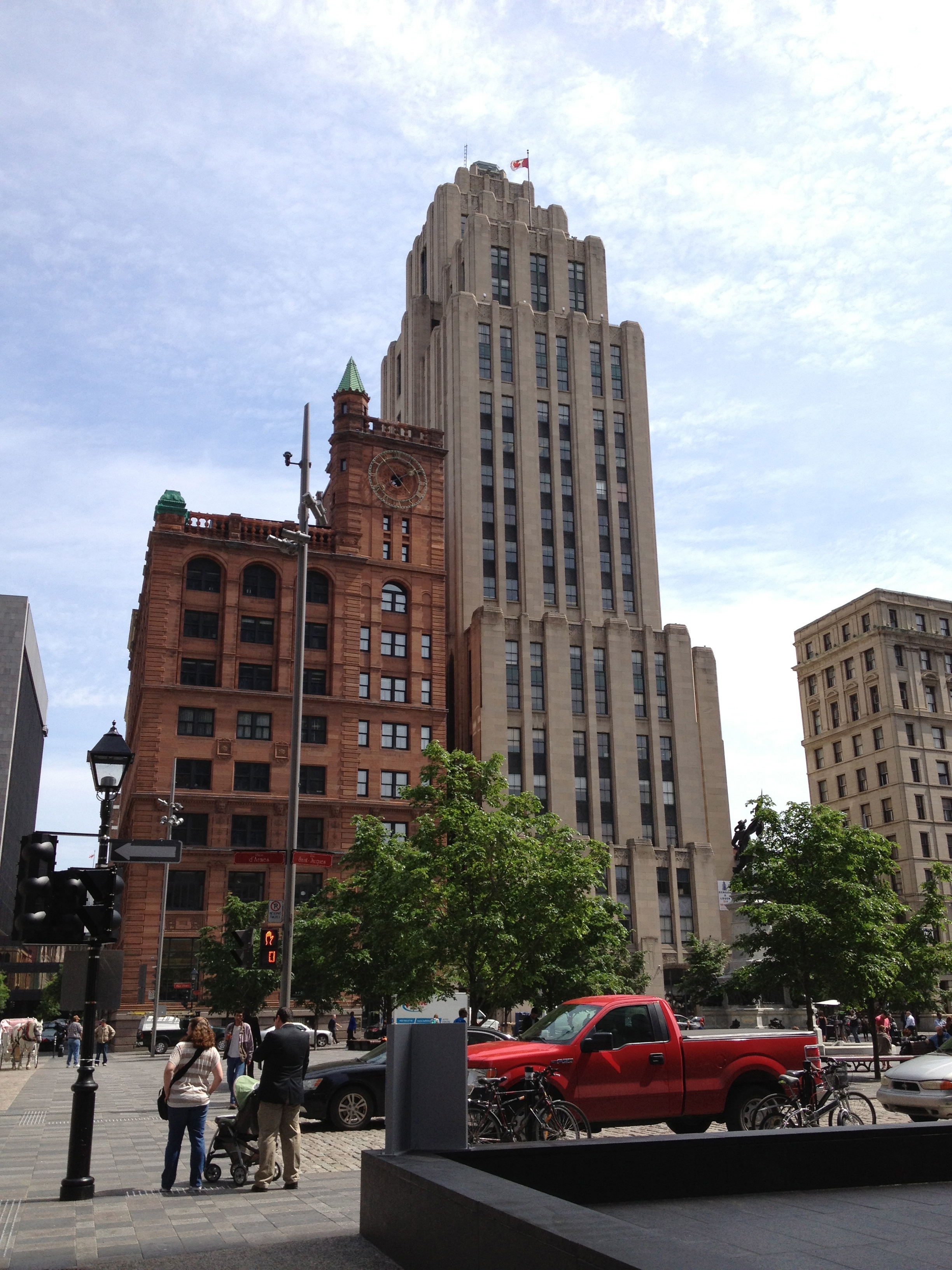 Inspirée par notre visite hier du musée McCord, je pars explorer plus en détail le Vieux Montréal, tout en sachant que les musées ont portes closes le lundi. Au dix-huitième siècle, la ville était fortifiée, ses murs furent ensuite démolis pour permettre le développement de la vie économique; le quartier du Vieux Montréal correspond au territoire que couvrait la cité dans ses remparts. Le siècle suivant, cela devient le quartier de la finance, le Wall Street du Canada, avec des sièges de banques et d’assurances. La rue St. Jacques nous montre les édifices imposants, aux lourdes portes, aux halls énormes de marbre et de dorures de la Banque Royale, la Banque Molson – issue d’une famille célèbre pour sa brasserie, la Banque de Montréal – bâtie sur le modèle du Panthéon de Rome et qui rappelle ce film avec Jean-Paul Belmondo, la New York Life – compagnie d’assurances de huit étages en grès rouge, considérée en 1888 comme le premier gratte-ciel de Montréal. L’architecture de cette rue est riche et variée, de petits hôtels luxueux accueillent des célébrités et ils devaient être bien complets avec le Grand-Prix, comme le Saint-James, le Saint-Régis ou le LHotel qui renferme des collections privées d’arts pop et contemporains dont une œuvre de Botero sur le trottoir.