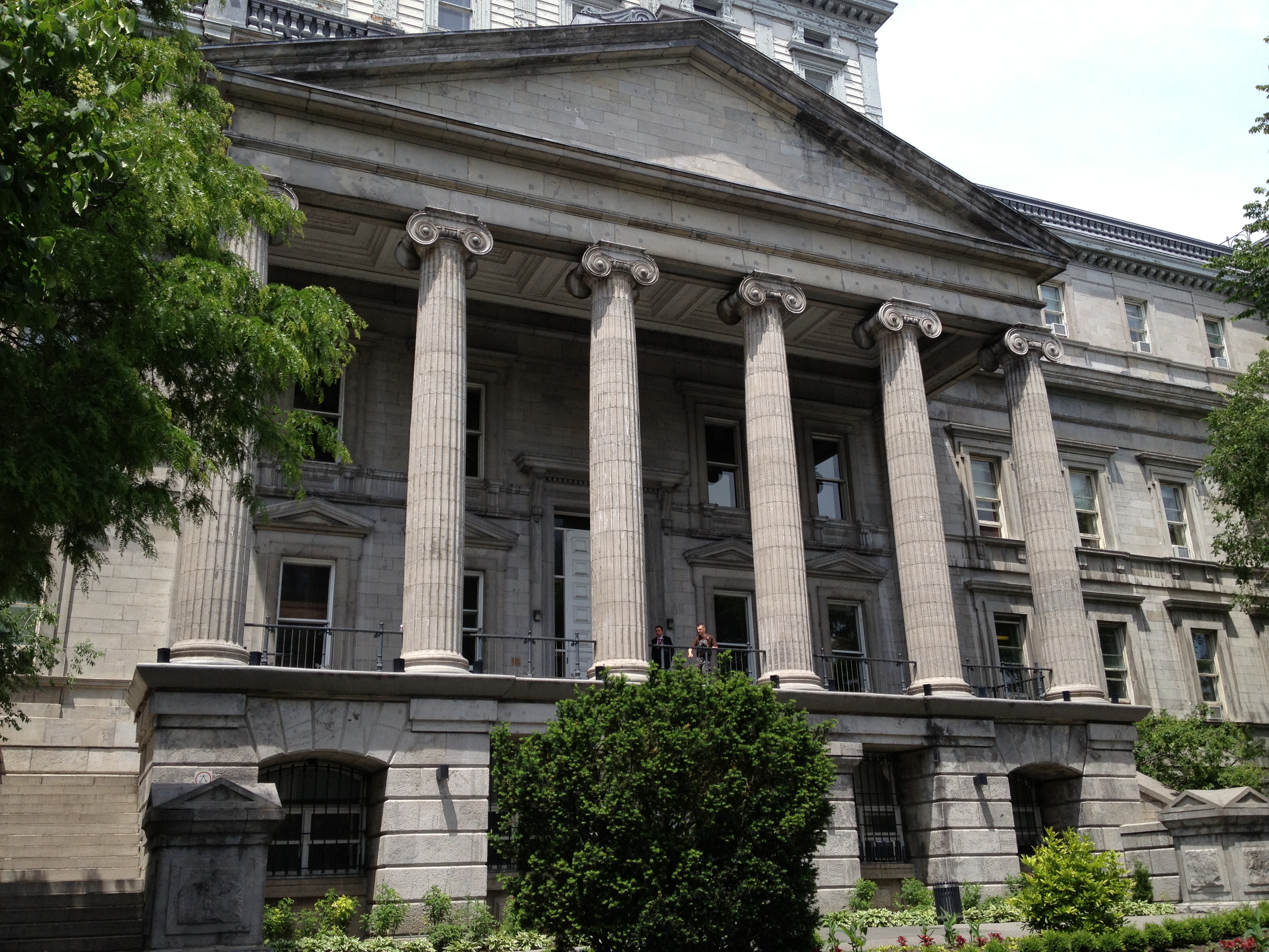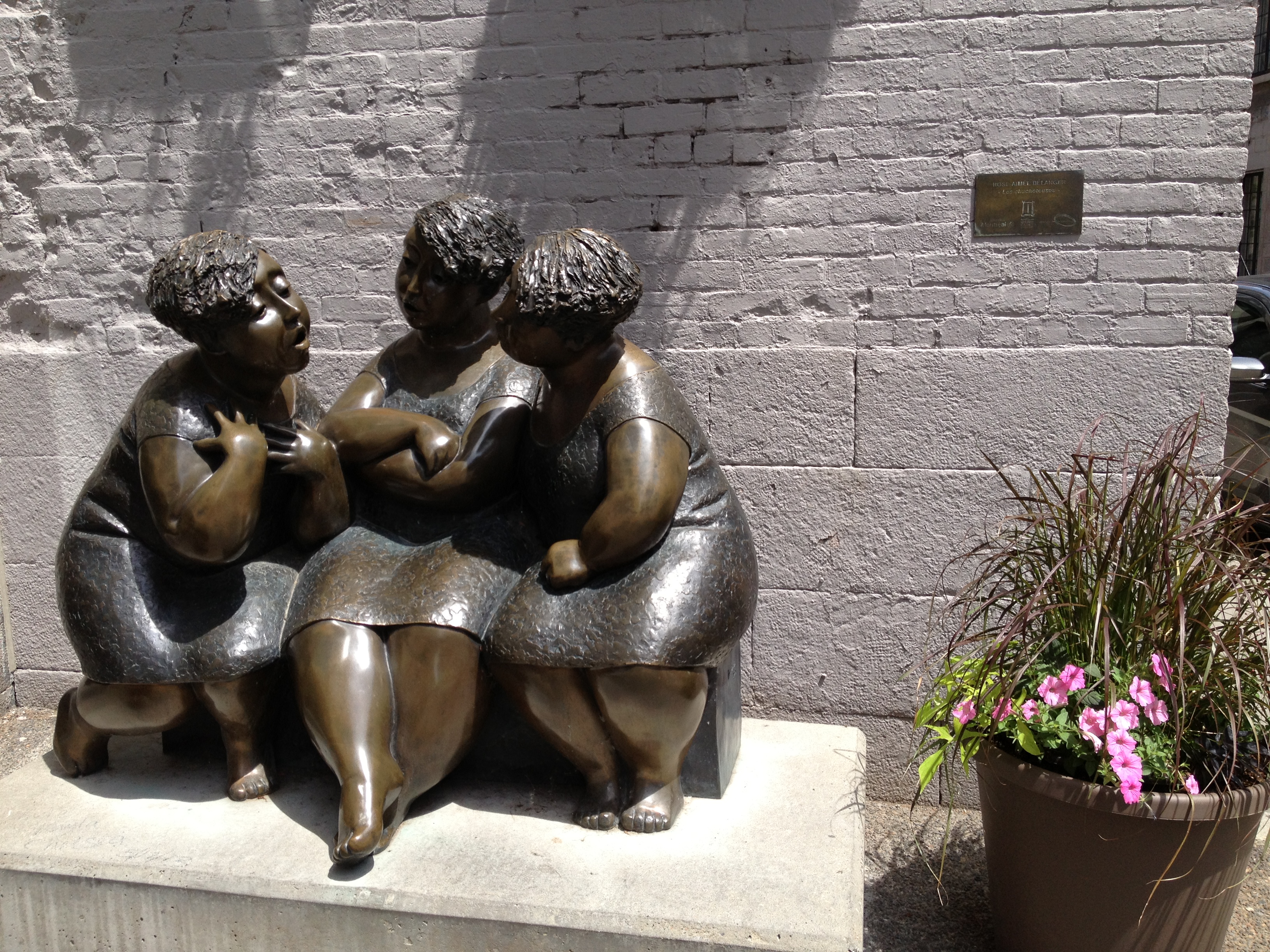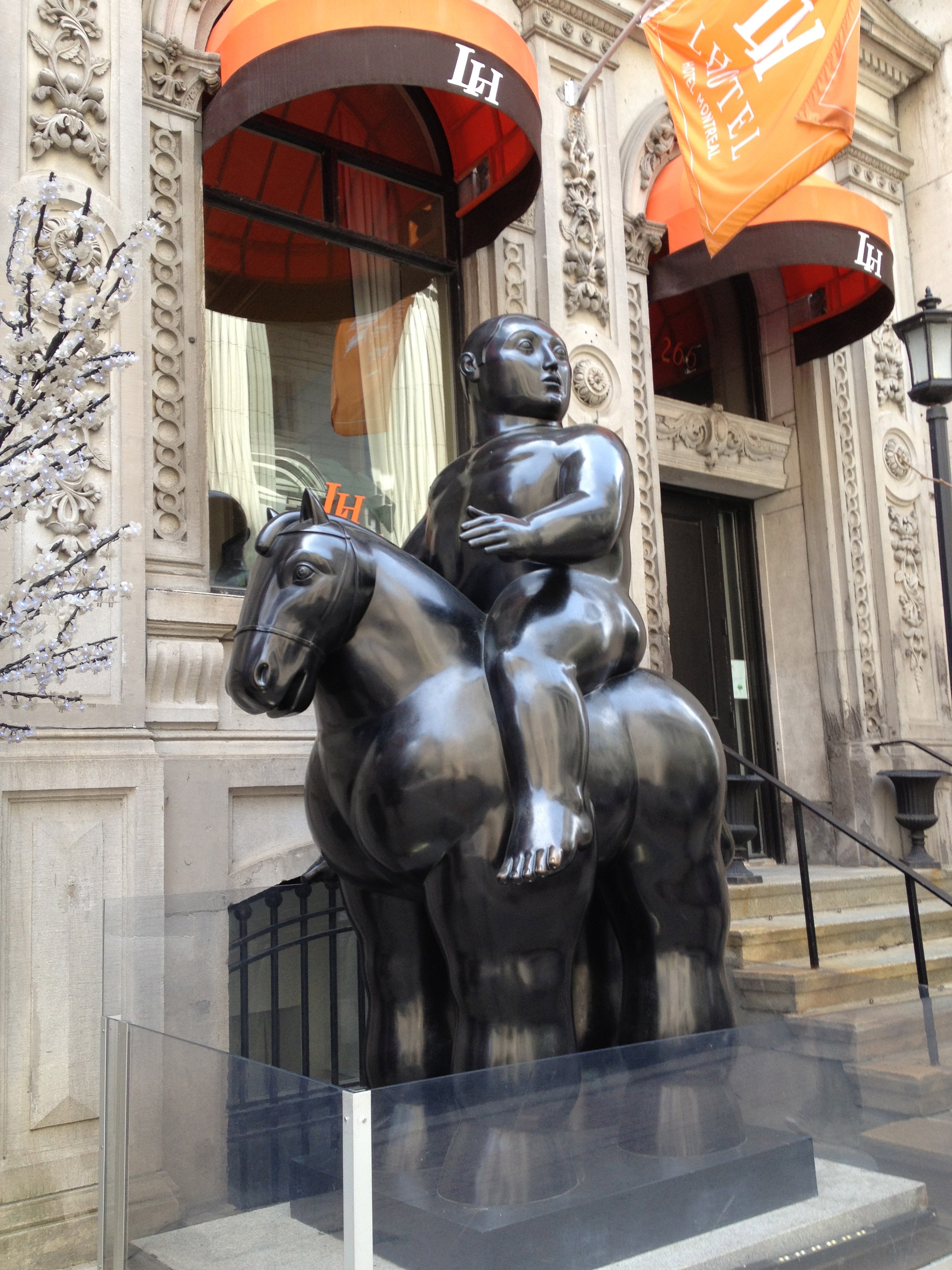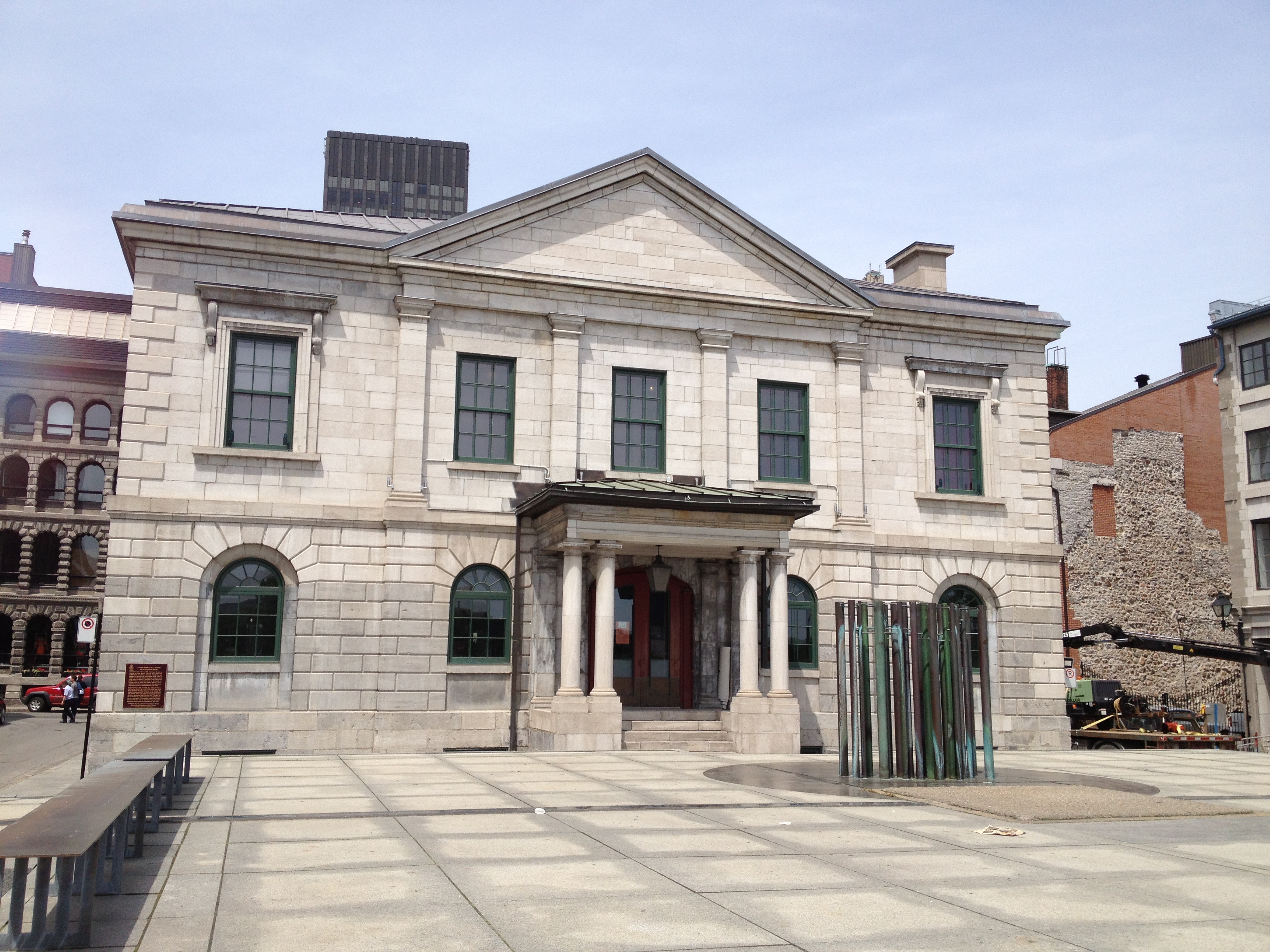 Inspirée par notre visite hier du musée McCord, je pars explorer plus en détail le Vieux Montréal, tout en sachant que les musées ont portes closes le lundi. Au dix-huitième siècle, la ville était fortifiée, ses murs furent ensuite démolis pour permettre le développement de la vie économique; le quartier du Vieux Montréal correspond au territoire que couvrait la cité dans ses remparts. Le siècle suivant, cela devient le quartier de la finance, le Wall Street du Canada, avec des sièges de banques et d’assurances. La rue St. Jacques nous montre les édifices imposants, aux lourdes portes, aux halls énormes de marbre et de dorures de la Banque Royale, la Banque Molson – issue d’une famille célèbre pour sa brasserie, la Banque de Montréal – bâtie sur le modèle du Panthéon de Rome et qui rappelle ce film avec Jean-Paul Belmondo, la New York Life – compagnie d’assurances de huit étages en grès rouge, considérée en 1888 comme le premier gratte-ciel de Montréal. L’architecture de cette rue est riche et variée, de petits hôtels luxueux accueillent des célébrités et ils devaient être bien complets avec le Grand-Prix, comme le Saint-James, le Saint-Régis ou le LHotel qui renferme des collections privées d’arts pop et contemporains dont une œuvre de Botero sur le trottoir.
