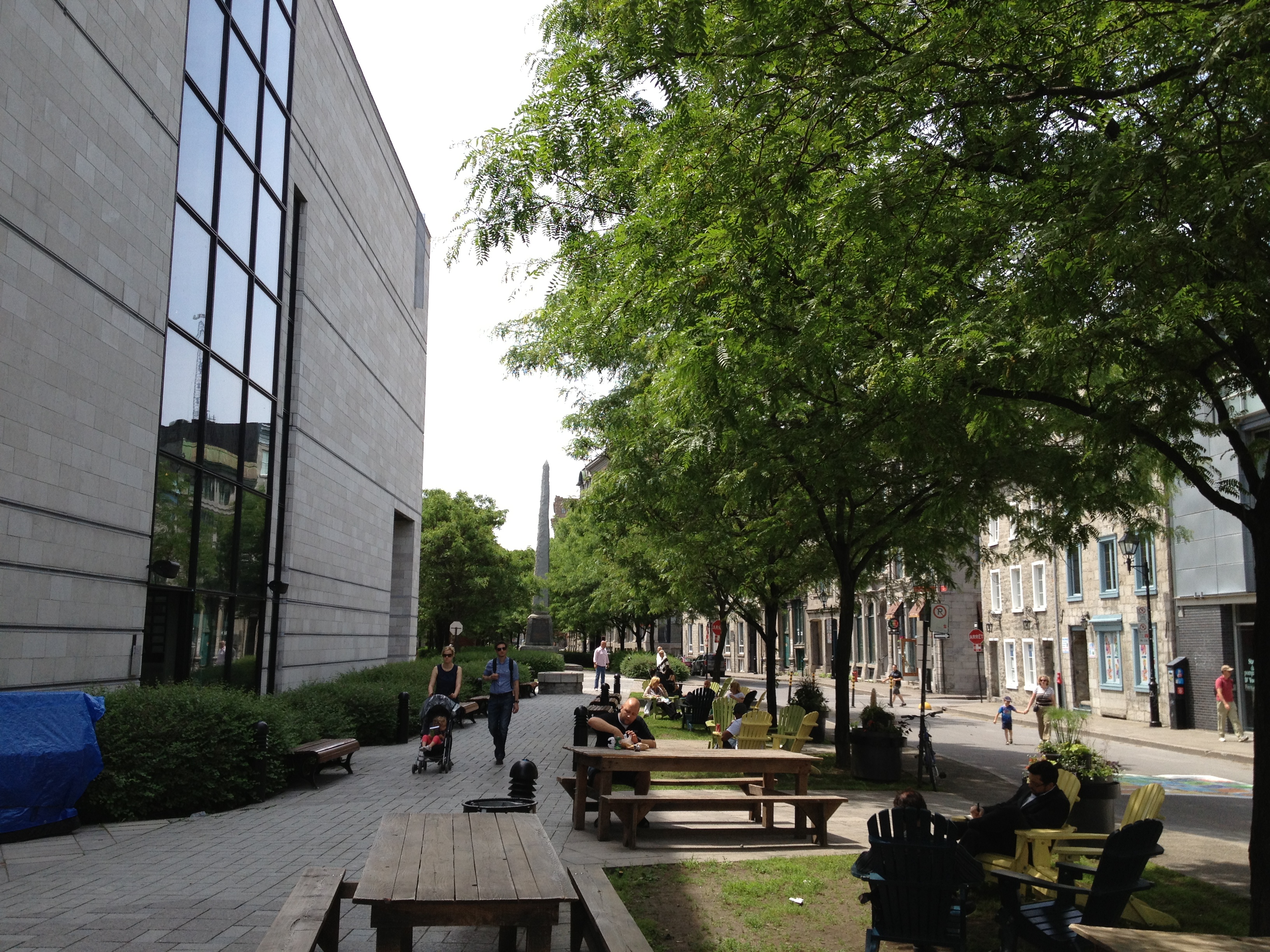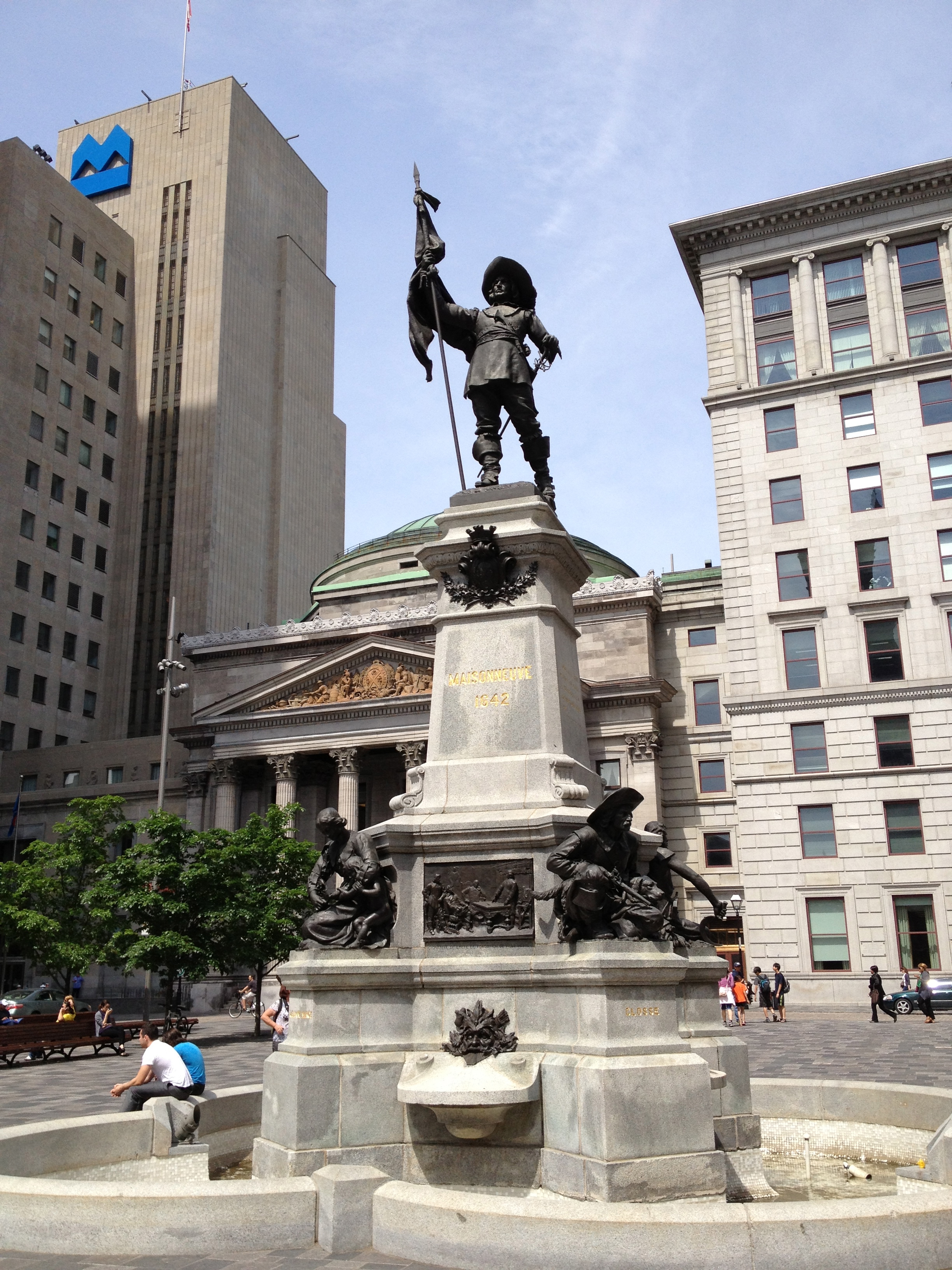 La rue St Paul serait la plus ancienne et pendant longtemps la principale artère commerciale; elle est bordée de boutiques et de galeries magnifiques – super art inuit entre autres-, installées dans des anciens immeubles de pierre – on y prépare déjà l’hiver à ce que je peux observer par le dépôt d’un tas de bûches dans un hôtel particulier. Elle mène à la Place Royale, ainsi nommée par l’explorateur Samuel de Champlain en 1611, qui souhaite y installer un poste pour la traite des fourrures mais dont les projets seront stoppés par les guerres entre les tribus amérindiennes. La Place Royale sera renommée Pointe-à-Callière et c’est ici que fut fondée Montréal en 1642, avec la colonie missionnaire de Paul de Chomedey et Jeanne Mance ainsi qu’une cinquantaine de pionniers arrivés de France. La visite du Musée Pointe-à-Callière sera très intéressante, il y aura aussi le Centre d’Histoire de Montréal – à côté du restaurant Gibby’s de Nestor et des anciens bureaux de Alain – et l’ancien Hôpital des Sœurs Grises, dont la place porte le nom de la fondatrice de cette communauté, la Mère d’Youville. Ce terre-plein tout en longueur est un endroit vert et paisible, un obélisque rend hommage aux fondateurs et premiers colons arrivés à Montréal. Voici un quartier dont je reviendrai visiter quelques musées.