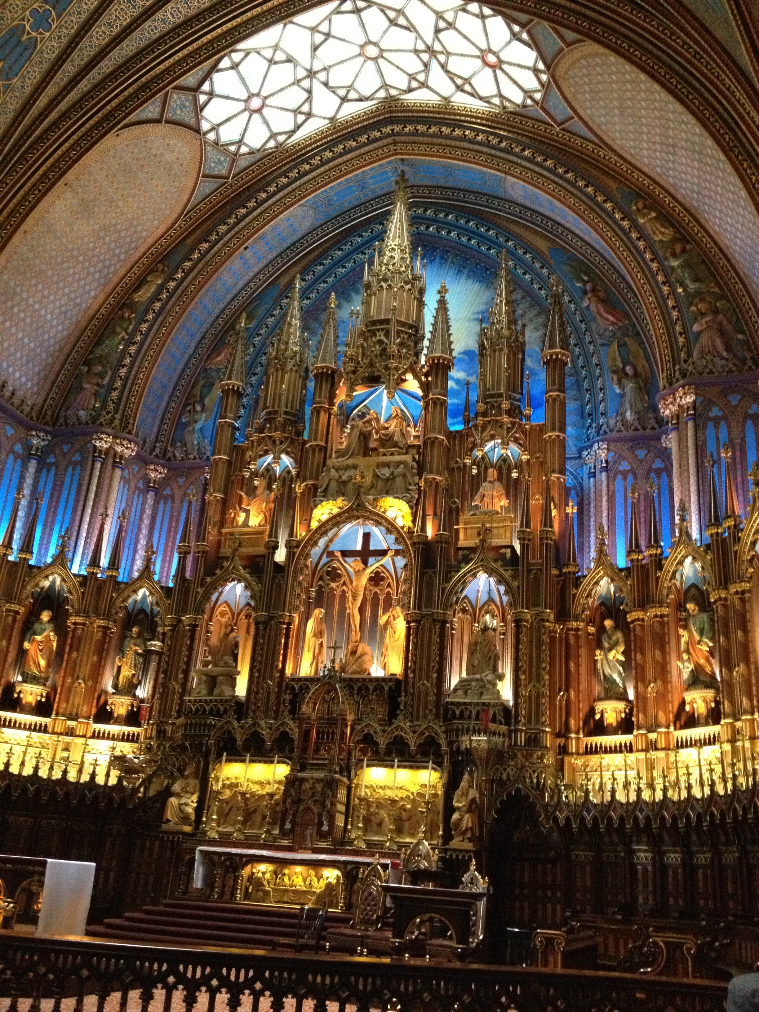 La Place d’Armes est riche en histoire, elle était sous le régime français le cœur de la ville, utilisée pour les manœuvres militaires, les processions religieuses et elle détenait aussi le puits qui constituait la première source d’eau potable de Montréal. Elle sera plus tard transformée en un jardin public puis en terminus des tramways et aujourd’hui, une place touristique où trône la statue de Paul de Chomedey de Maisonneuve, qui en 1642 fonde la colonie française sur cette île tout d’abord dénommée Ville-Marie, nom qui tombera peu à peu en désuétude pour devenir Montréal, inspiré du Mont-Royal, nom donné par Jacques Cartier à la montagne. Sur cette place, le plus ancien bâtiment de Montréal est le Vieux Séminaire de St Sulpice construit dans les années 1680 et qui est toujours habité par les prêtes de St Sulpice. Il est dit qu’au moment de sa construction, la ville comptait cinq cents habitants, terrorisés par les attaques des Iroquois et que ce séminaire représentait un coin de repli de civilisation européenne. Les Sulpiciens rêvent dans les années 1820 de faire construire la plus grande église au nord du Mexique, ils font appel à James O’Donnel, un architecte de New York d’origine irlandaise protestante et on raconte qu’il s’est converti au catholicisme avant de mourir pour pouvoir être ici enterré. La basilique Notre-Dame est de style néogothique, son décor intérieur est étonnant, entièrement de bois peint et doré à la feuille, avec un ciel de cèdre bleu, une chaire en noyer et tilleul sculptée à la main, des vitraux représentant la vie à Montréal et un orgue aux sept mille tuyaux. À l’arrière, toute en bois également, une petite chapelle qui est plutôt réservée aux mariages.