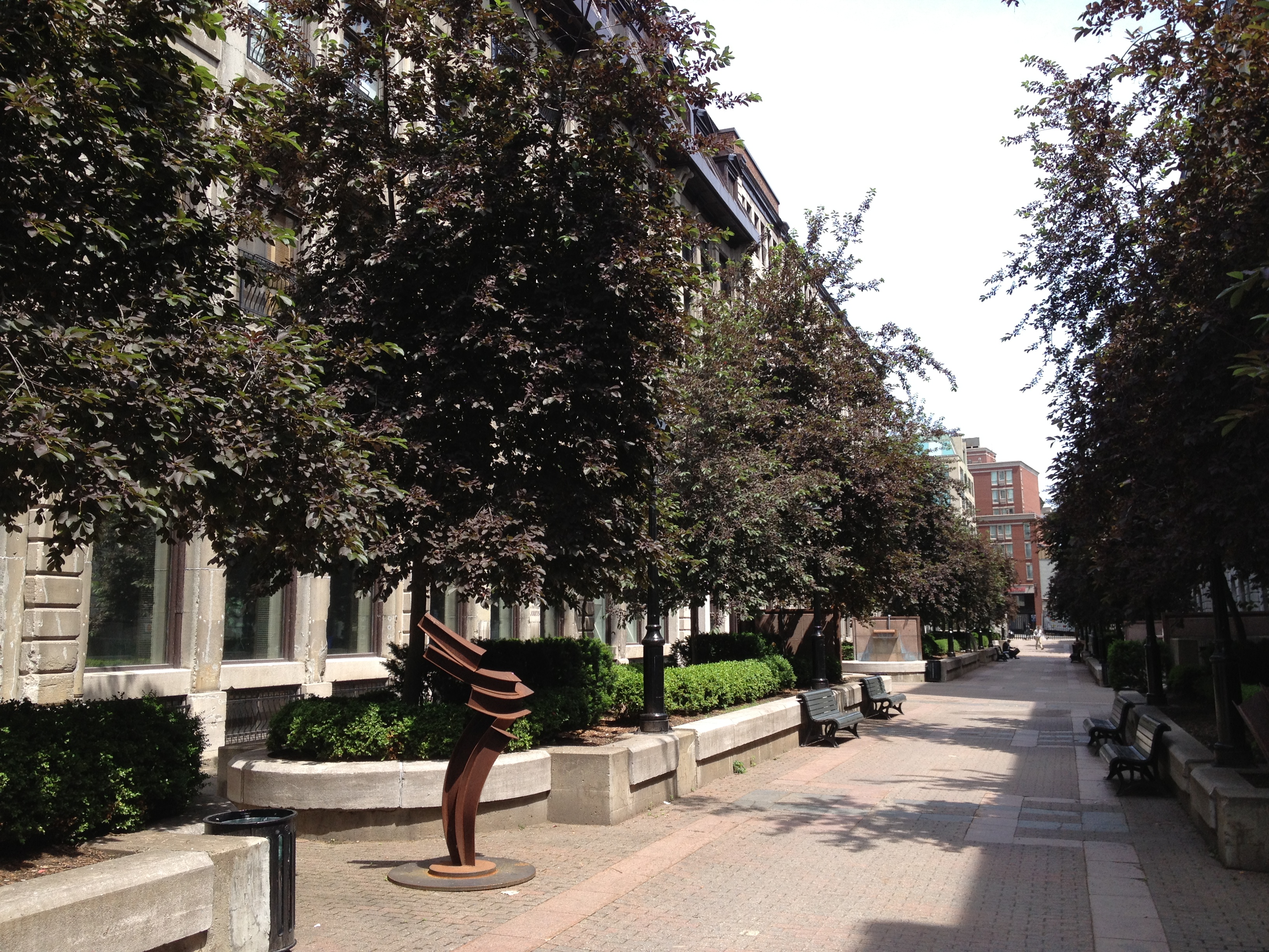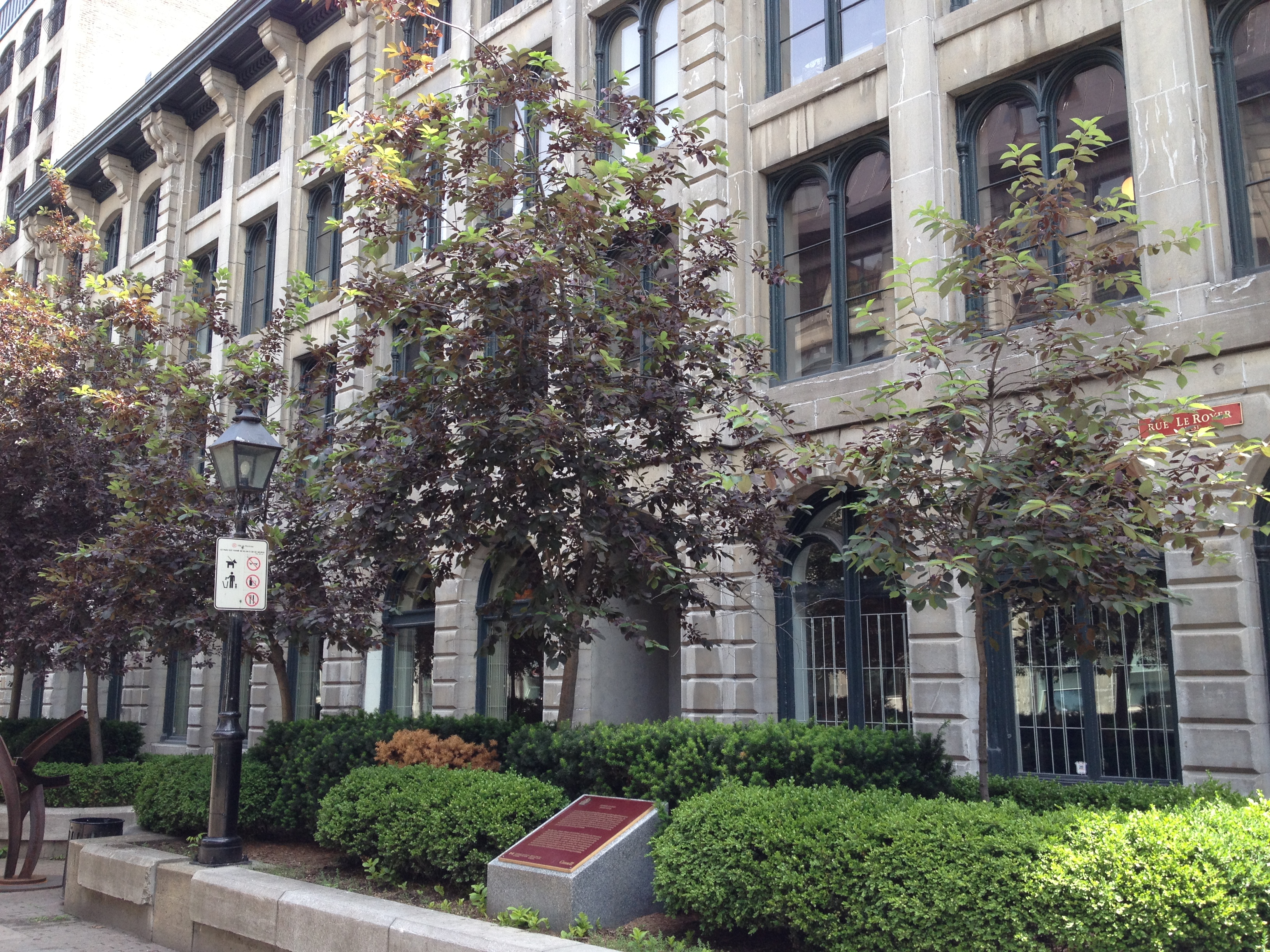 En descendant la rue St Sulpice, je fais un crochet par le Cours Le Royer, emplacement initial de l’Hôtel-Dieu fondé par Jeanne Mance et qui devient ensuite un ensemble d’entrepôts pour les biens arrivant dans le port tout proche – on voit encore quelques enseignes sur ces bâtiments. Aujourd’hui, ce sont des lofts ou des bureaux le long d’une petite rue piétonne agrémentée de fontaines, de bancs, de sculptures et de verdure.