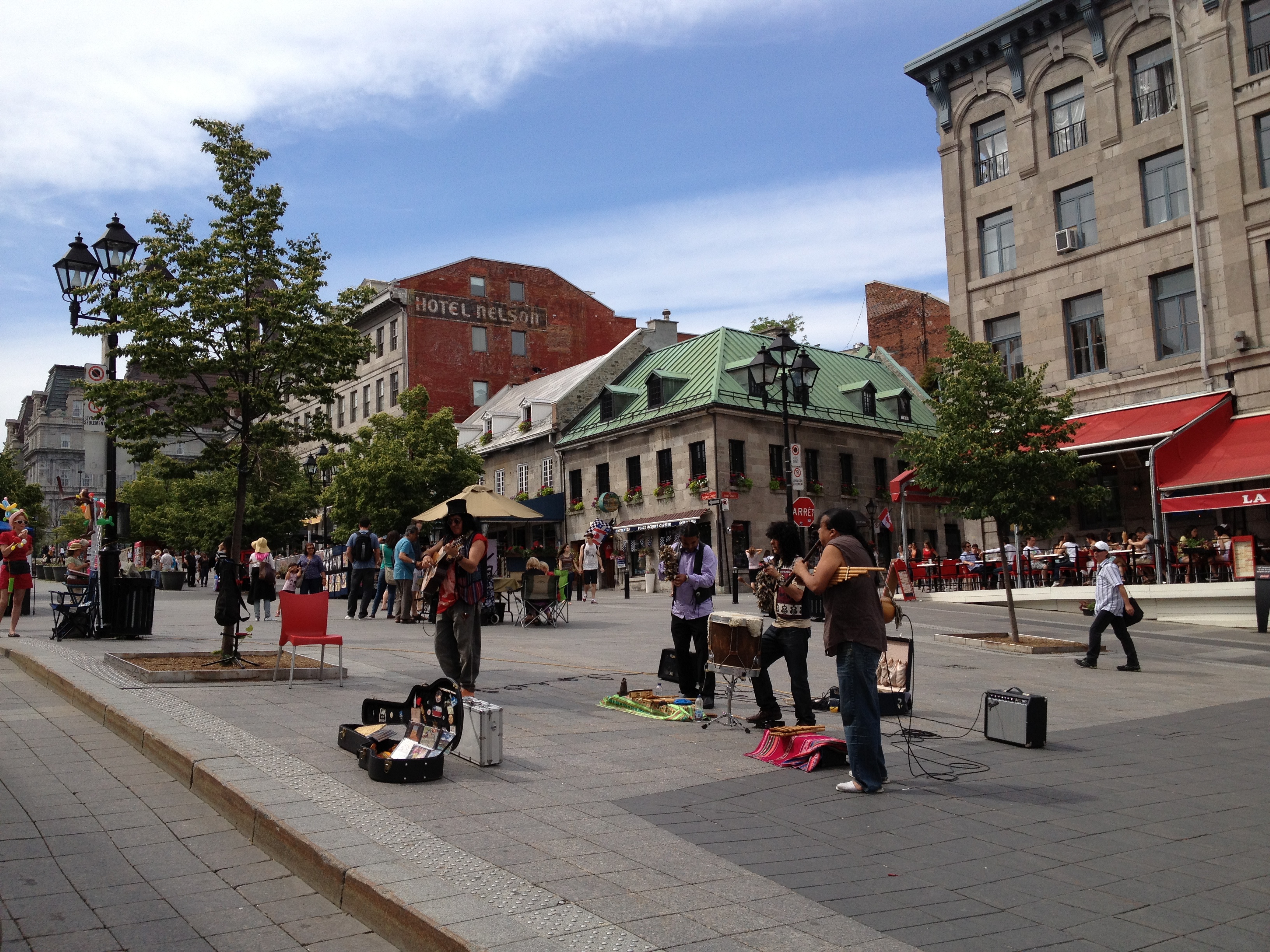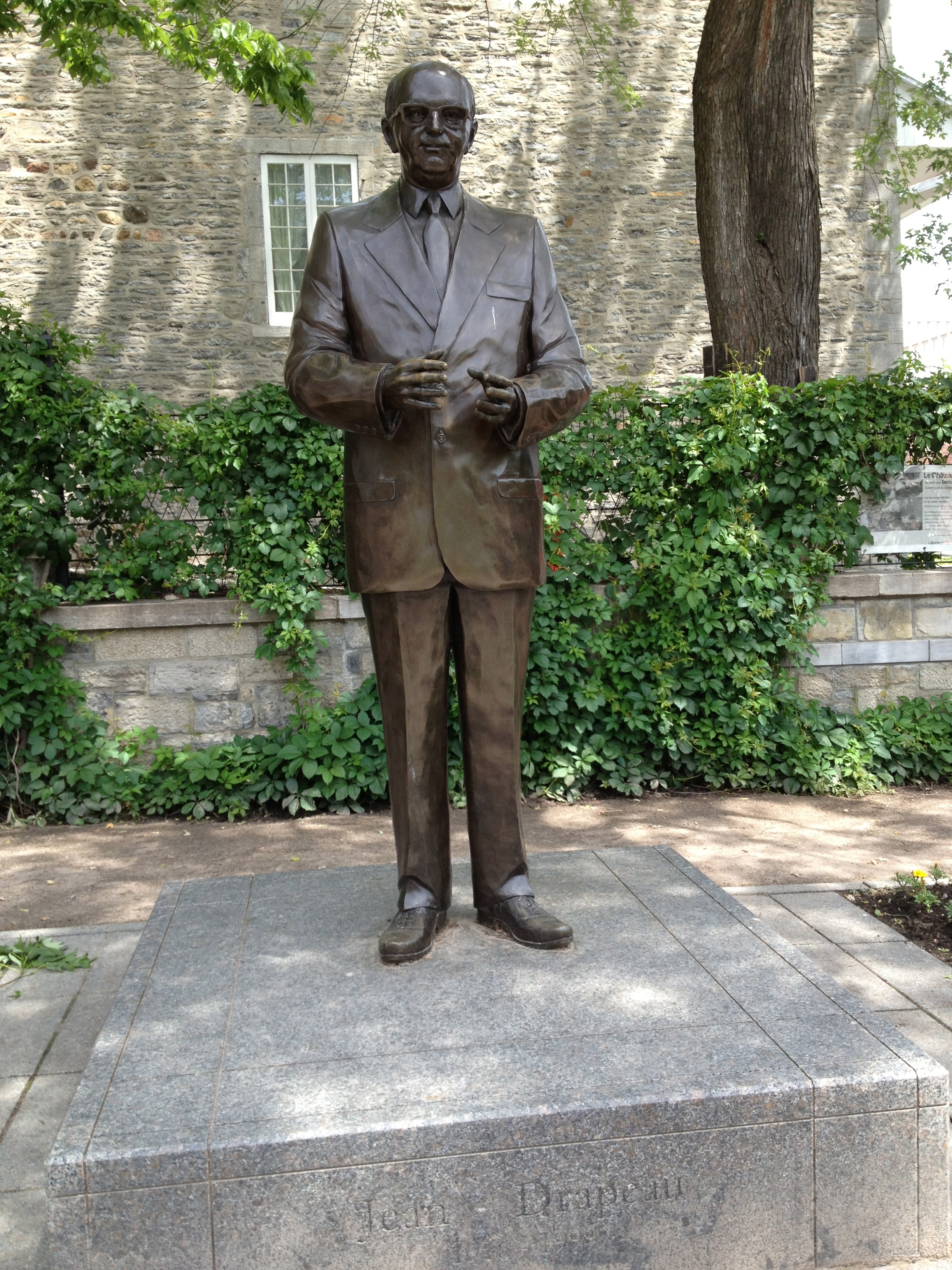 Je remonte ensuite vers la rue Notre-Dame que je vais enfiler jusque bien loin vers l’Est, atteignant presque le Pont Jacques Cartier. Sur Notre-Dame, les bâtiments anciens et modernes des Palais de Justice et de la Cour d’Appel du Québec, et avant de descendre sur la Place, l’Hôtel de Ville bien en vue, au balcon duquel le Général De Gaulle a lancé son ‘Vive le Québec libre!‘ lors de sa visite en juillet 1967. La Place Jacques Cartier vit surtout à la bonne saison, avec les terrasses des restaurants, les artistes qui s’y installent, chanteurs, musiciens, caricaturistes ou peintres. Elle plonge depuis l’hôtel de ville, et la colonne de Nelson – financée par les marchands britanniques pour commémorer la victoire de la flotte de l’amiral Nelson à Trafalgar – vers le quai Jacques Cartier et le fleuve. Sur un côté, la petite Place de la Dauvesière, attenante au Château Ramezay – qui sera lui aussi pour une prochaine visite – attire le regard autour de la statue de bronze de Jean Drapeau. Cet homme, maire de Montréal durant de nombreuses années entre 1954 et 1986 sera l’initiateur de grands projets pour la ville.