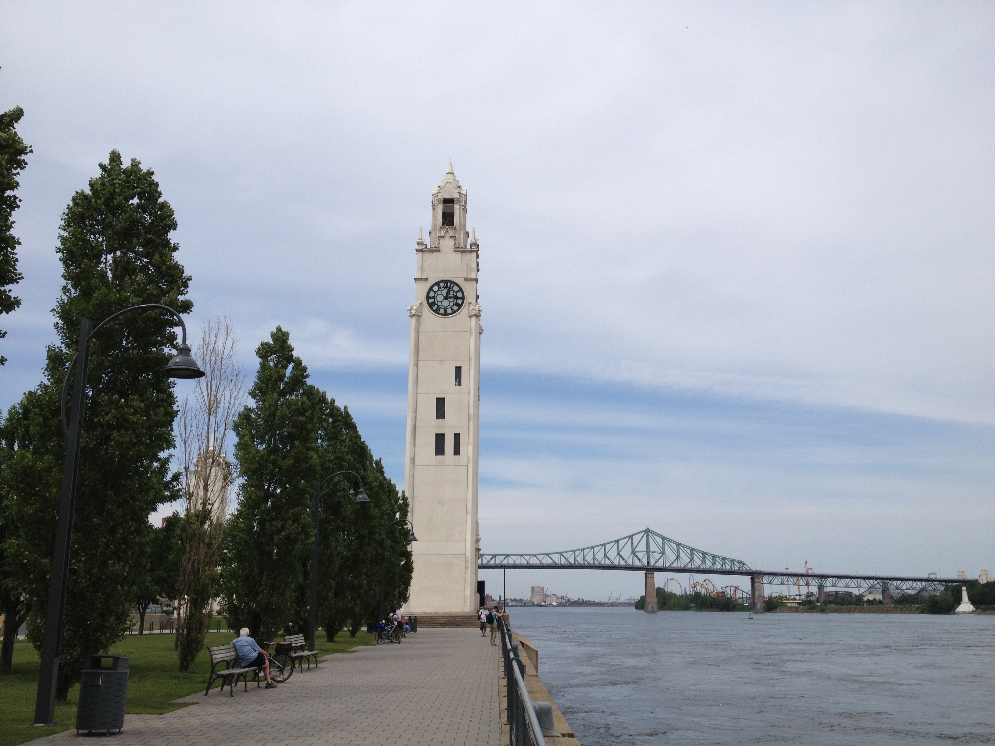 Autrefois les pêcheurs et les agriculteurs arrivaient ici par bateau au Quai Victoria pour aller vendre leurs marchandises dans les marchés publics; il fut renommé Quai de l’Horloge depuis qu’en 1922 cette tour fut construite pour rendre mémoire aux marins de la marine marchande morts durant la première guerre mondiale – elle sert aussi de phare alors aux navires entrant dans le port. Elle ressemble à un petit Big Ben avec ses faces couvertes d’horloges et les quelques deux cents marches nous montent à cinquante mètres du niveau de la mer, offrant de l’observatoire une vue sur le fleuve, ses îles et ses ponts et sur le Vieux Montréal. Au pied, une plage urbaine a été créée, comme c’est la mode en Europe aussi, avec du sable fin, des transats et des parasols, des brumisateurs mais pas de possibilité de se baigner – c’est désert à cette saison, en semaine en tout cas. Ce long parcours m’a plongée dans l’histoire de la ville, fort intéressante et c’est une pause bien agréable que me propose Martine, sur sa terrasse, avant que je rentre préparer un bon repas.