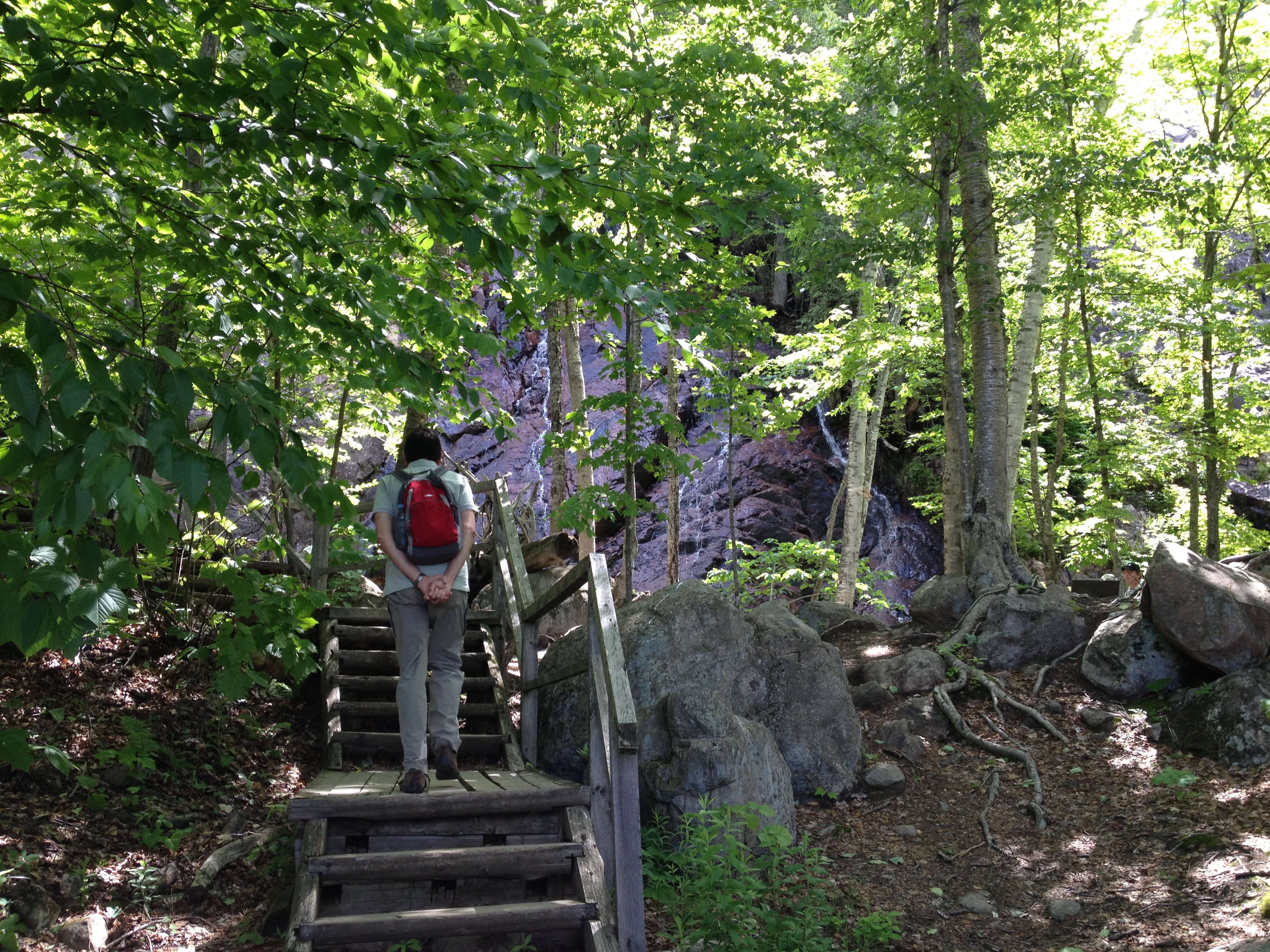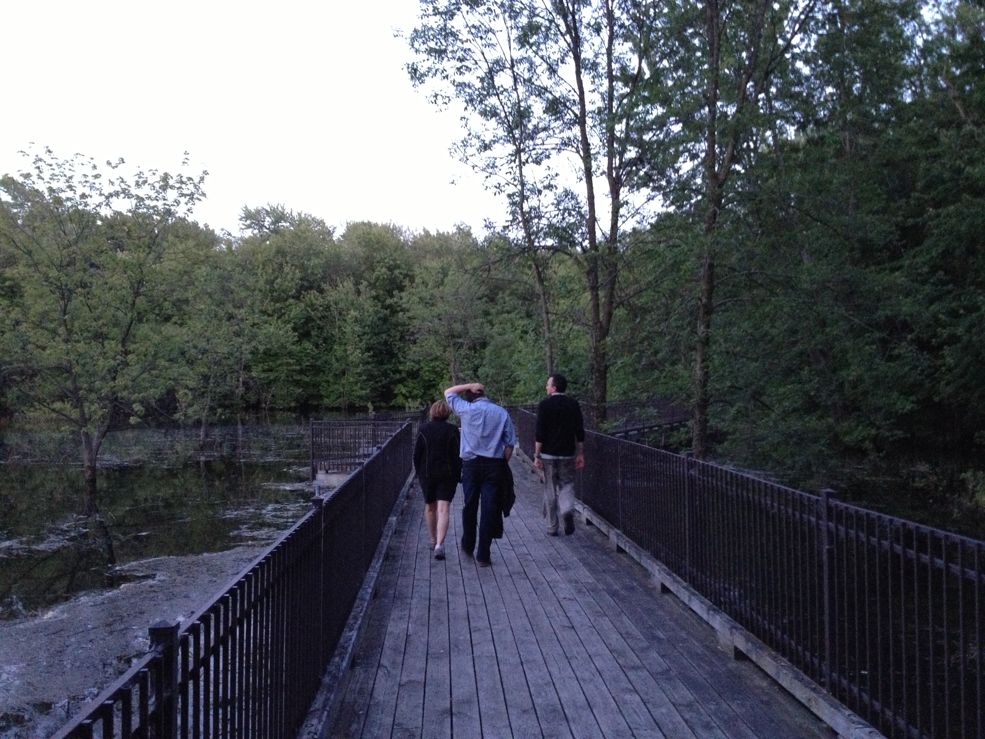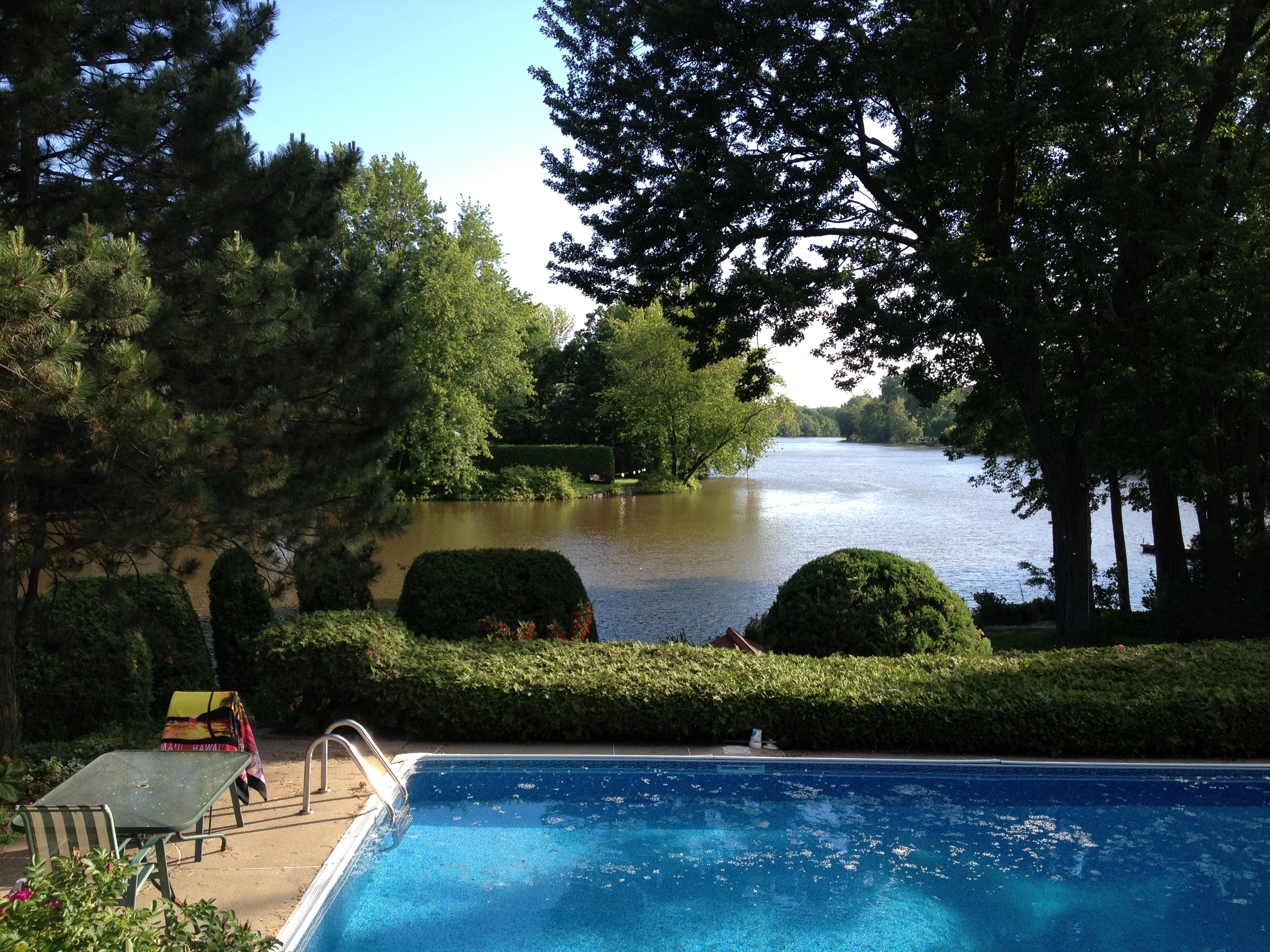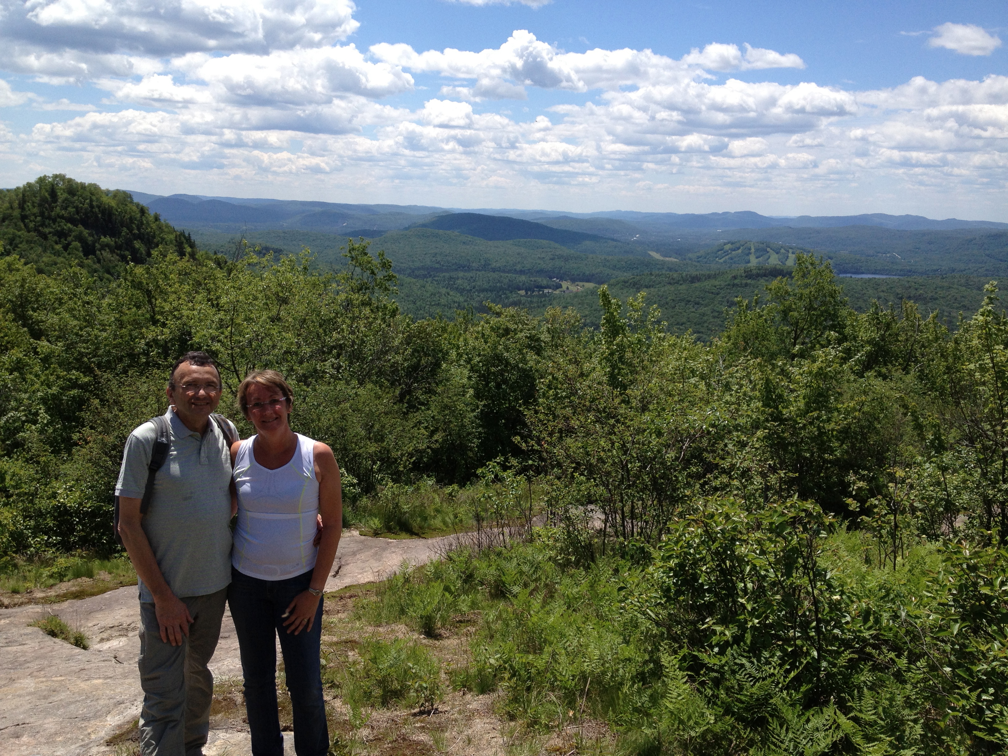 Autrefois les pêcheurs et les agriculteurs arrivaient ici par bateau au Quai Victoria pour aller vendre leurs marchandises dans les marchés publics; il fut renommé Quai de l’Horloge depuis qu’en 1922 cette tour fut construite pour rendre mémoire aux marins de la marine marchande morts durant la première guerre mondiale – elle sert aussi de phare alors aux navires entrant dans le port. Elle ressemble à un petit Big Ben avec ses faces couvertes d’horloges et les quelques deux cents marches nous montent à cinquante mètres du niveau de la mer, offrant de l’observatoire une vue sur le fleuve, ses îles et ses ponts et sur le Vieux Montréal. Au pied, une plage urbaine a été créée, comme c’est la mode en Europe aussi, avec du sable fin, des transats et des parasols, des brumisateurs mais pas de possibilité de se baigner – c’est désert à cette saison, en semaine en tout cas. Ce long parcours m’a plongée dans l’histoire de la ville, fort intéressante et c’est une pause bien agréable que me propose Martine, sur sa terrasse, avant que je rentre préparer un bon repas.