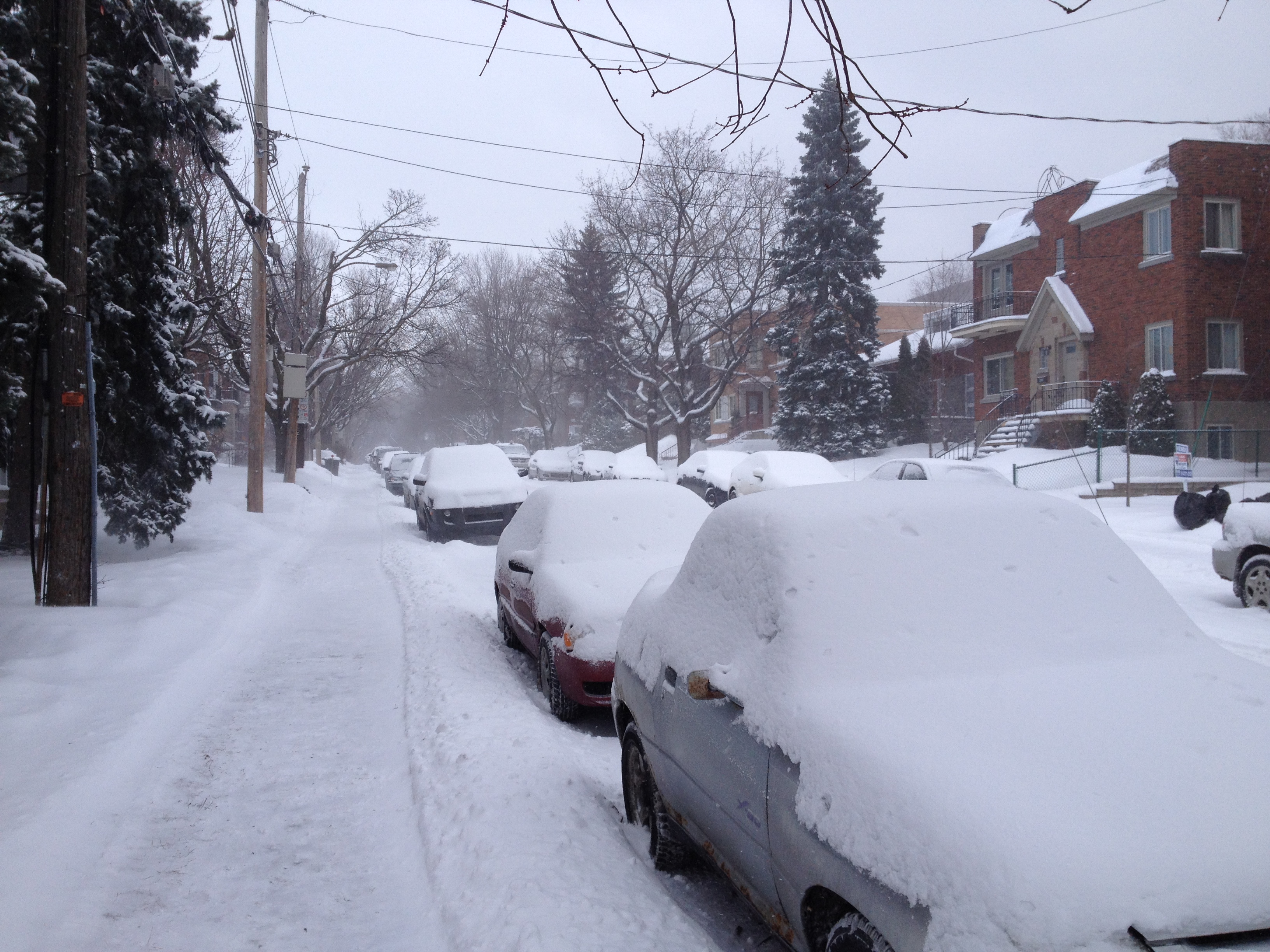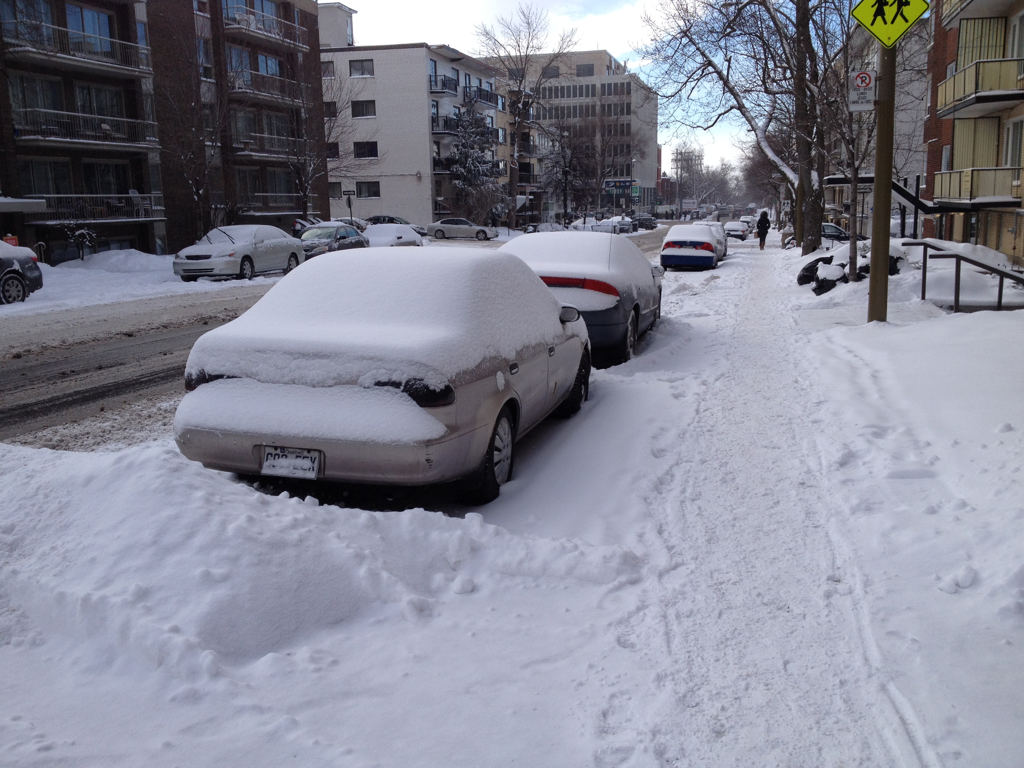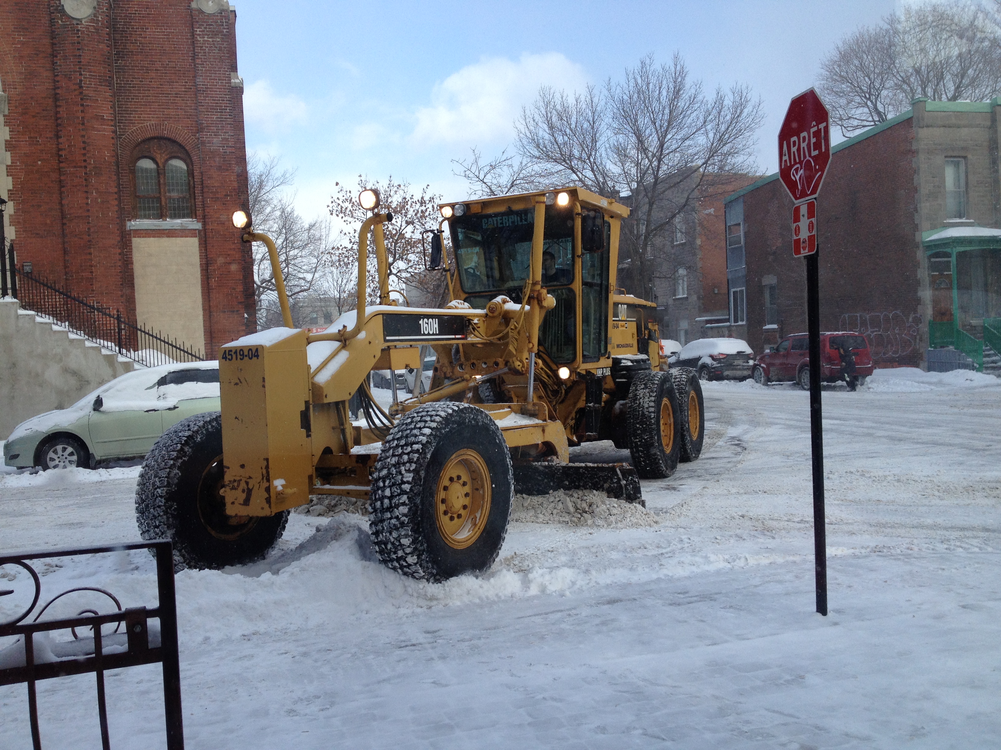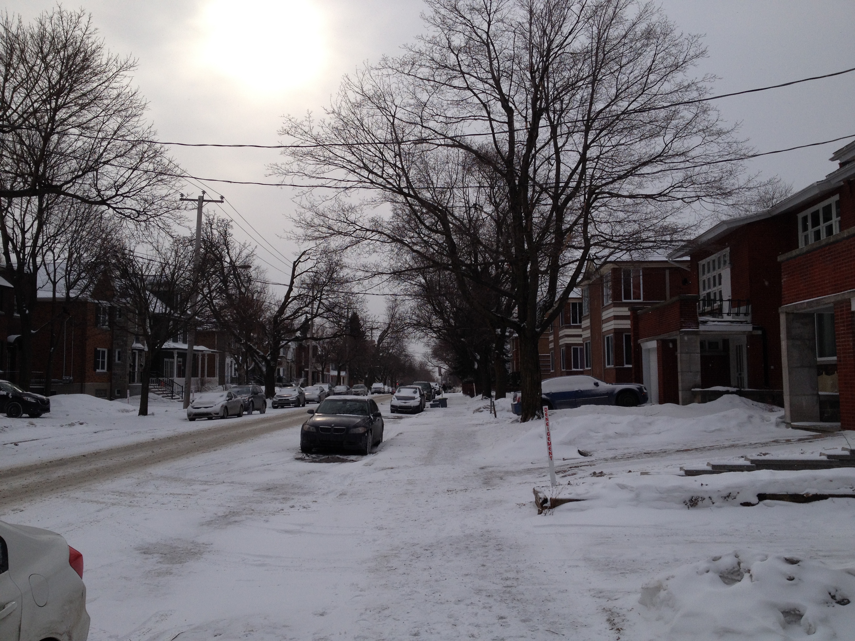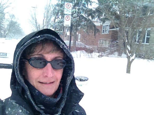 Nous avons eu la chance de ne pas connaître le verglas, la neige est partout évidemment mais les sols ne sont pas glissants avec de bonnes bottes. Les chasse-neige ont tourné beaucoup lundi, notre seul jour de chutes de neige ; les engins sont variés, du plus petit qui passe et déblaie les trottoirs aux monstres qui dégagent les rues en un seul passage – impressionnantes machines-tracteurs. Tant pis pour les voitures garées le long des avenues, elle sont parfois bien bloquées par des murets de neige ; certaines font appel à des dépanneuses d’ailleurs. Je serais bien heureuse sans voiture en hiver : commencer par la balayer toute entière, laisser tourner le moteur pour la chauffer, dégager la neige qui empêche d’ouvrir les portières, passer outre les amas boueux-neigeux et de plus elles sont toutes sales, vraiment sales, comme tous les véhicules – tant dehors que dedans, on ne voit rien au travers des vitres. J’ai quand même bien apprécié l’Audi de Martine et Alain, surtout quand j’étais assise devant, sur le siège qui chauffait ! Les canadiens ont inventé une sorte de garage extérieur en plastic blanc, un peu comme une tente, qui permet de ne pas devoir balayer la neige ; ce n’est guère esthétique, toutefois je peux comprendre – tout est bon pour s’épargner un peu d’énergie.