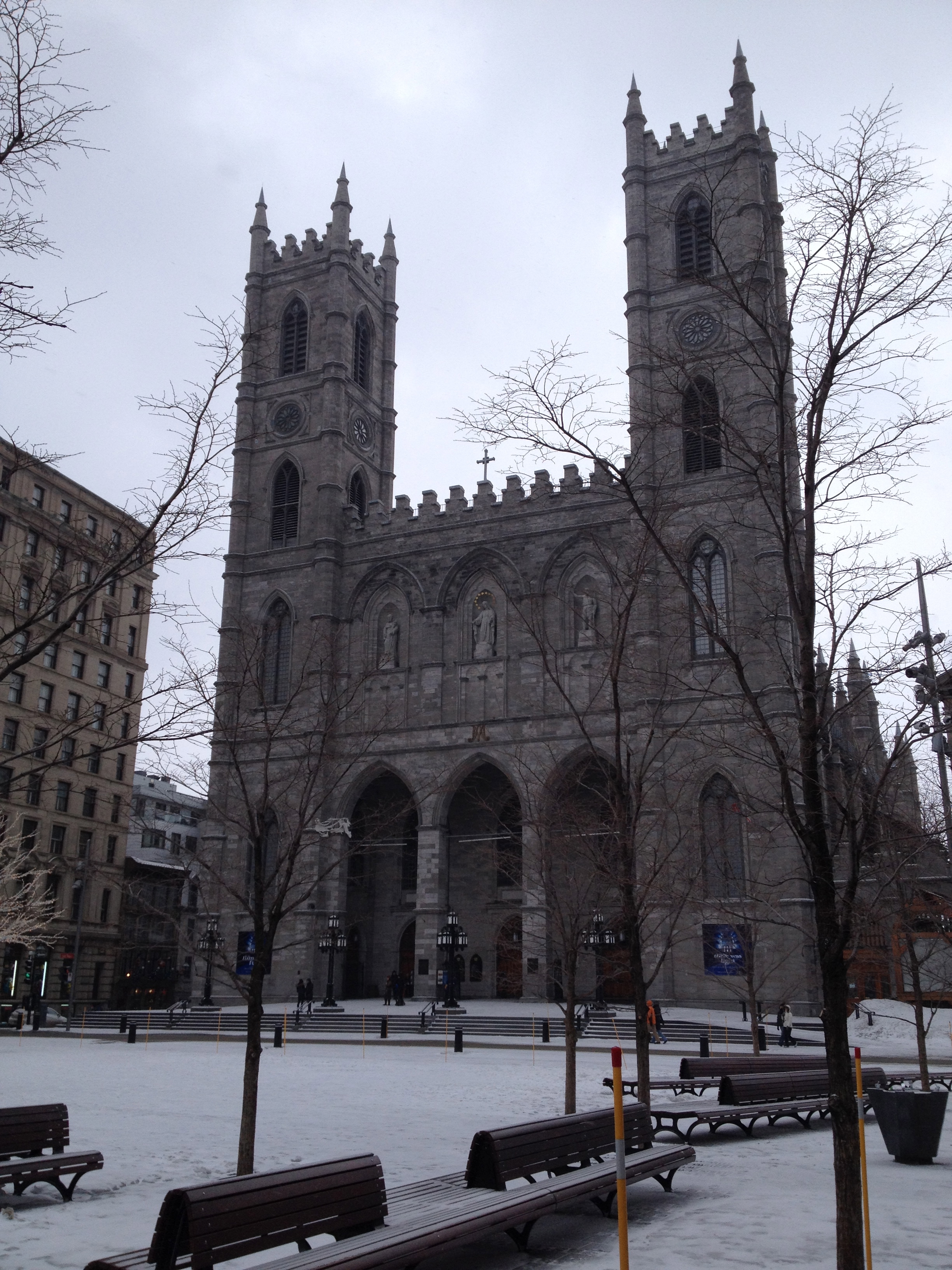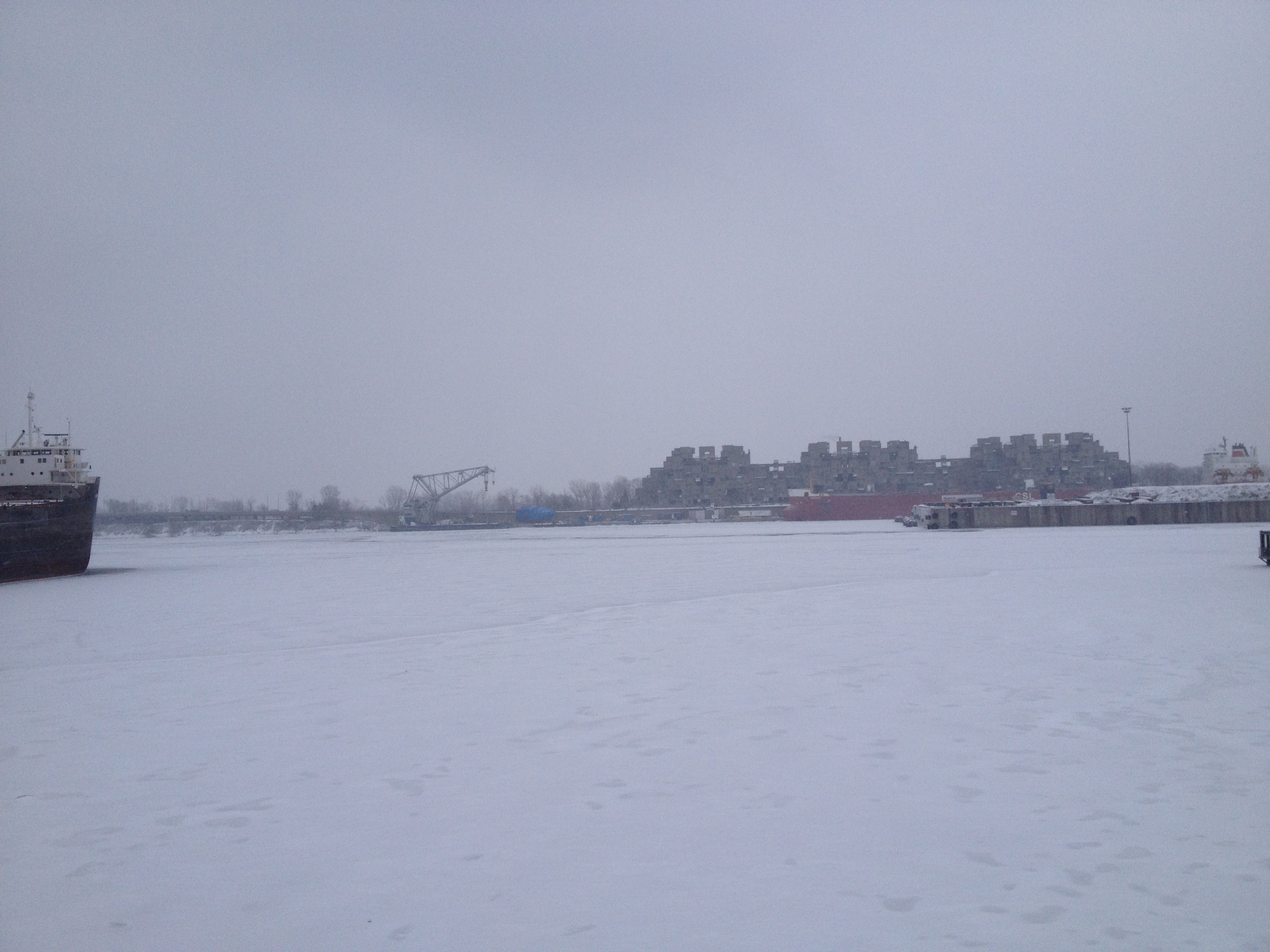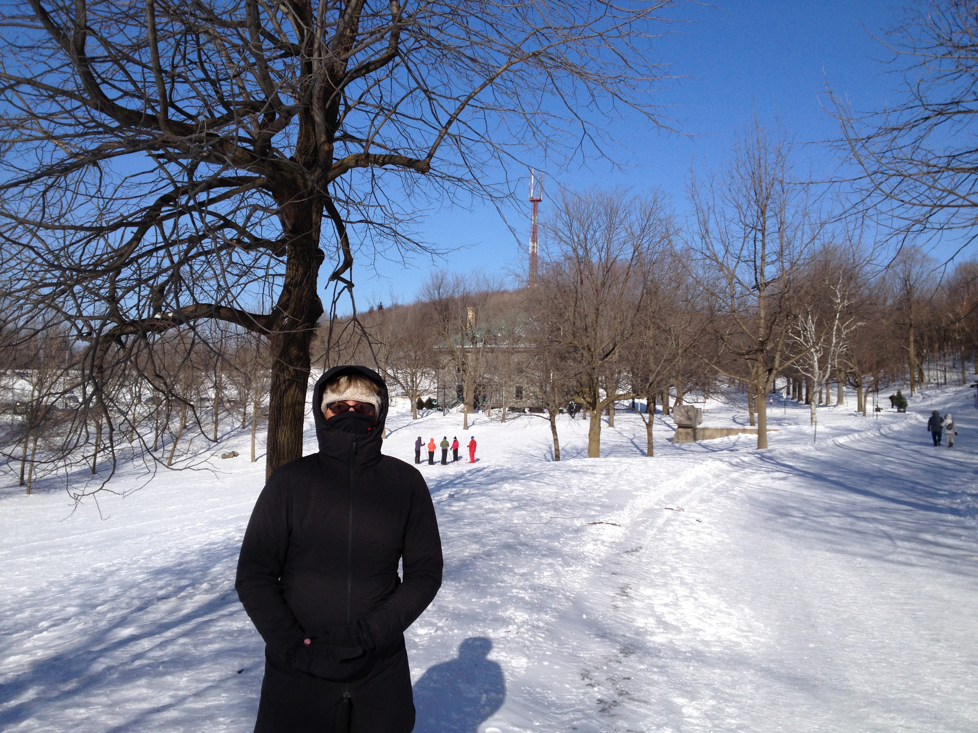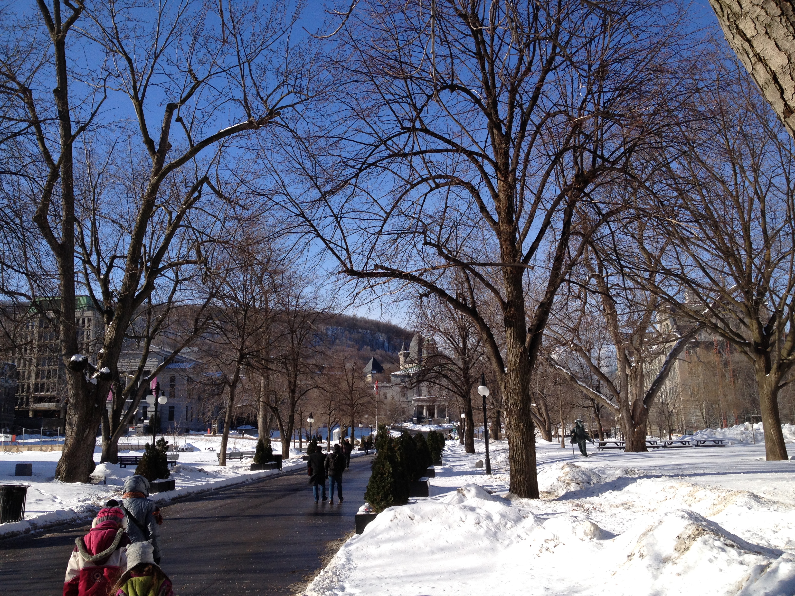 Nous sommes montés jusqu’au point-de-vue sur la ville, une esplanade aux prises avec des vents tournoyants et qui nous a montré au loin, le Saint-Laurent bien gelé. Inutile de s’attarder, nous rentrons par les cimetières – eh oui, c’est ici une promenade fréquente – le boulevard Mont-Royal et enfin Edouard-Montpetit. Cette marche rapide de deux bonnes heures était très vivifiante et suffisante ! J’aurais vite pitié de ces jolis écureuils aperçus dans les bois ; ceux qui crapahutaient sur l’arbre devant ma fenêtre en été ont dû eux se réfugier ailleurs.